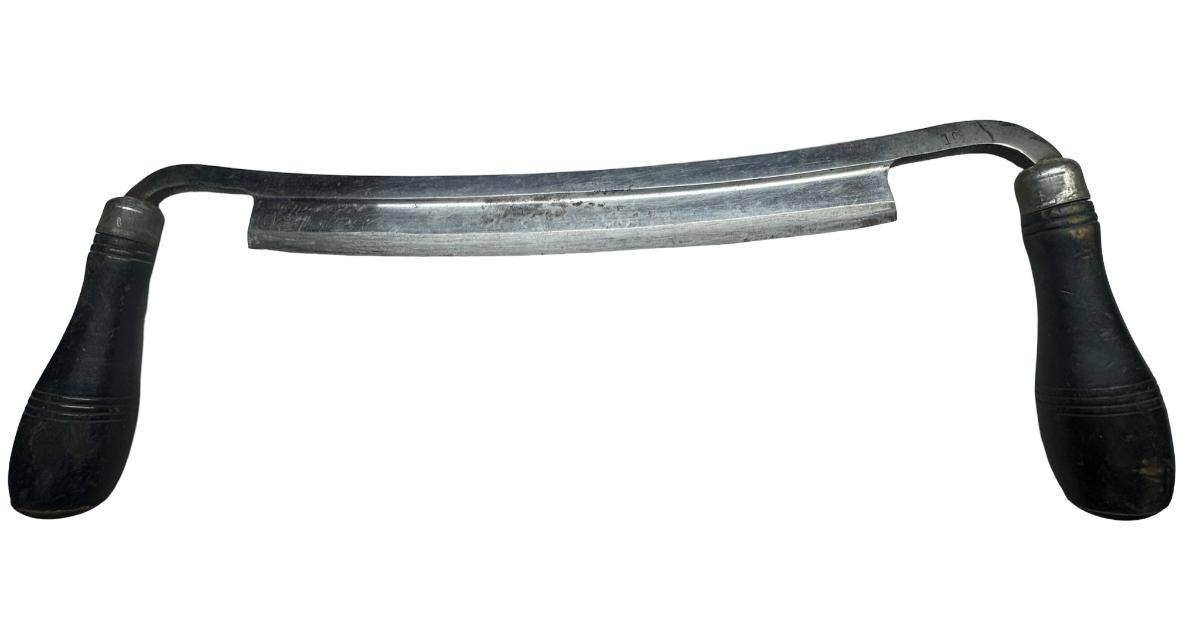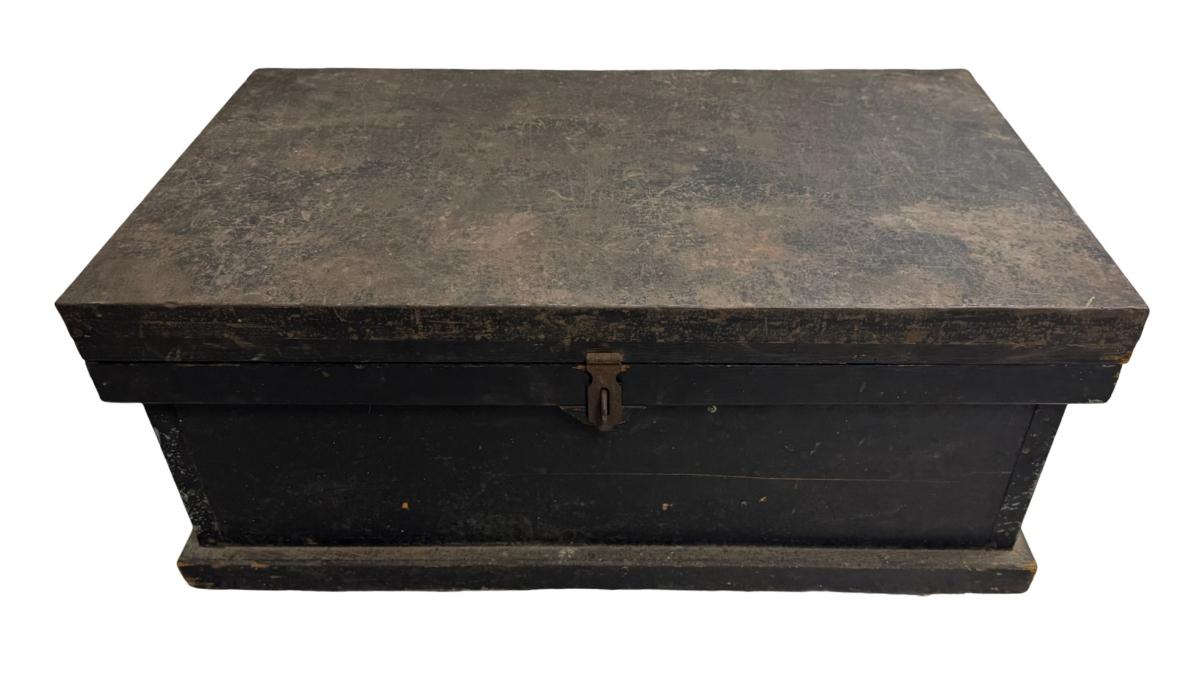 This is a wood chest with a tin top on casters. Contents include saws, chisels, levels, blow torch, draw knife, Stanley plane, and more. Measurement: 33.5”W x 19.5”D x 16”H. [JL]
