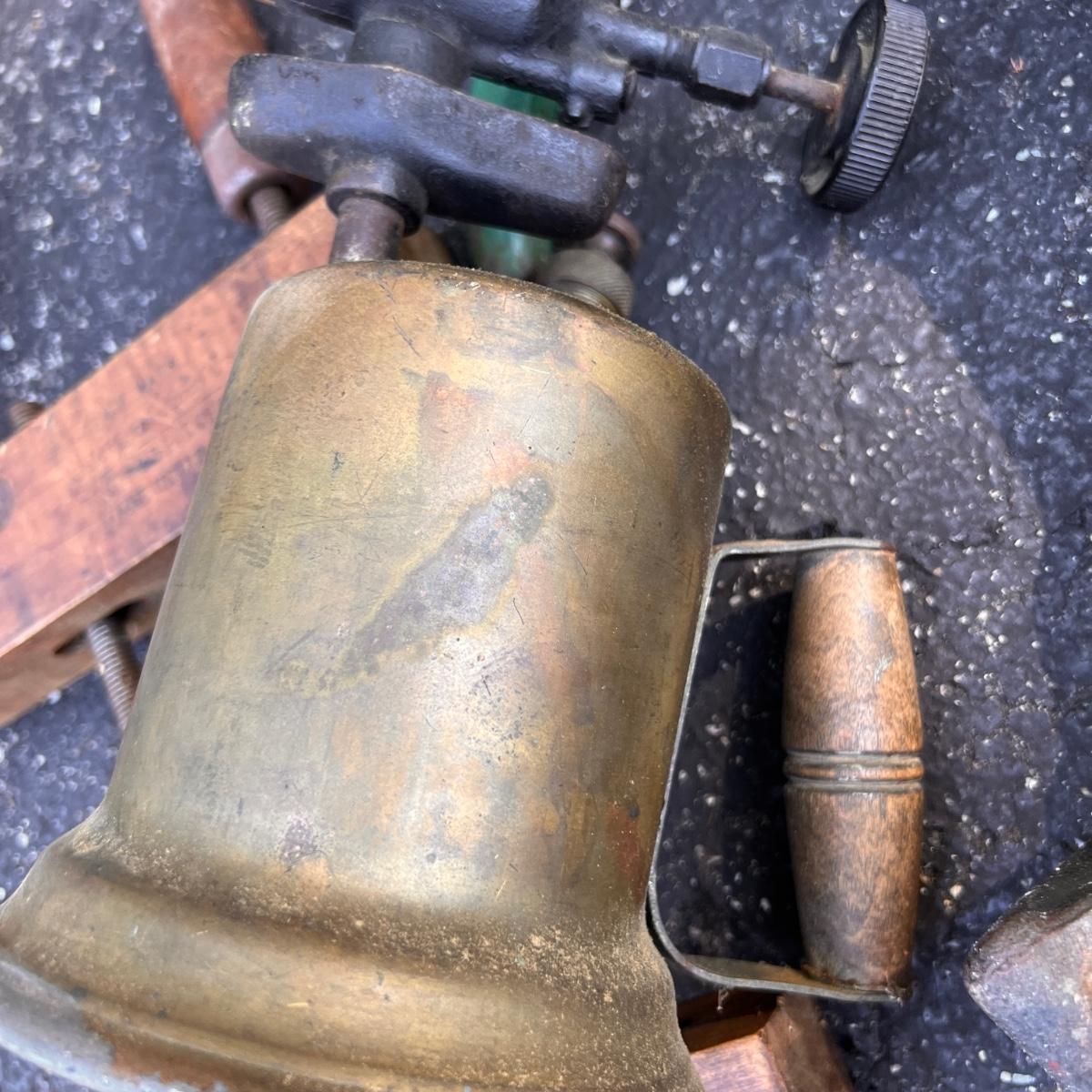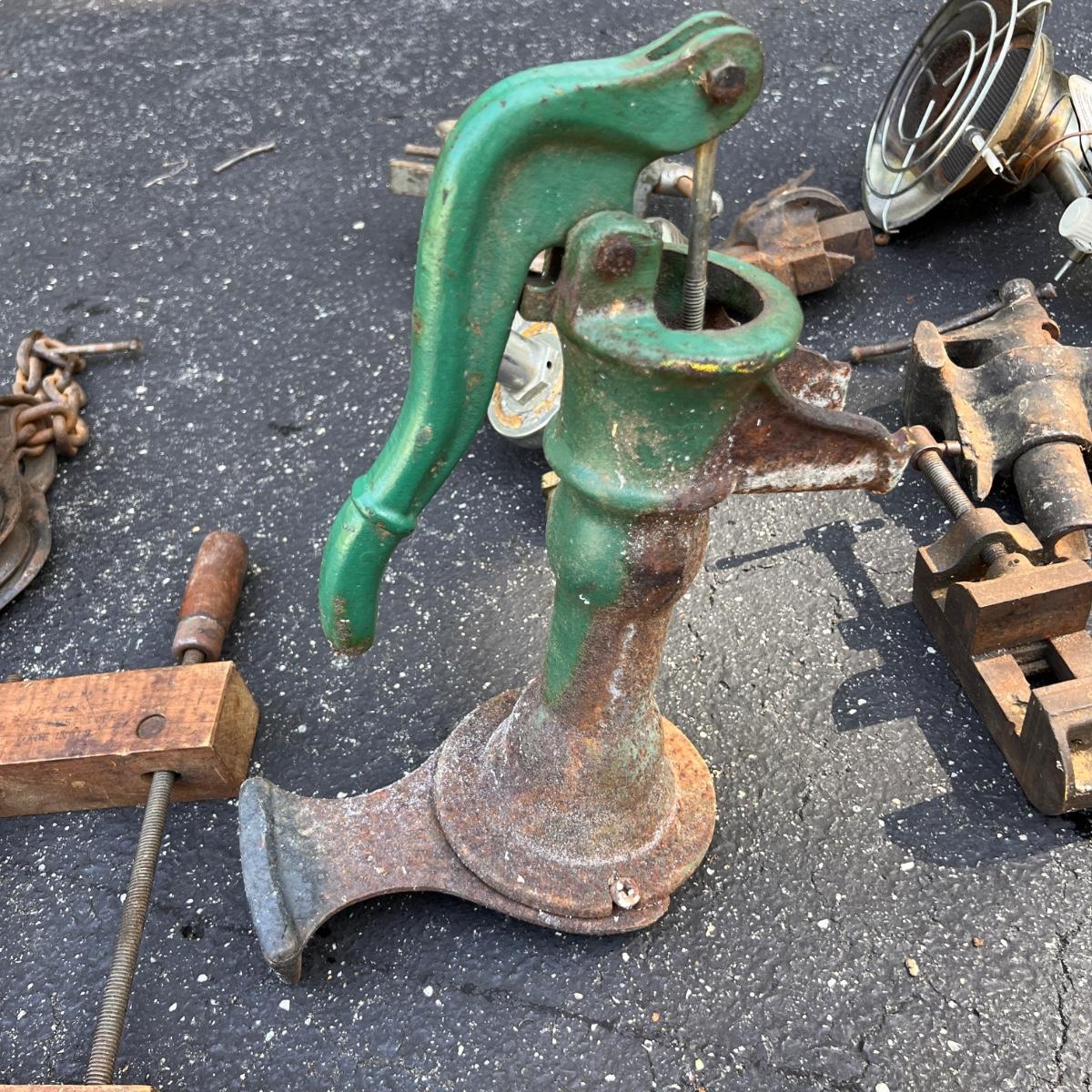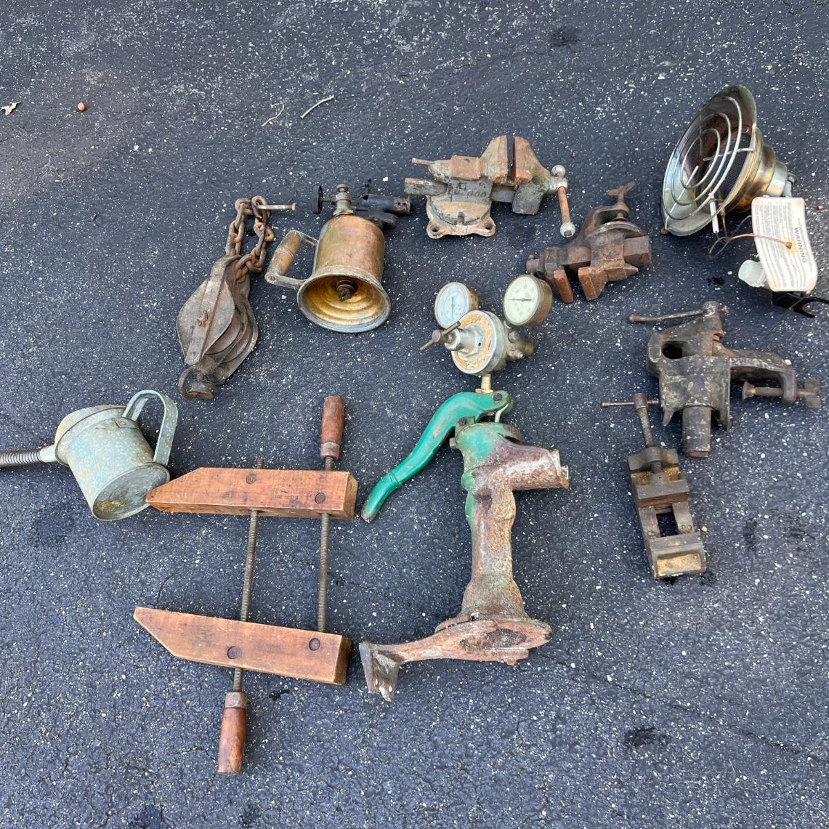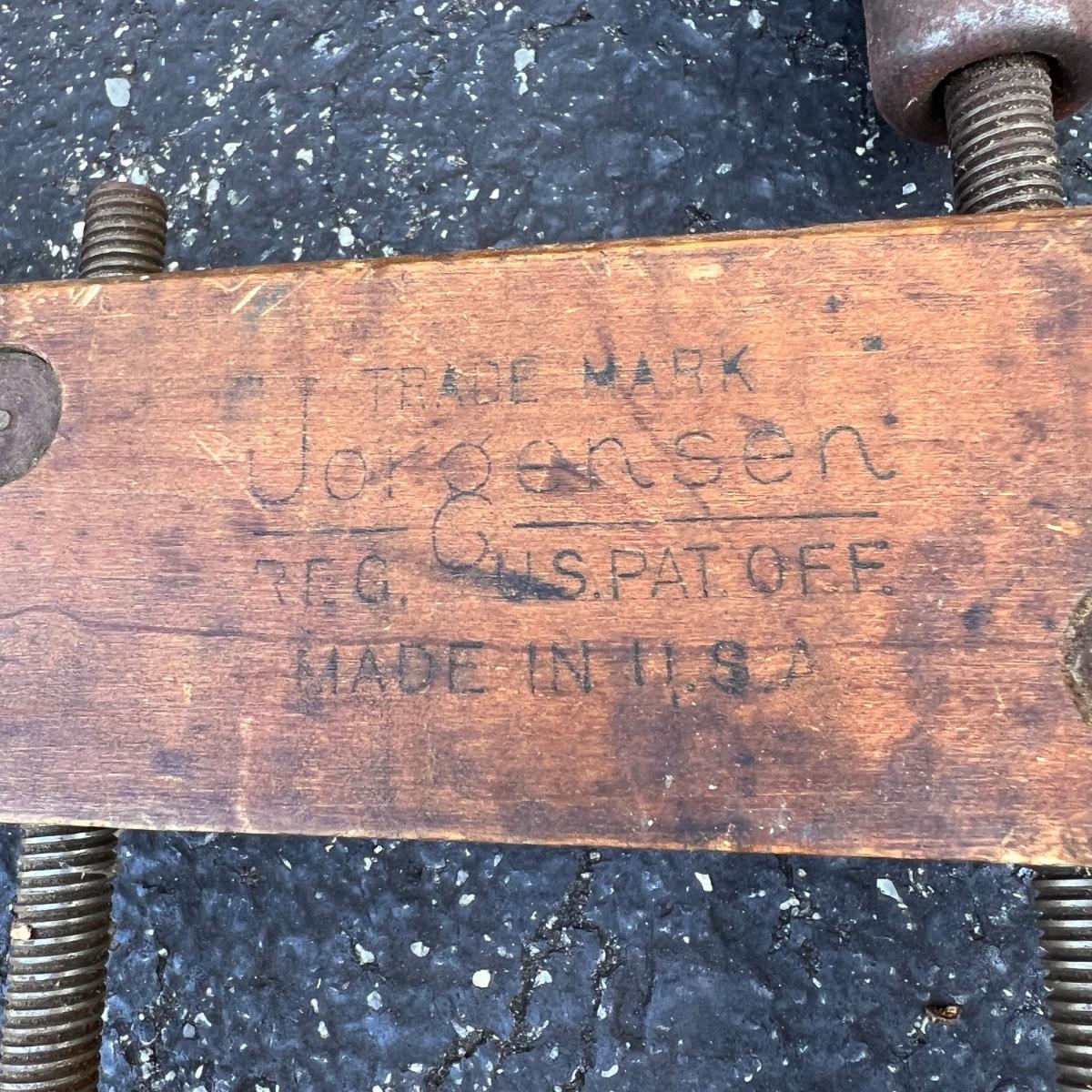 Antique wood handle Jorgensen Adjustable Clamp | Wooden Vise Clamp, antique Vintage cast iron hand water pump, brass hand torch, VICTOR inert gas regulator flowmeter, vices, and more. These have been stored in a shed. See pics for details and conditions.