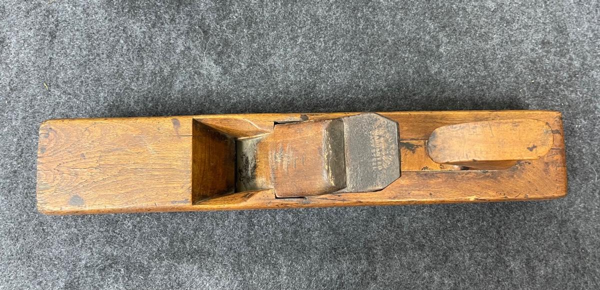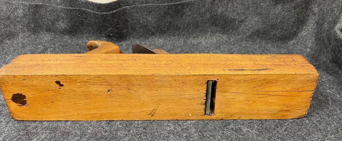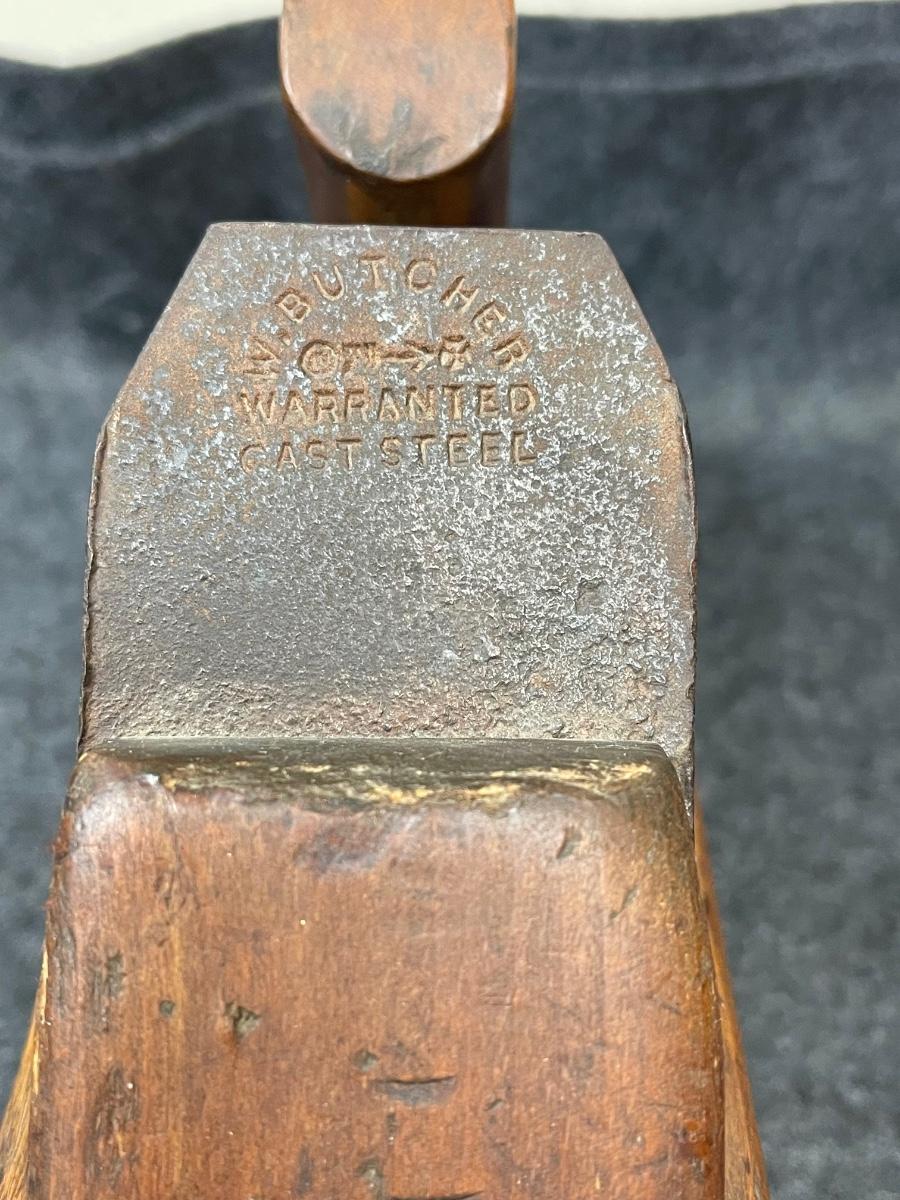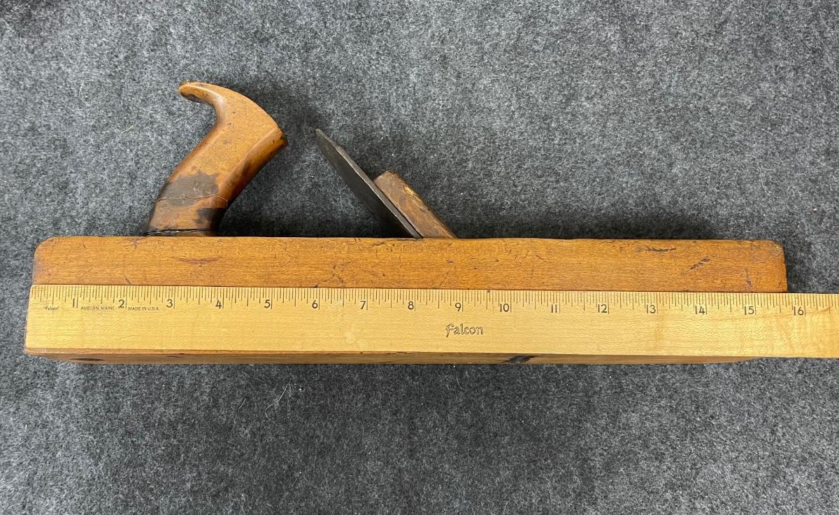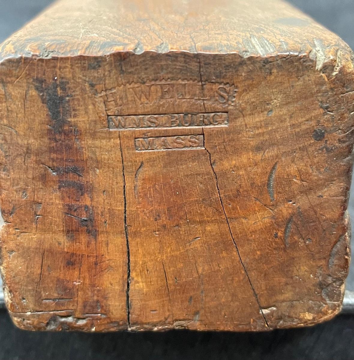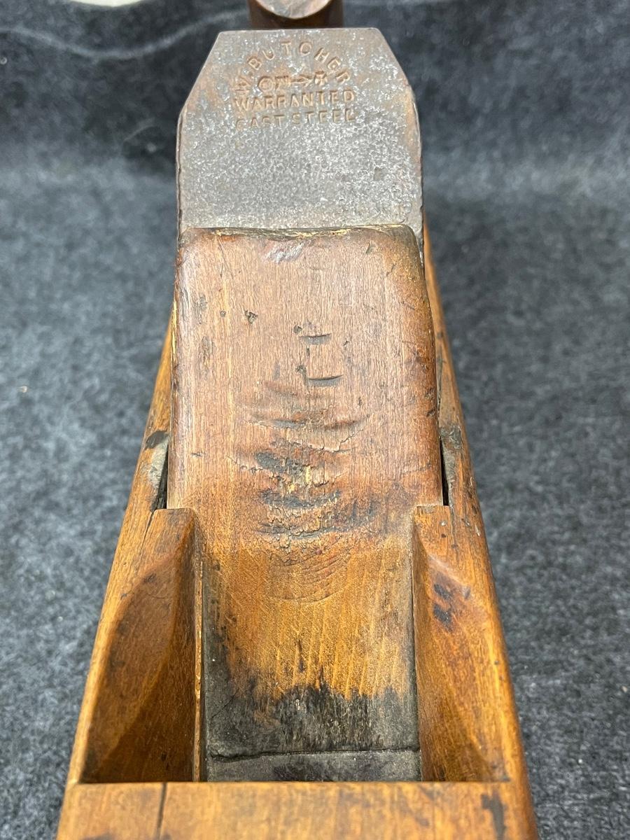 Wooden, single-blade Jack plane. Has been repaired. Inscription: “W. Butcher” and “Warranted Cast Steel” on blade and “AJB” and “H. Wells Williamsburg MASS” stamped into wood. Dimensions: 16” length and 2” iron.