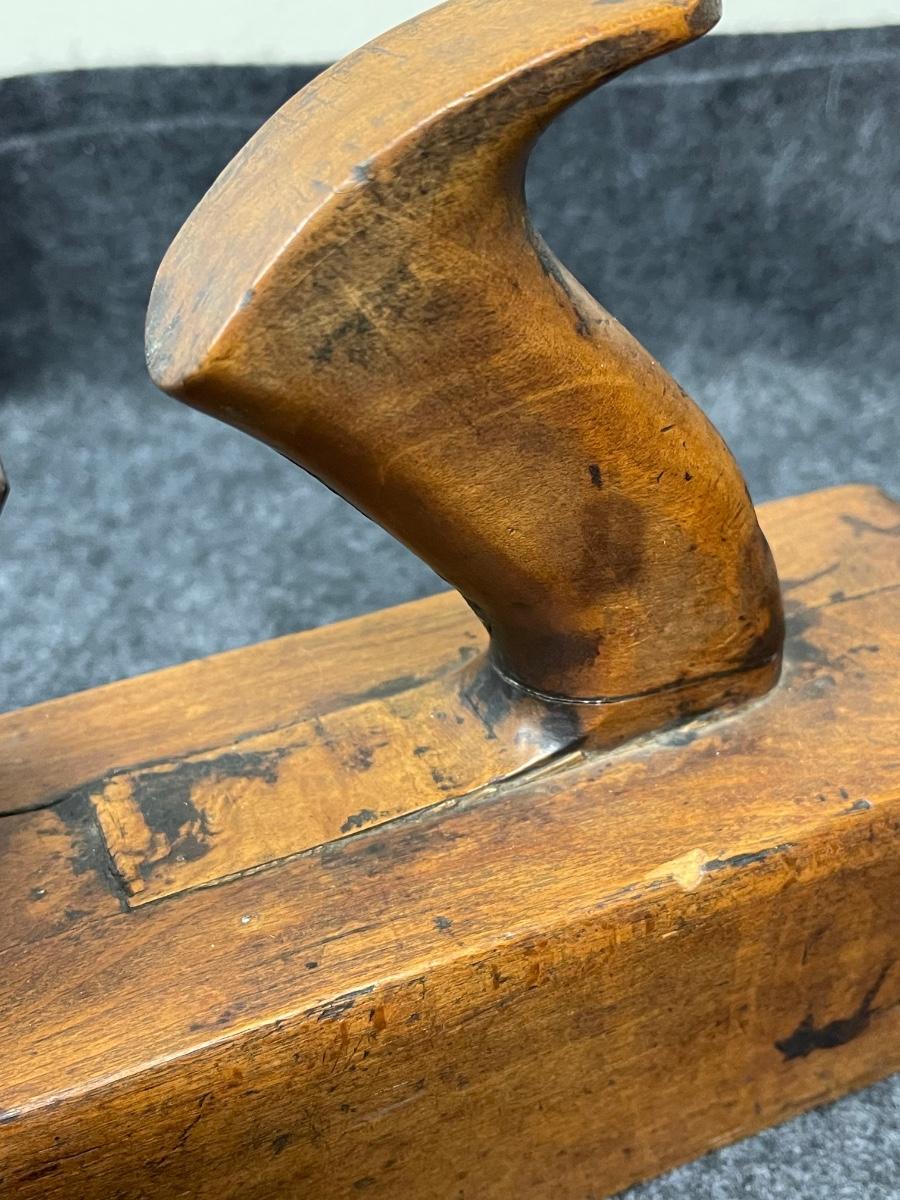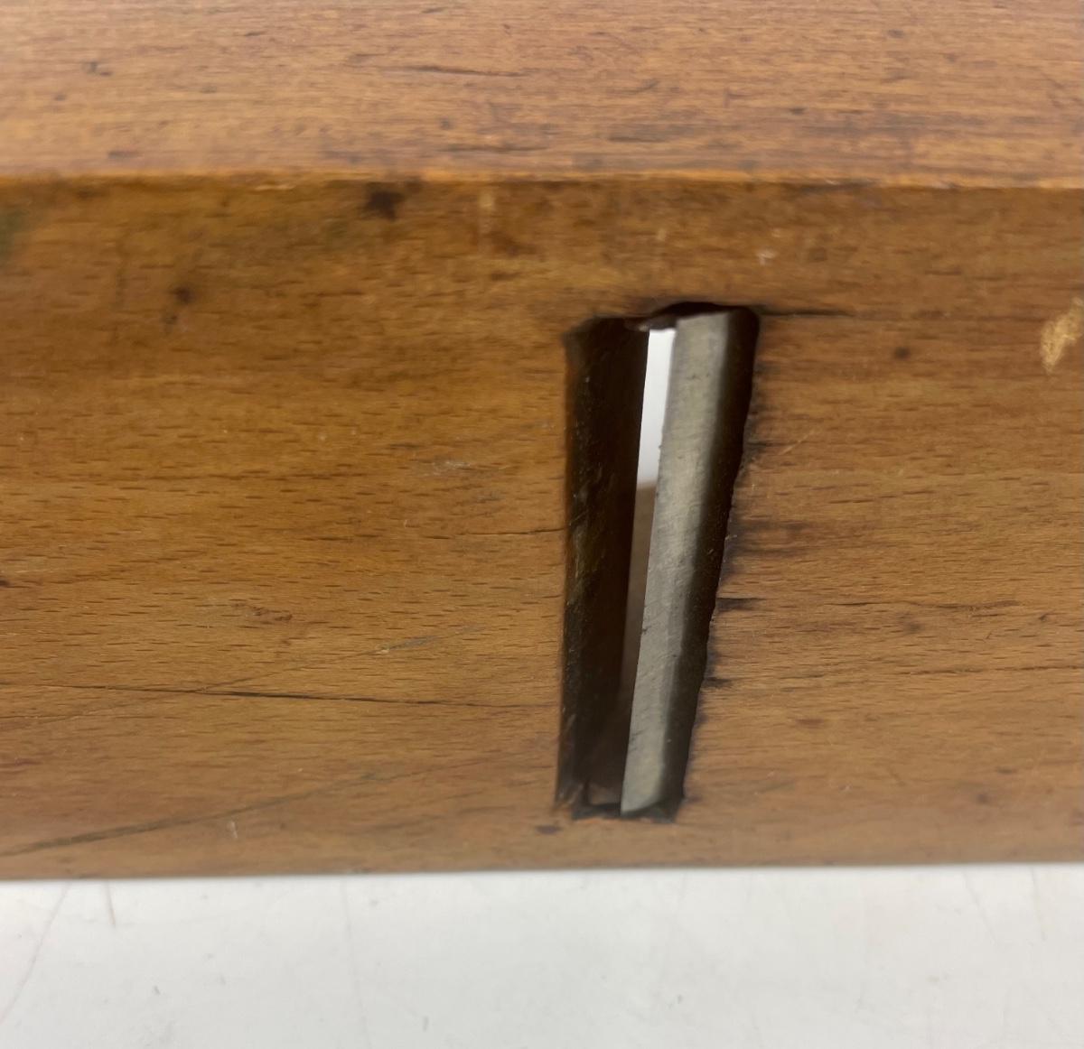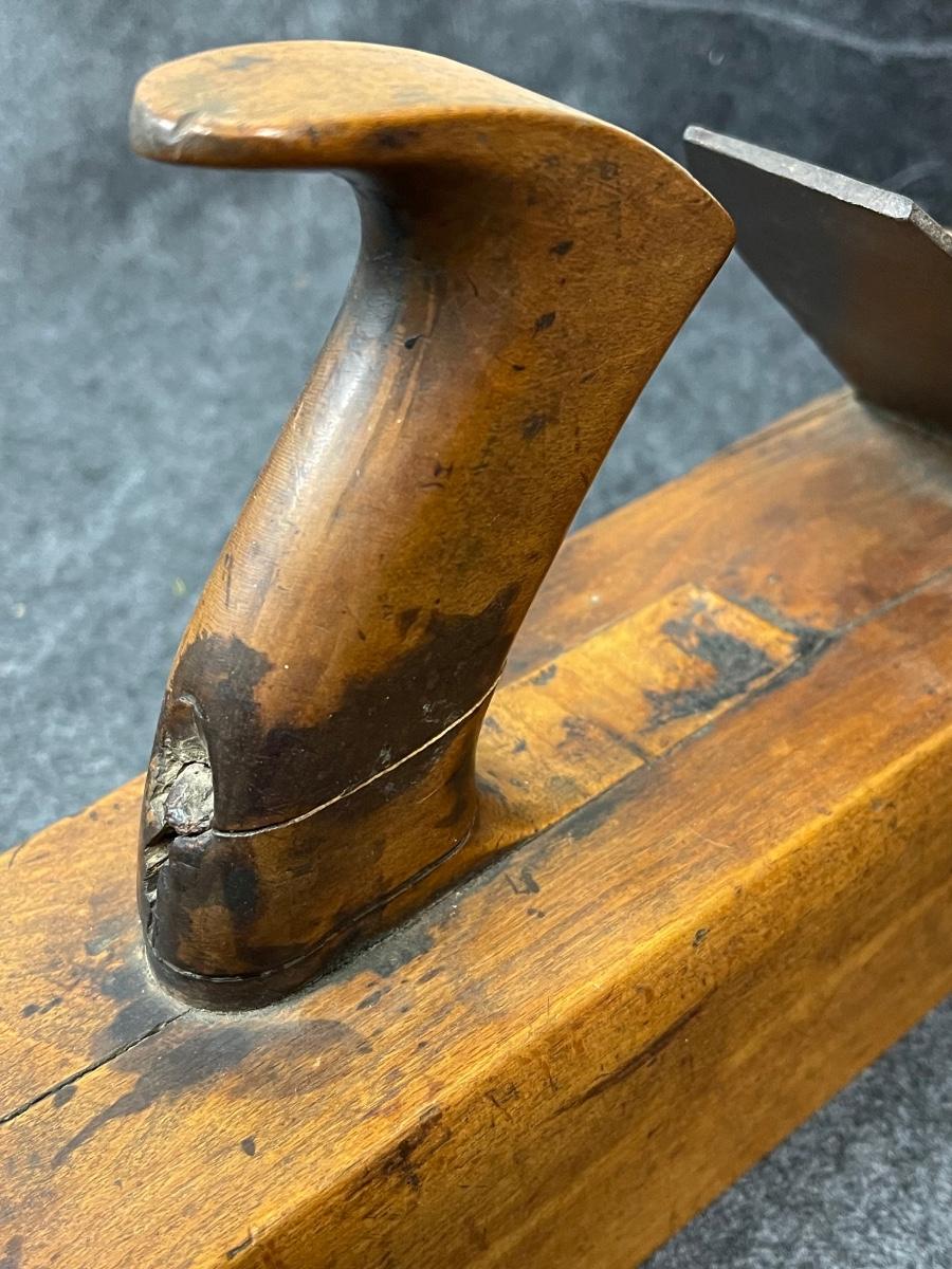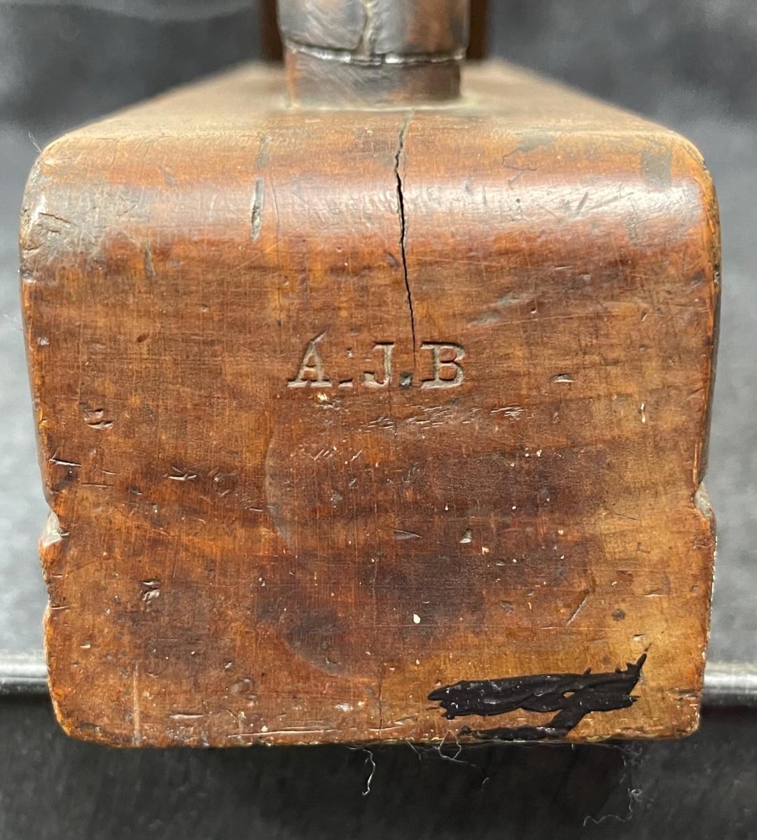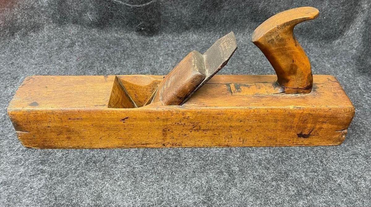 Wooden, single-blade Jack plane. Has been repaired. Inscription: “W. Butcher” and “Warranted Cast Steel” on blade and “AJB” and “H. Wells Williamsburg MASS” stamped into wood. Dimensions: 16” length and 2” iron.