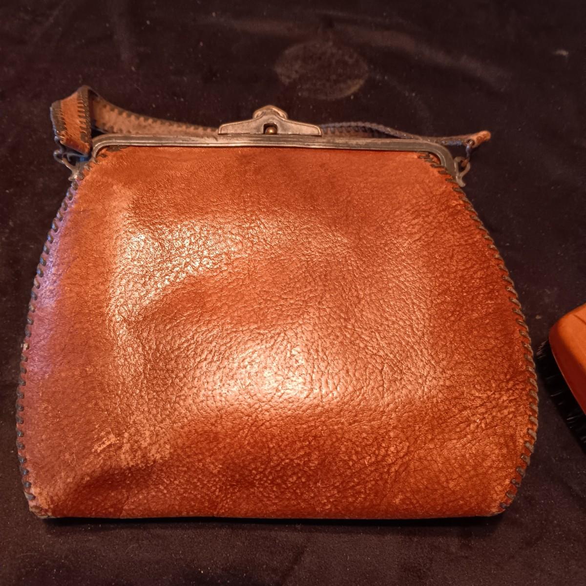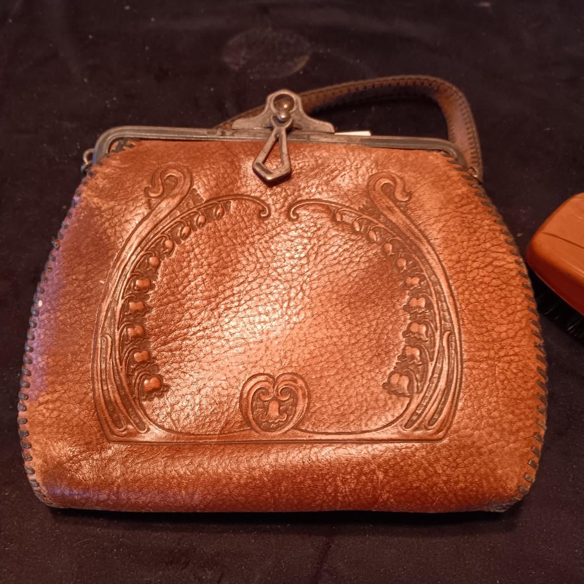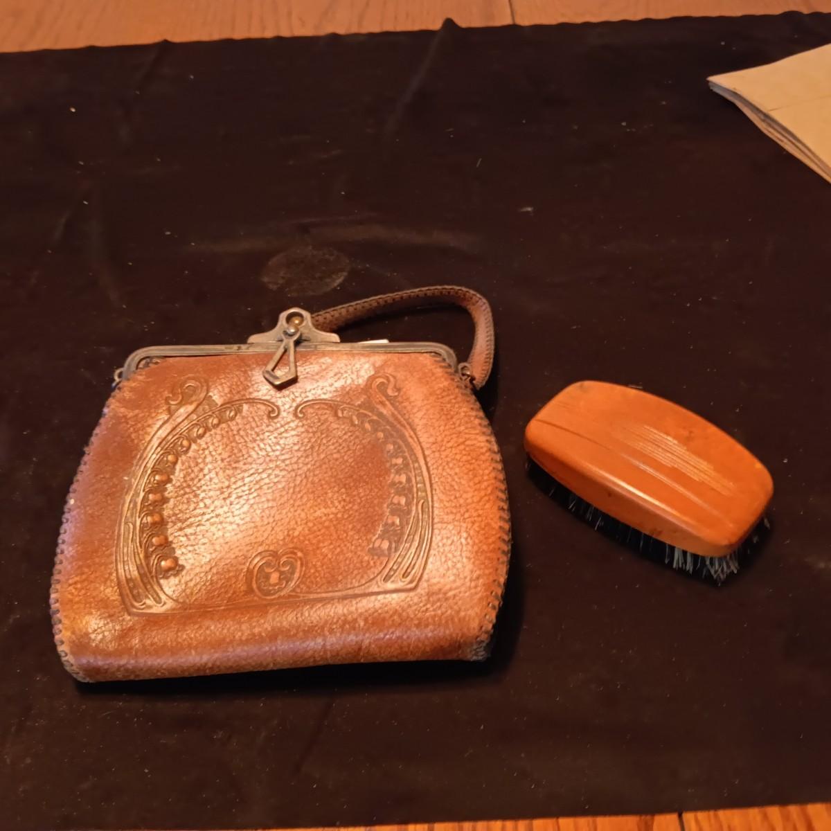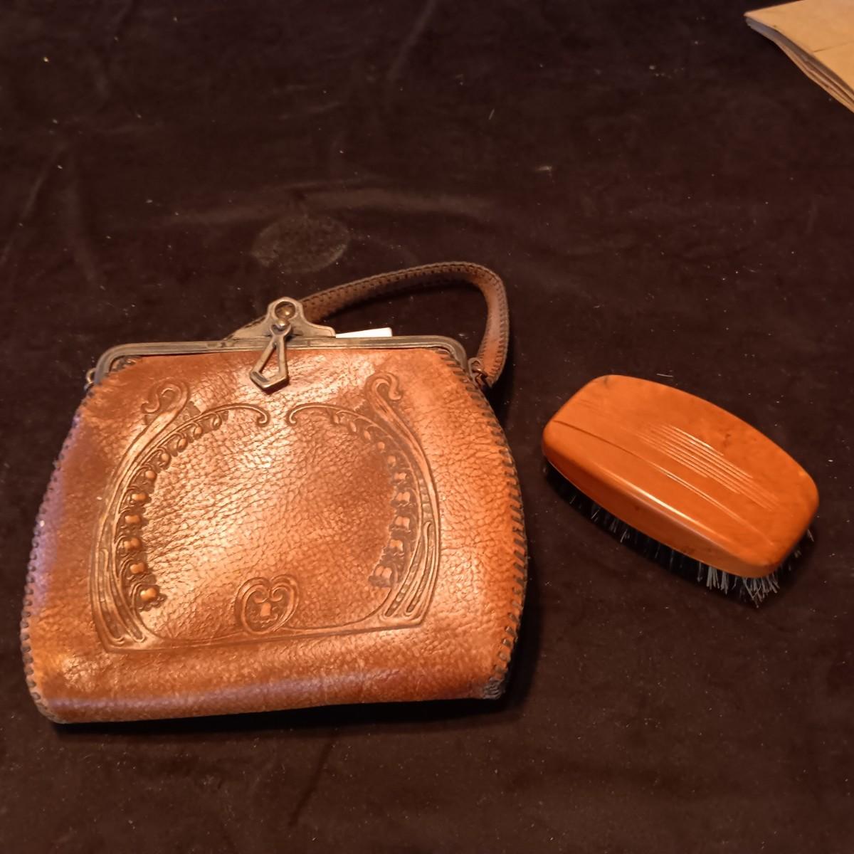 ANTIQUE TOOLED LEATHER PURSE AND A BAKELITE BRUSH