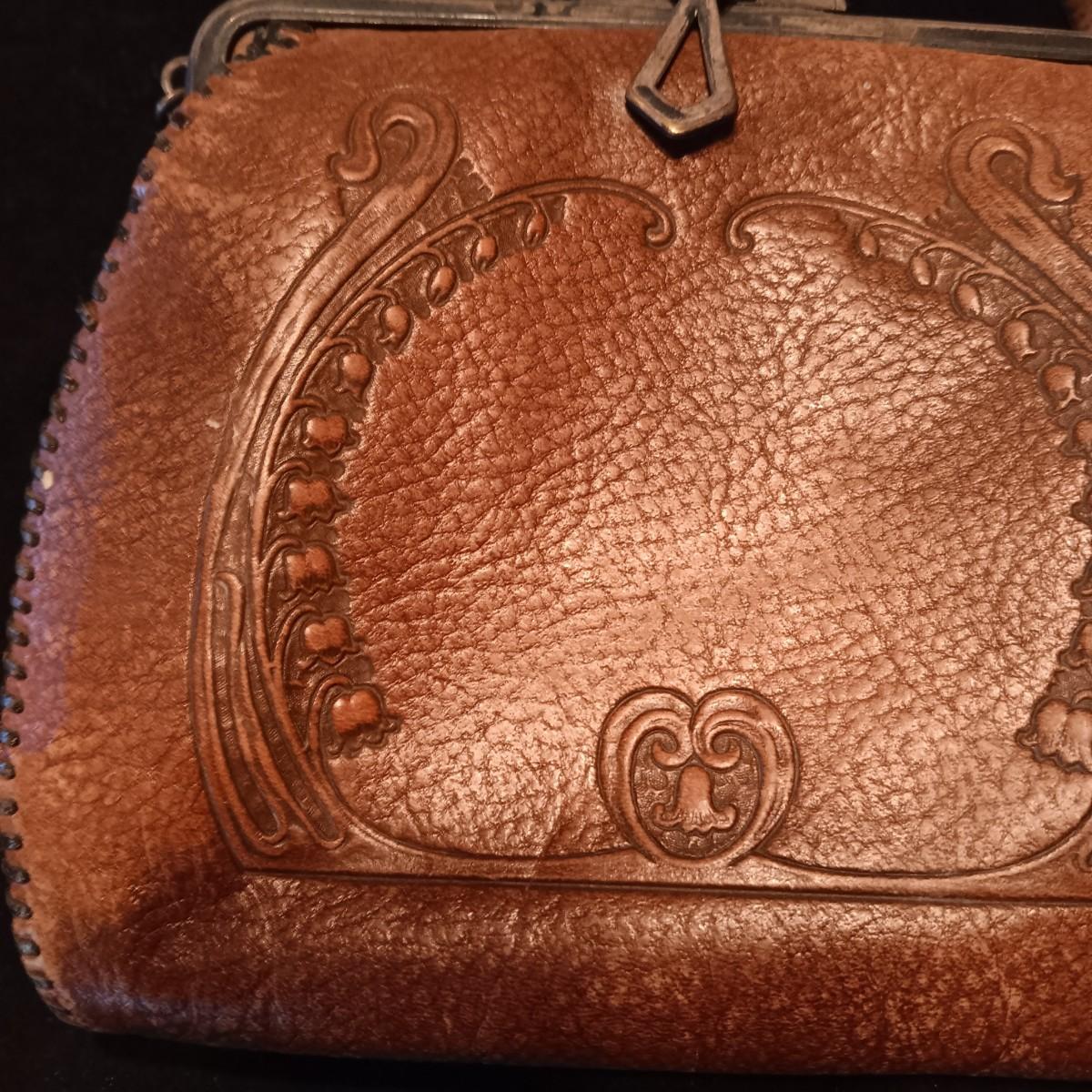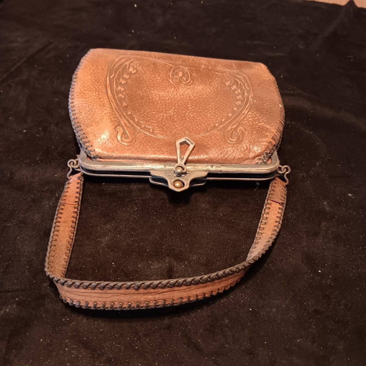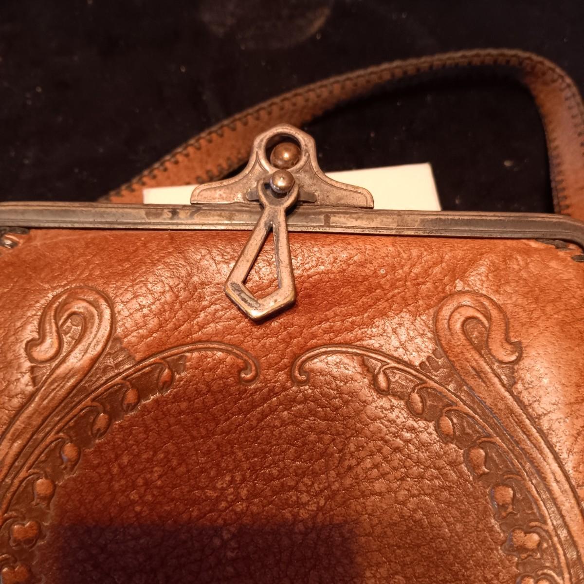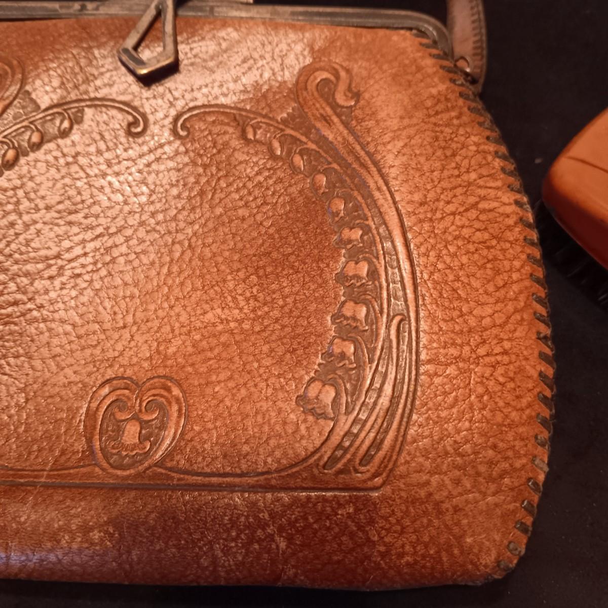 ANTIQUE TOOLED LEATHER PURSE AND A BAKELITE BRUSH