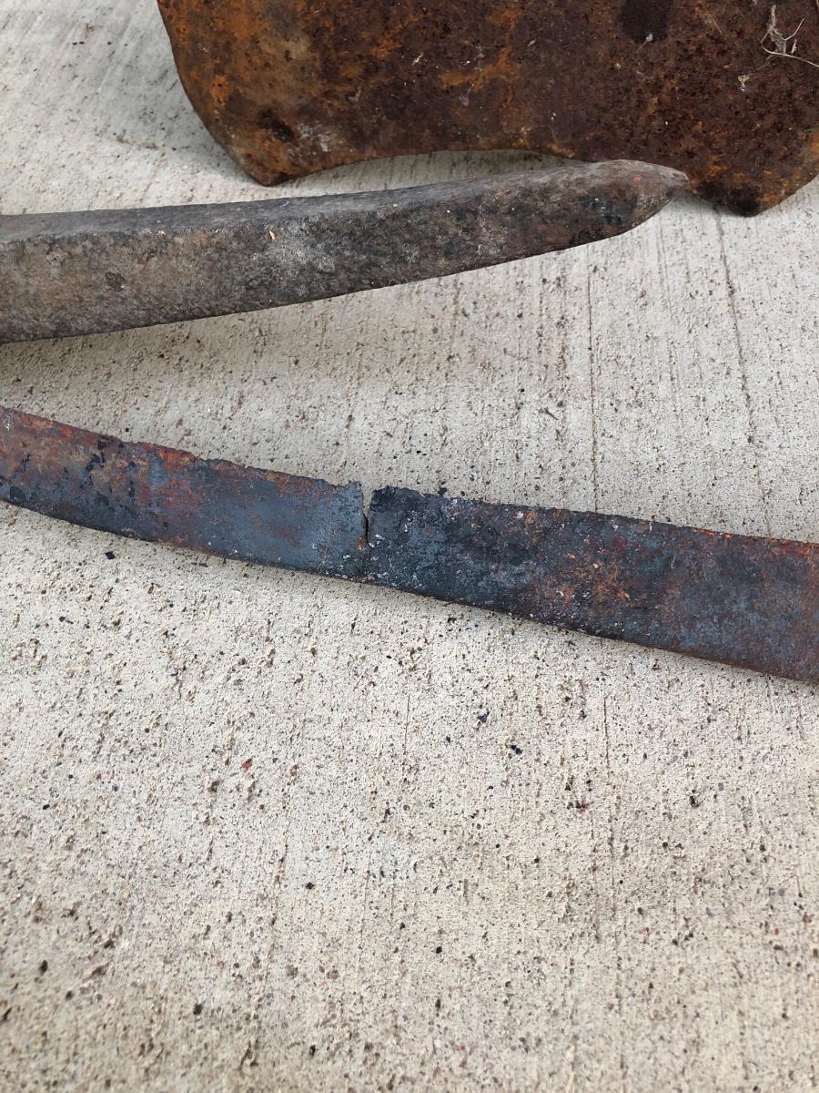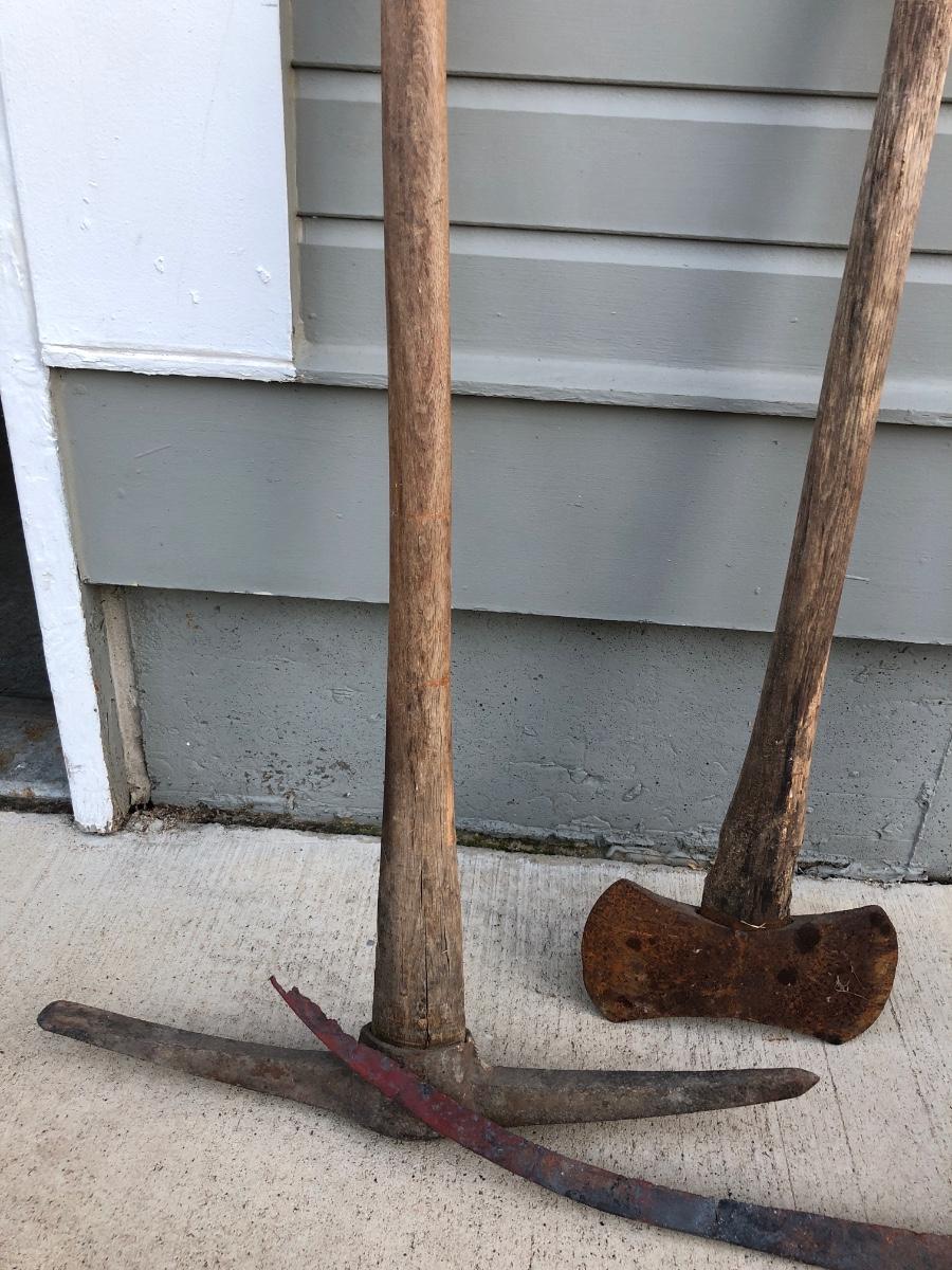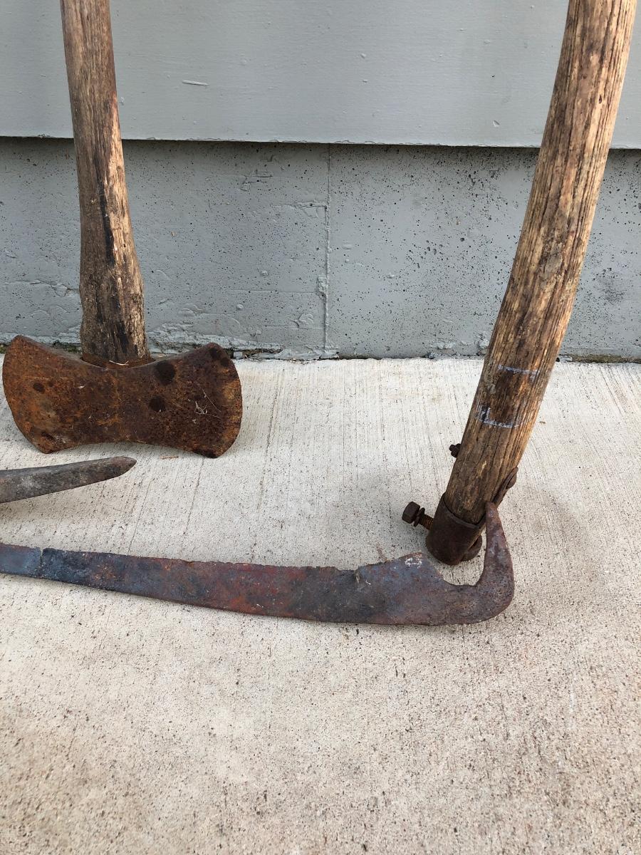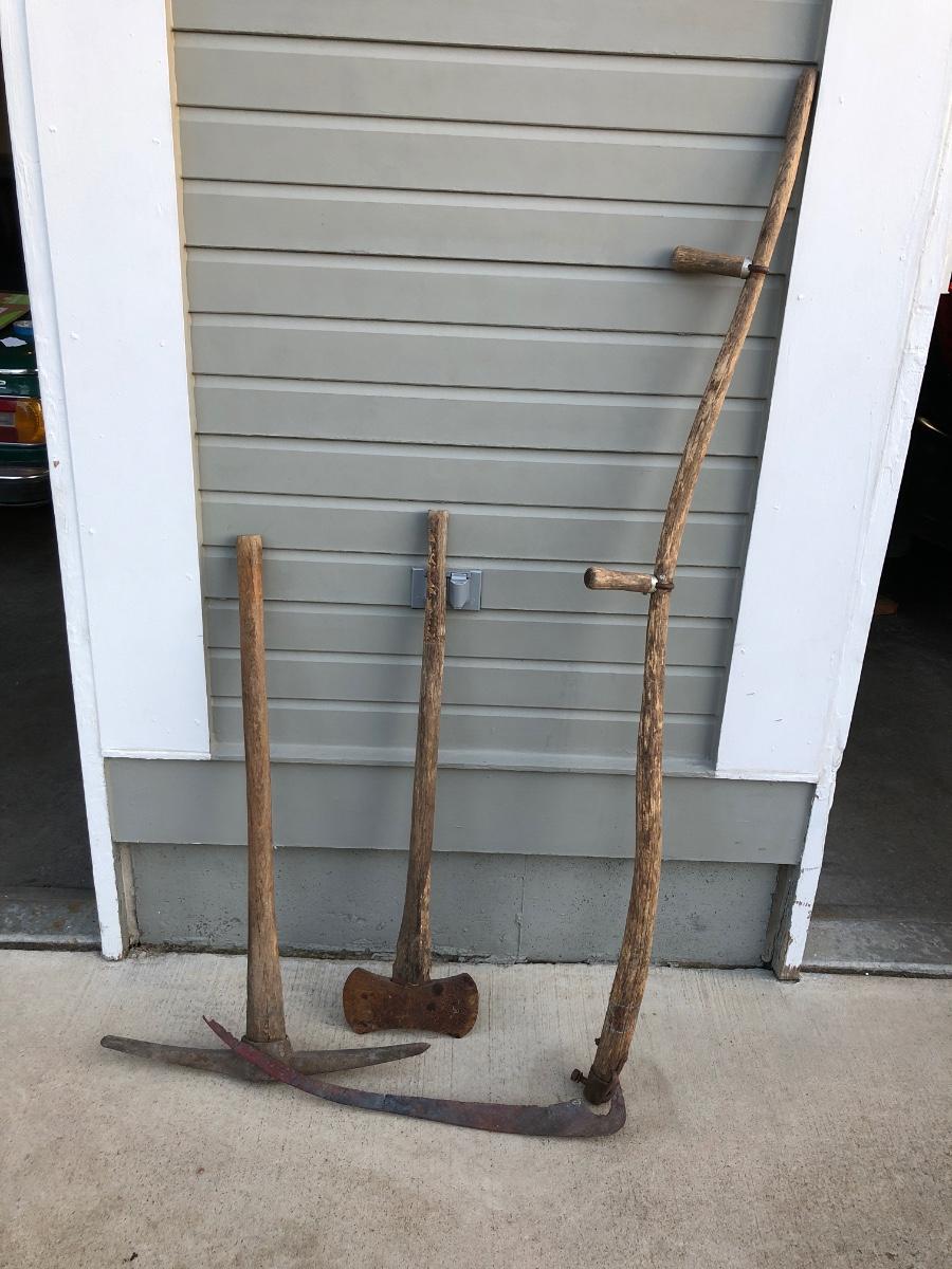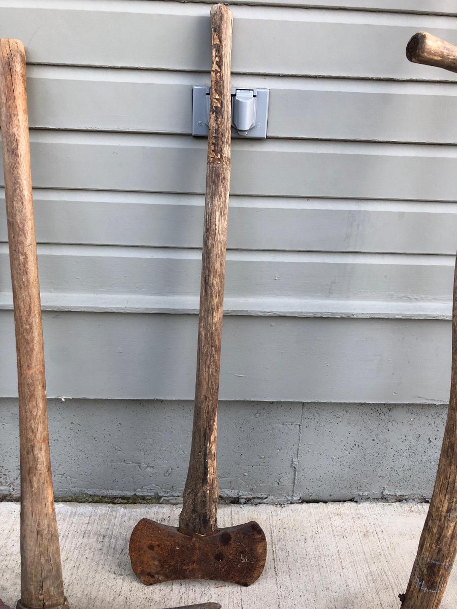Pick ax and double headed ax with damaged handle. Scythe blade is not attached and has some damage. Scythe handle is in pretty good shape. Please see pictures