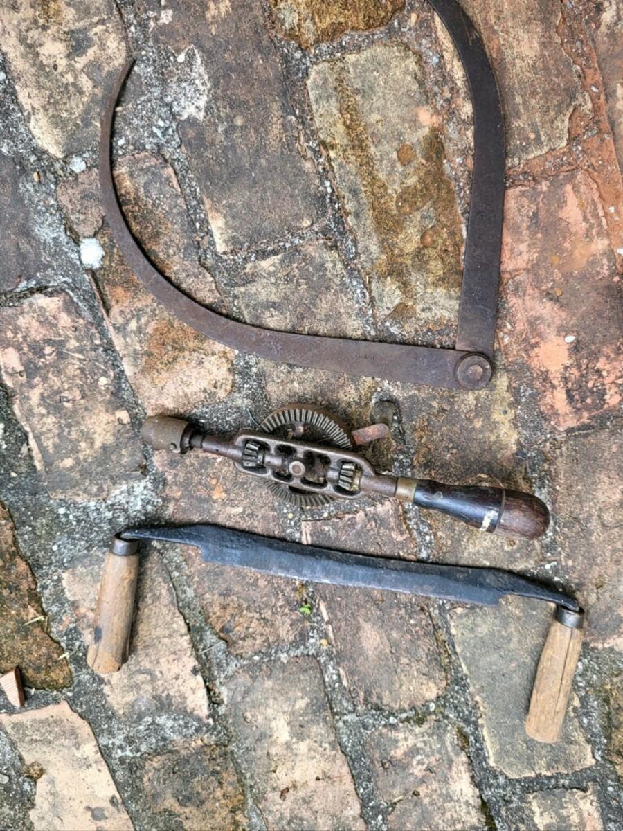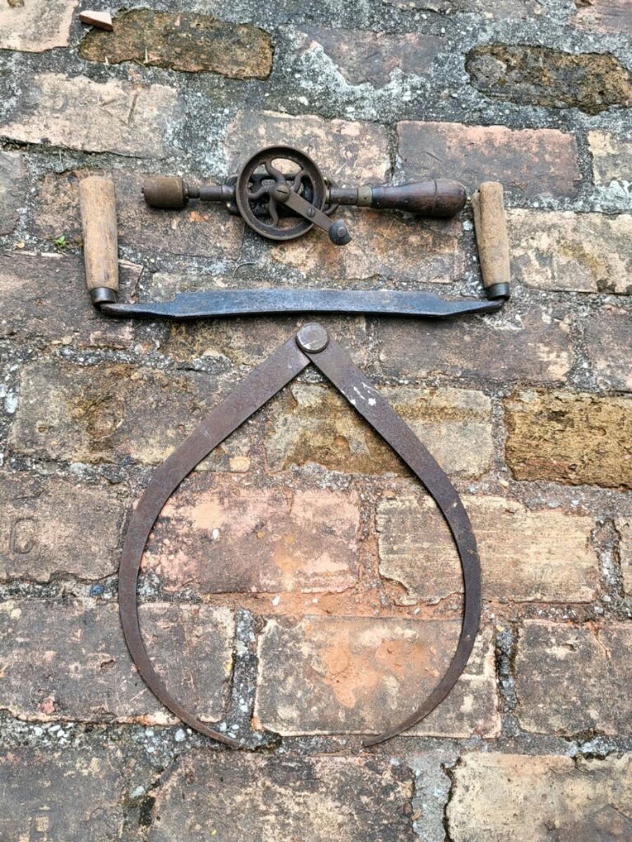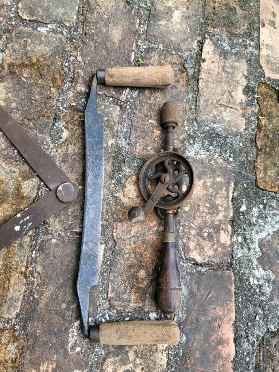 Antique tools LOT 2 - handcrank drill, planer, tongs