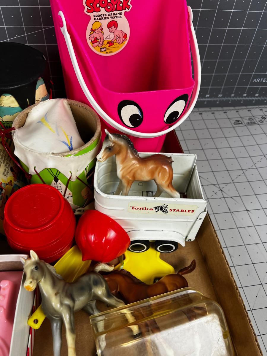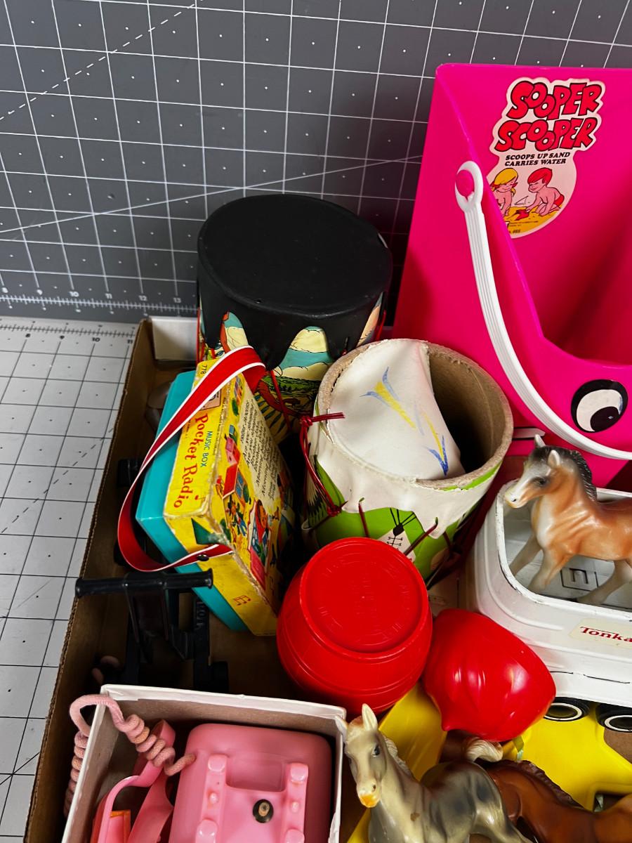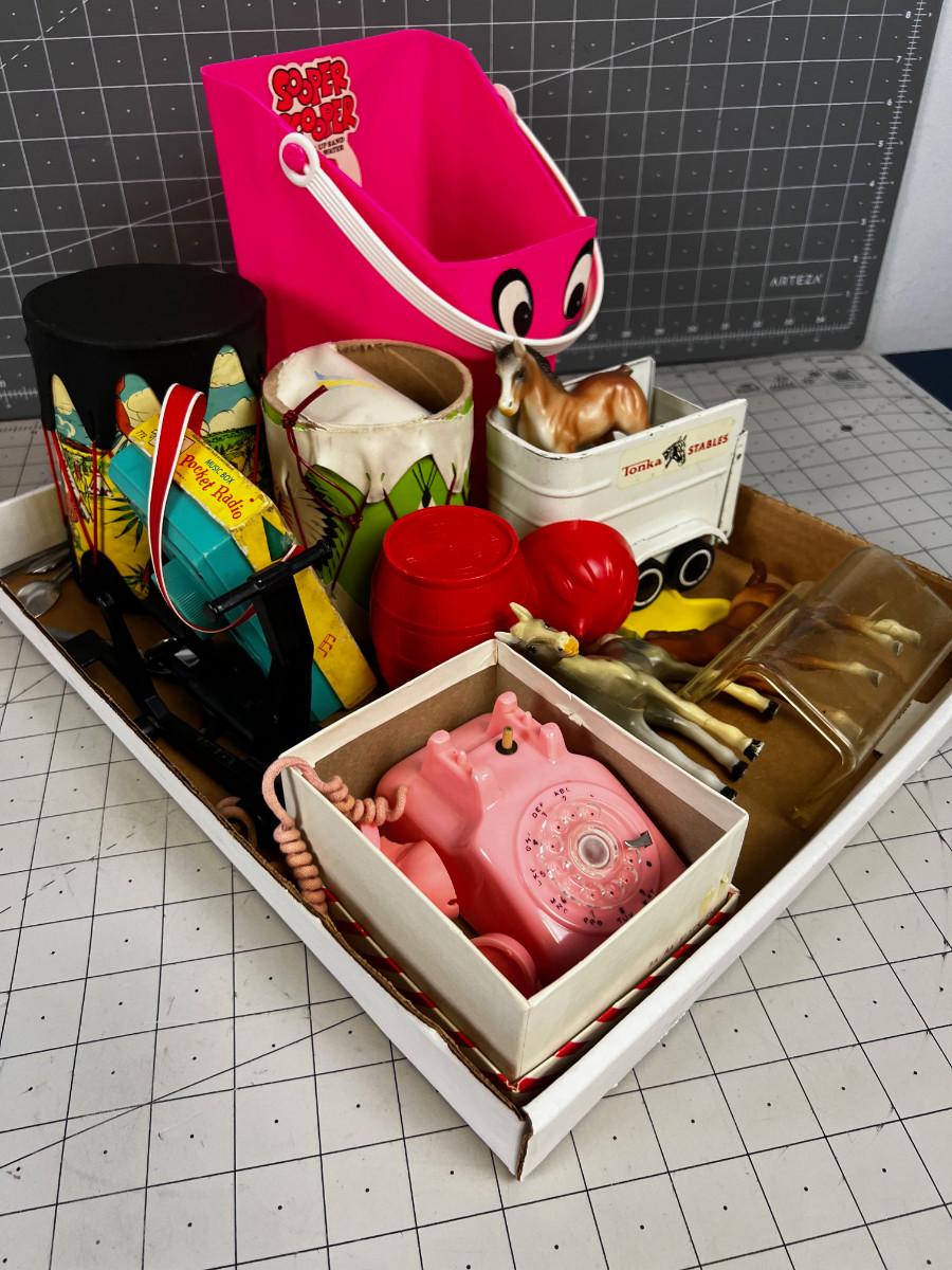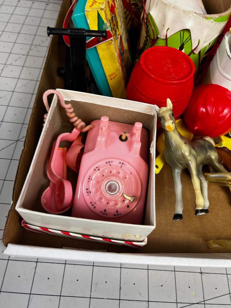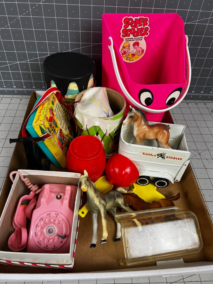 Antique Toys: Drum, Telephone, Horses, Trailer
