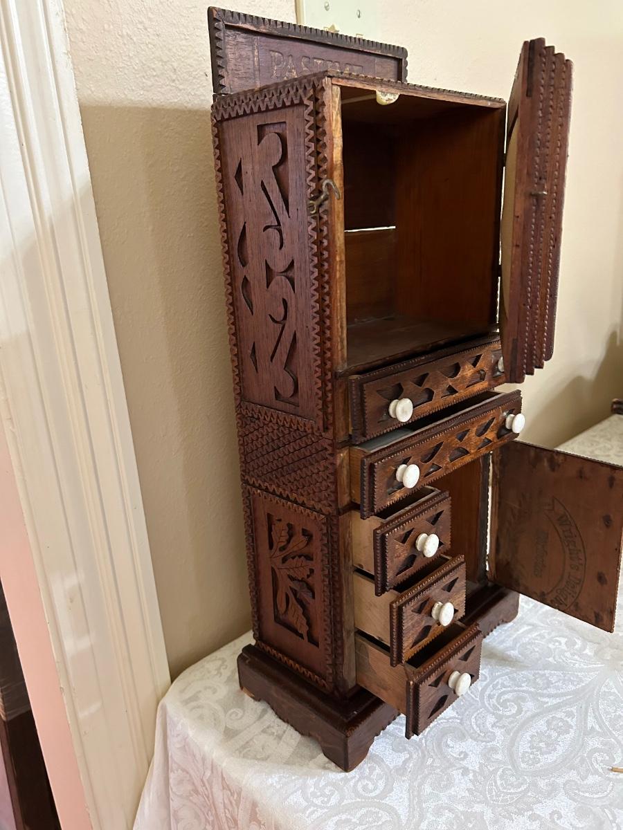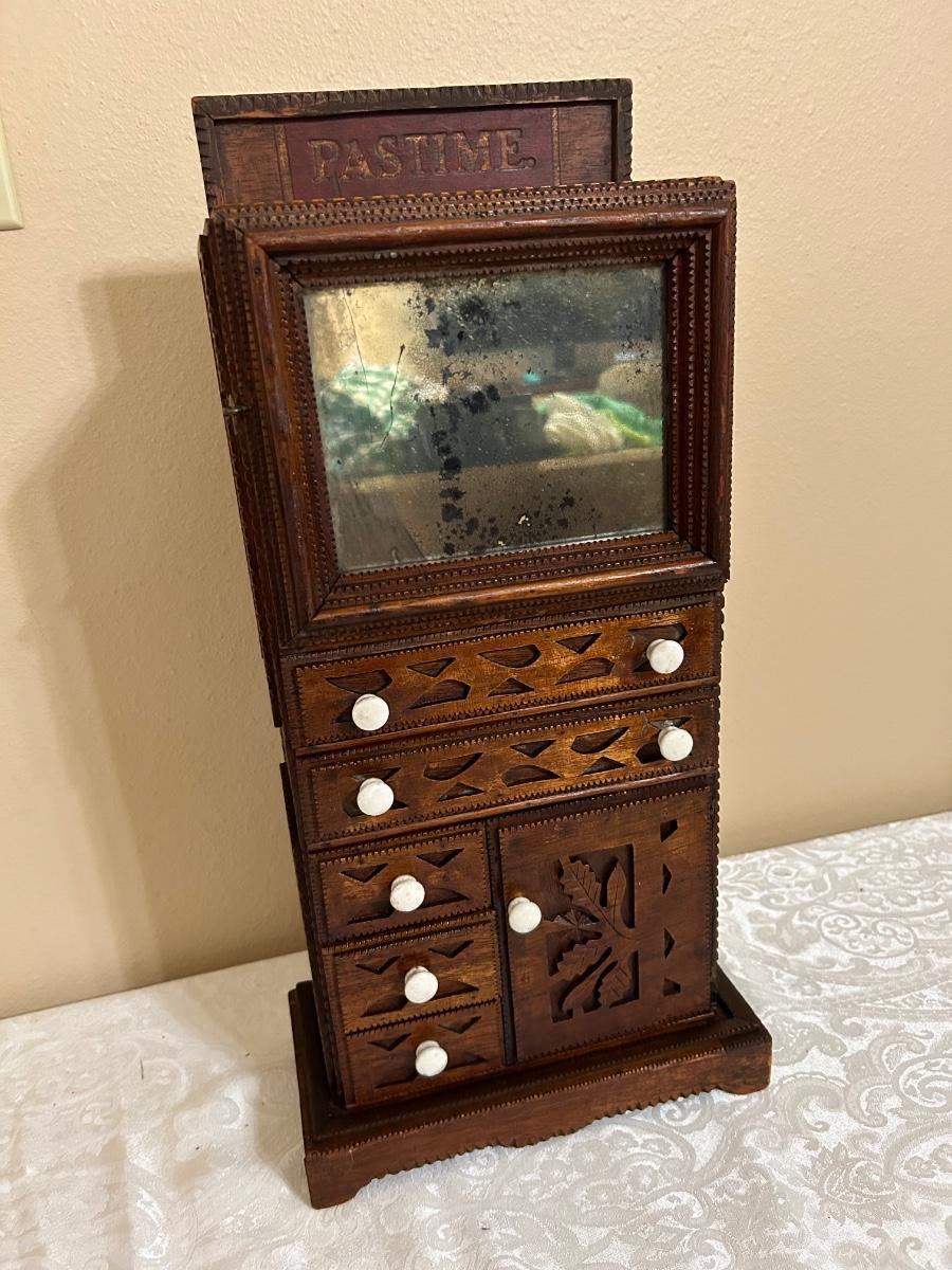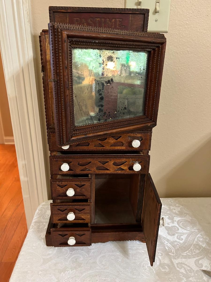 These were made from cigar boxes. Great piece of American folk art and are very collectible. 21h x 9w x 5-1/2d
