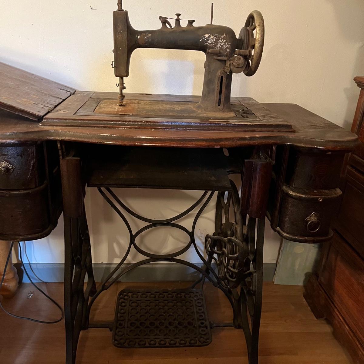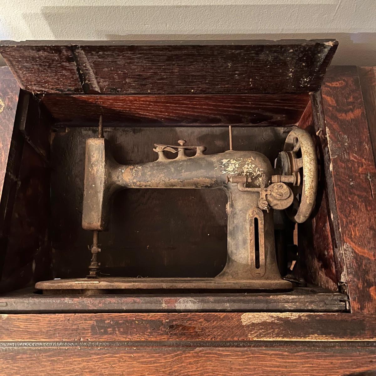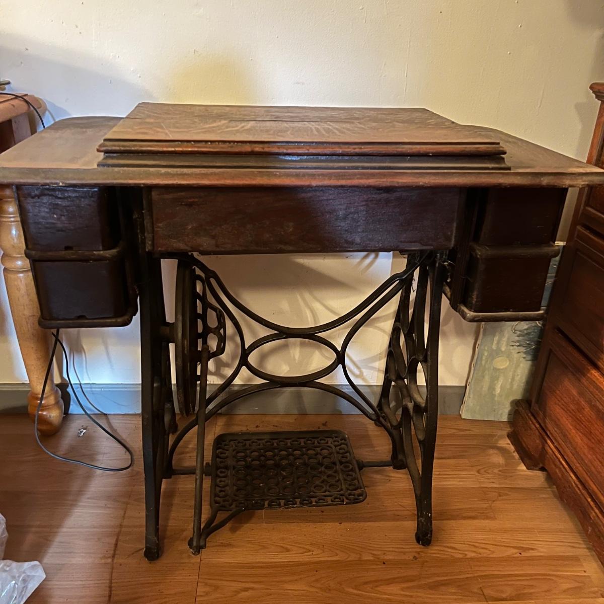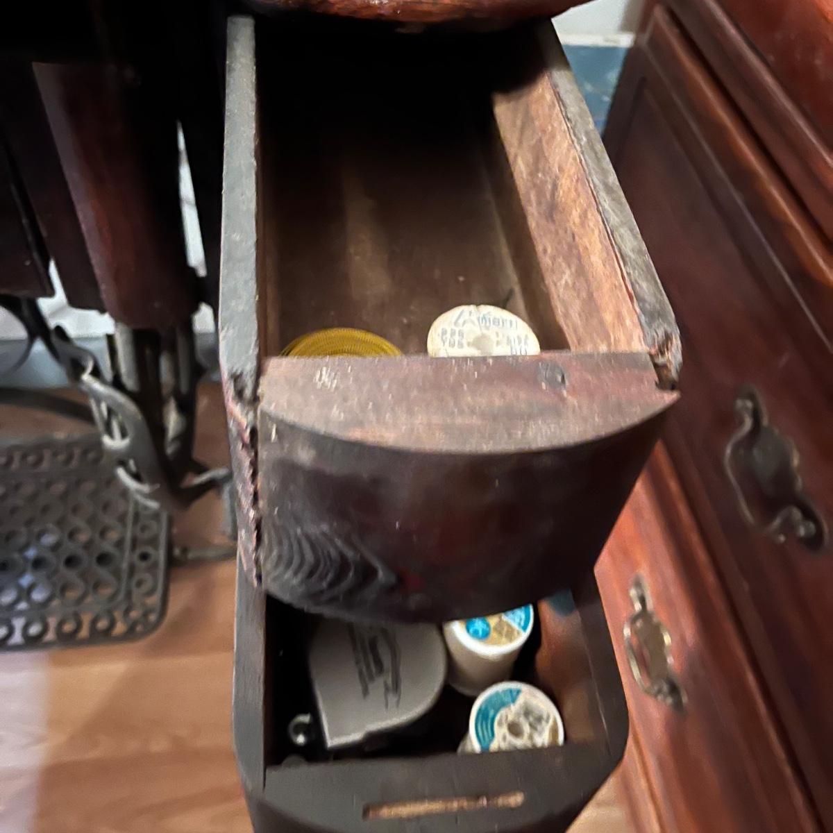 Lot includes a four drawer treadle sewing machine. The sewing machine folds down into a compartment in the cabinet. Cabinet has blemishes from its age and use, see pictures. The sewing machine appears worn and the drawers are missing three handles.
