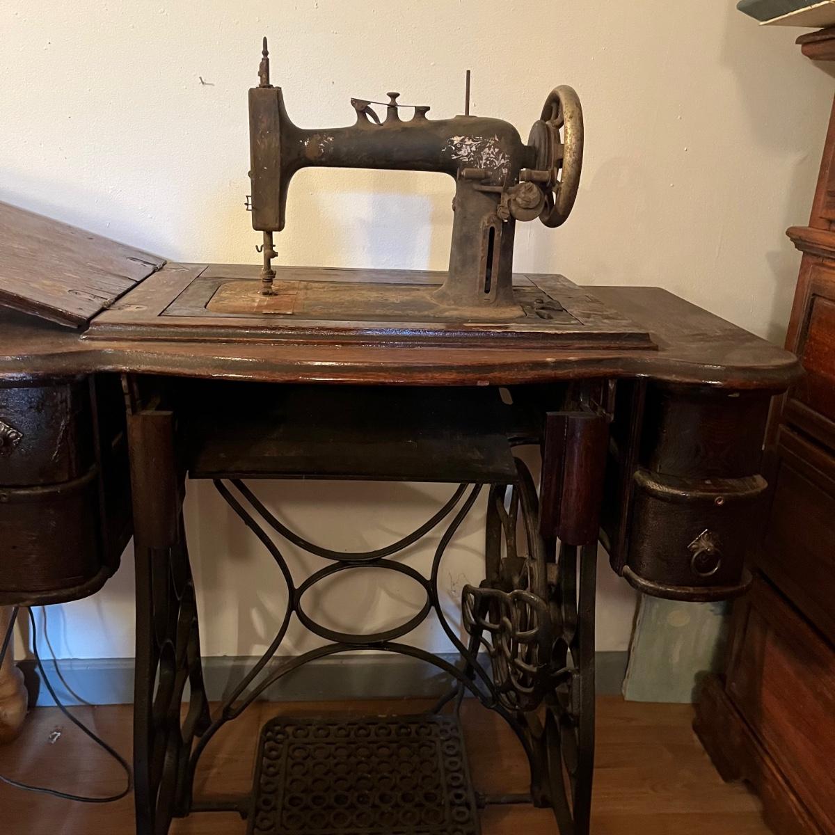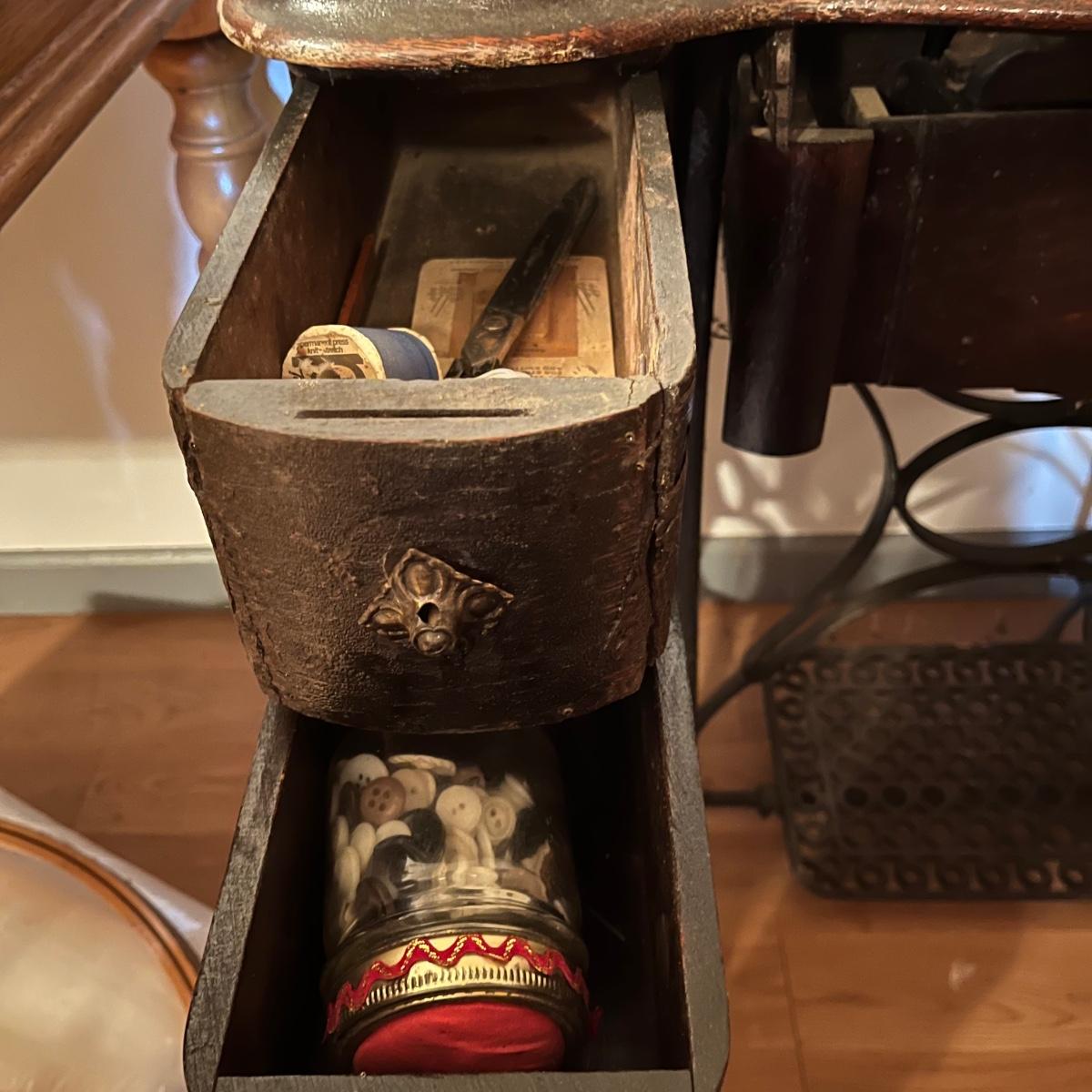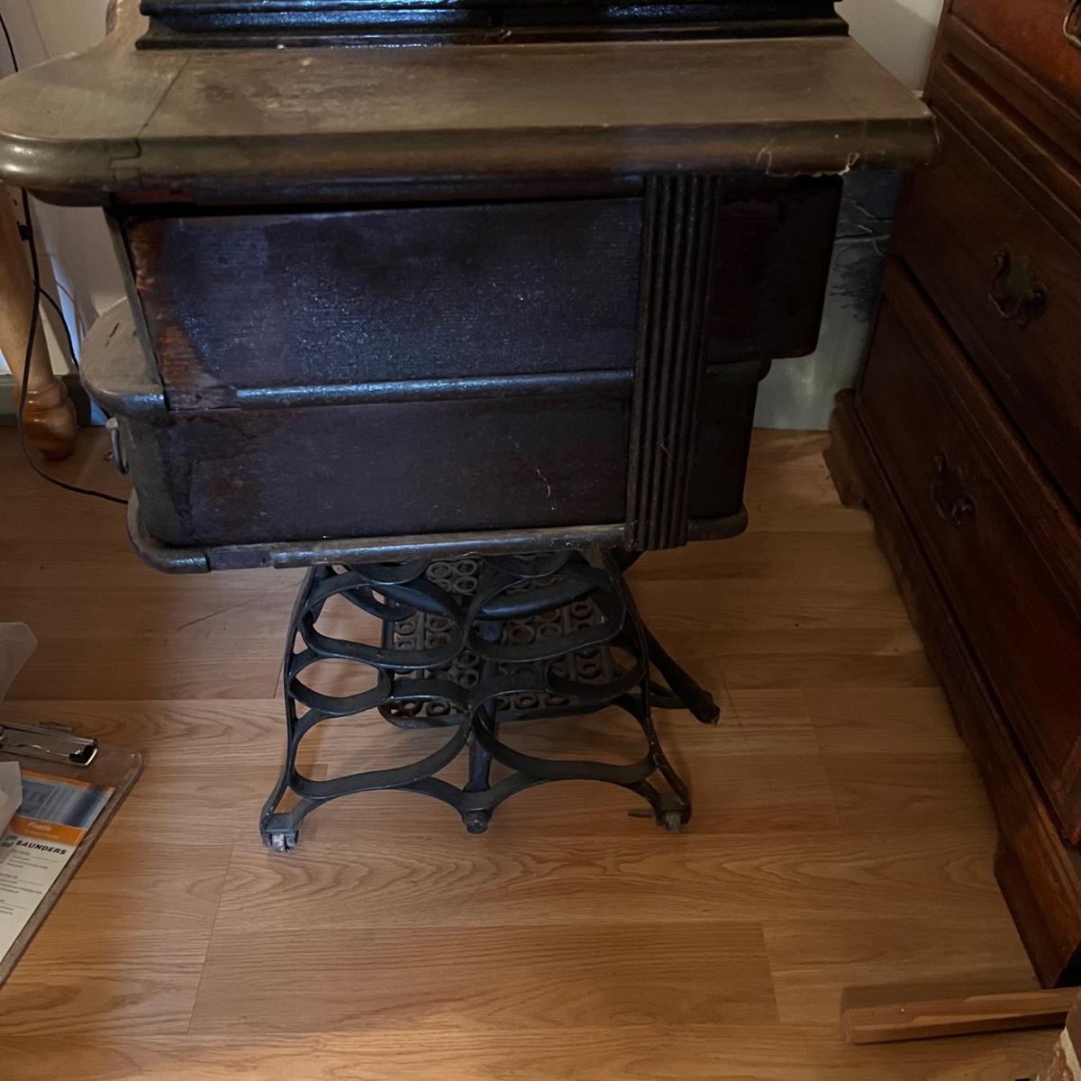 Lot includes a four drawer treadle sewing machine. The sewing machine folds down into a compartment in the cabinet. Cabinet has blemishes from its age and use, see pictures. The sewing machine appears worn and the drawers are missing three handles.