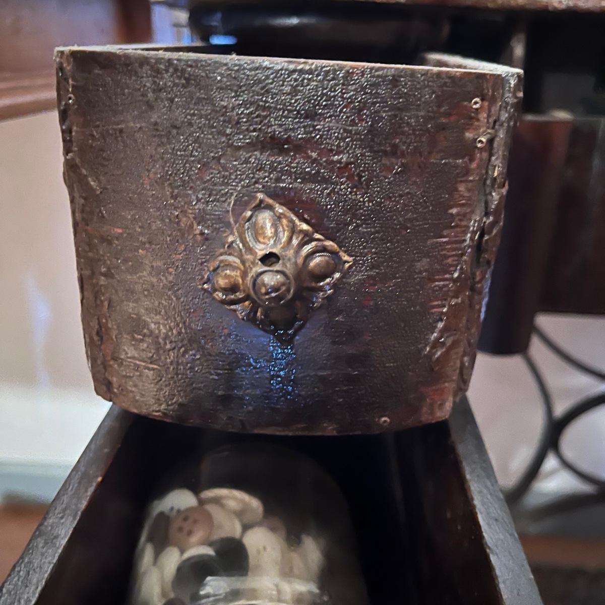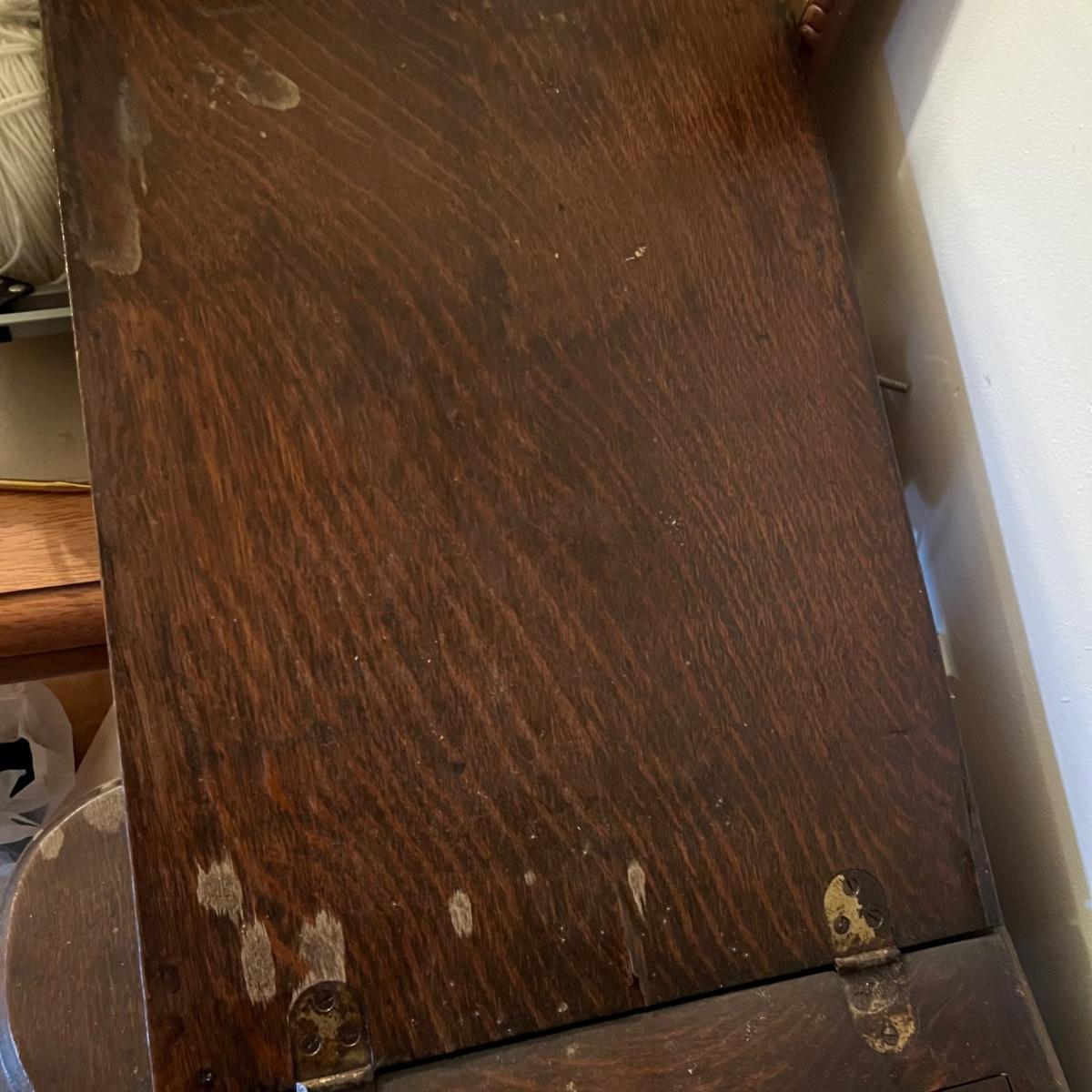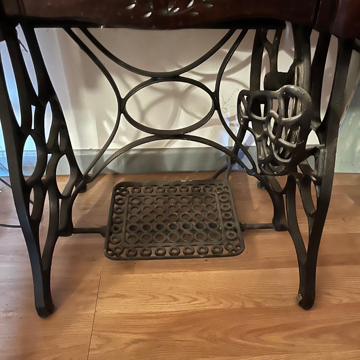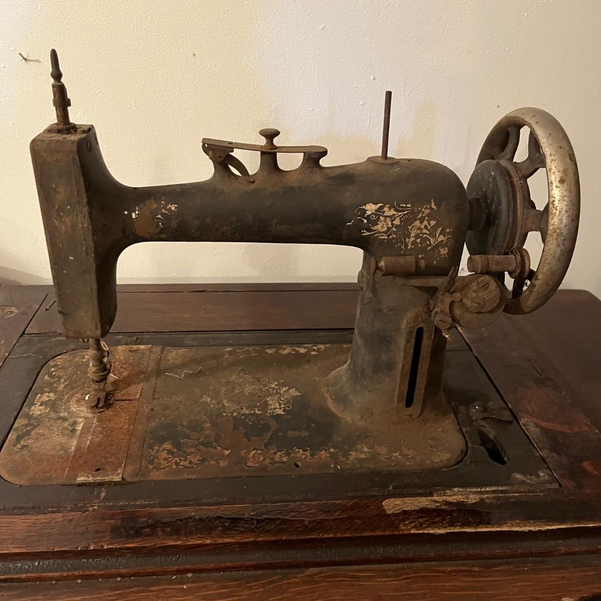 Lot includes a four drawer treadle sewing machine. The sewing machine folds down into a compartment in the cabinet. Cabinet has blemishes from its age and use, see pictures. The sewing machine appears worn and the drawers are missing three handles.