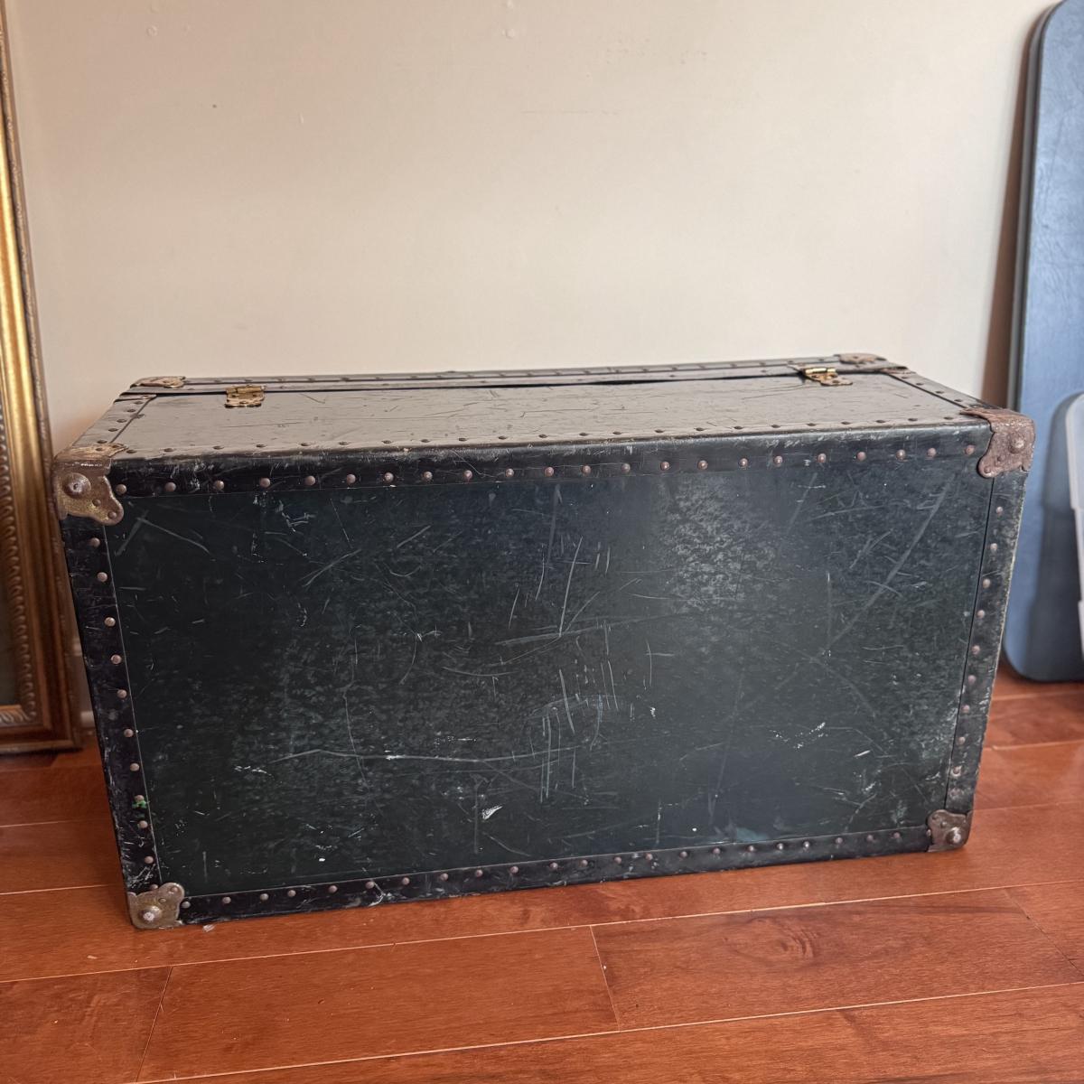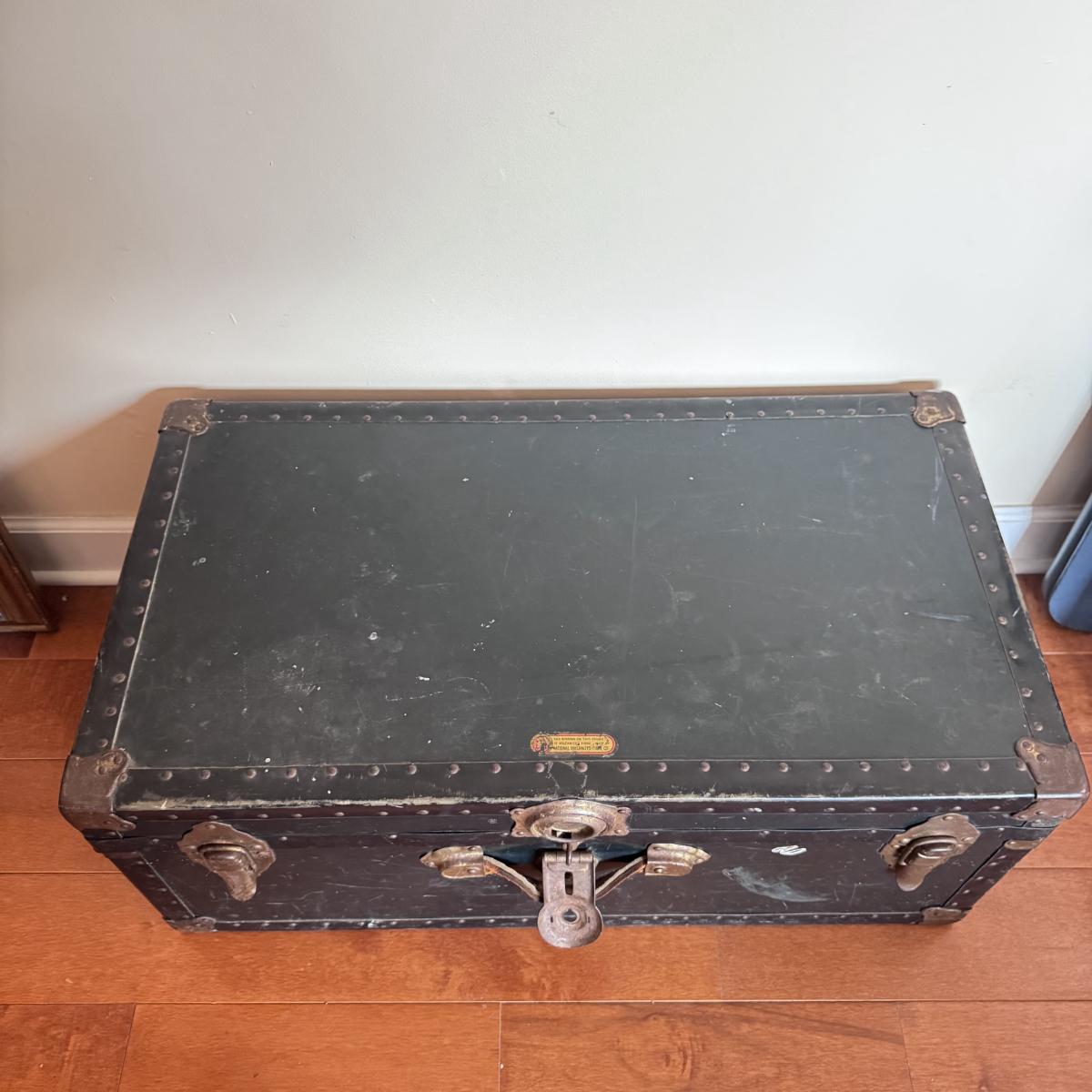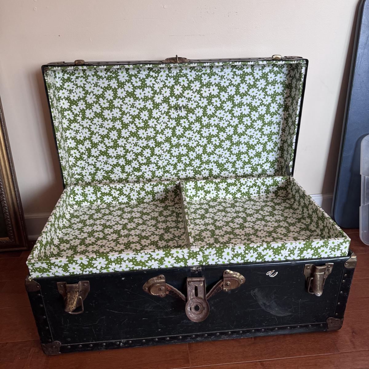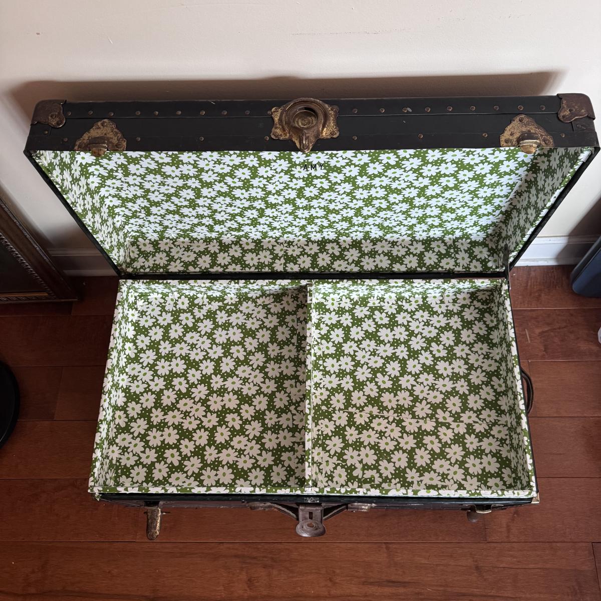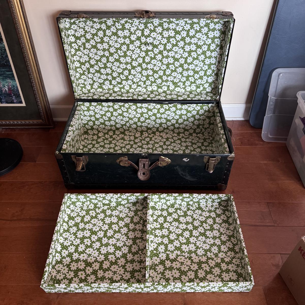 Lot includes one really cool antique trunk that was made by the National Vulcanized Fibre Company. The trunk has been lined with green and white flower paper and has a removable insert. The trunk measures 30.95” x 16.95” x 12.95”H. Local pickup only.