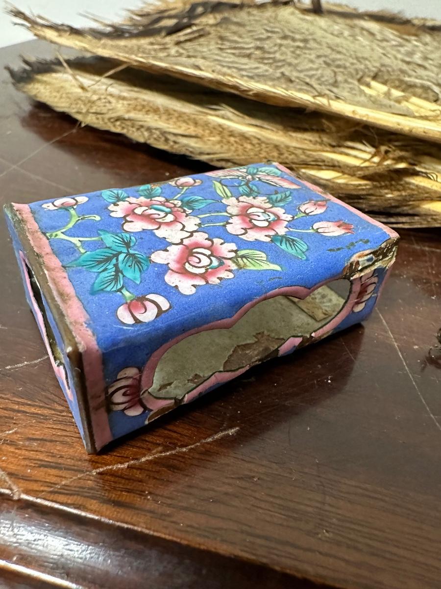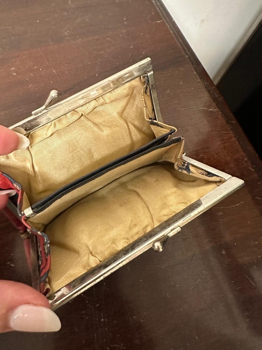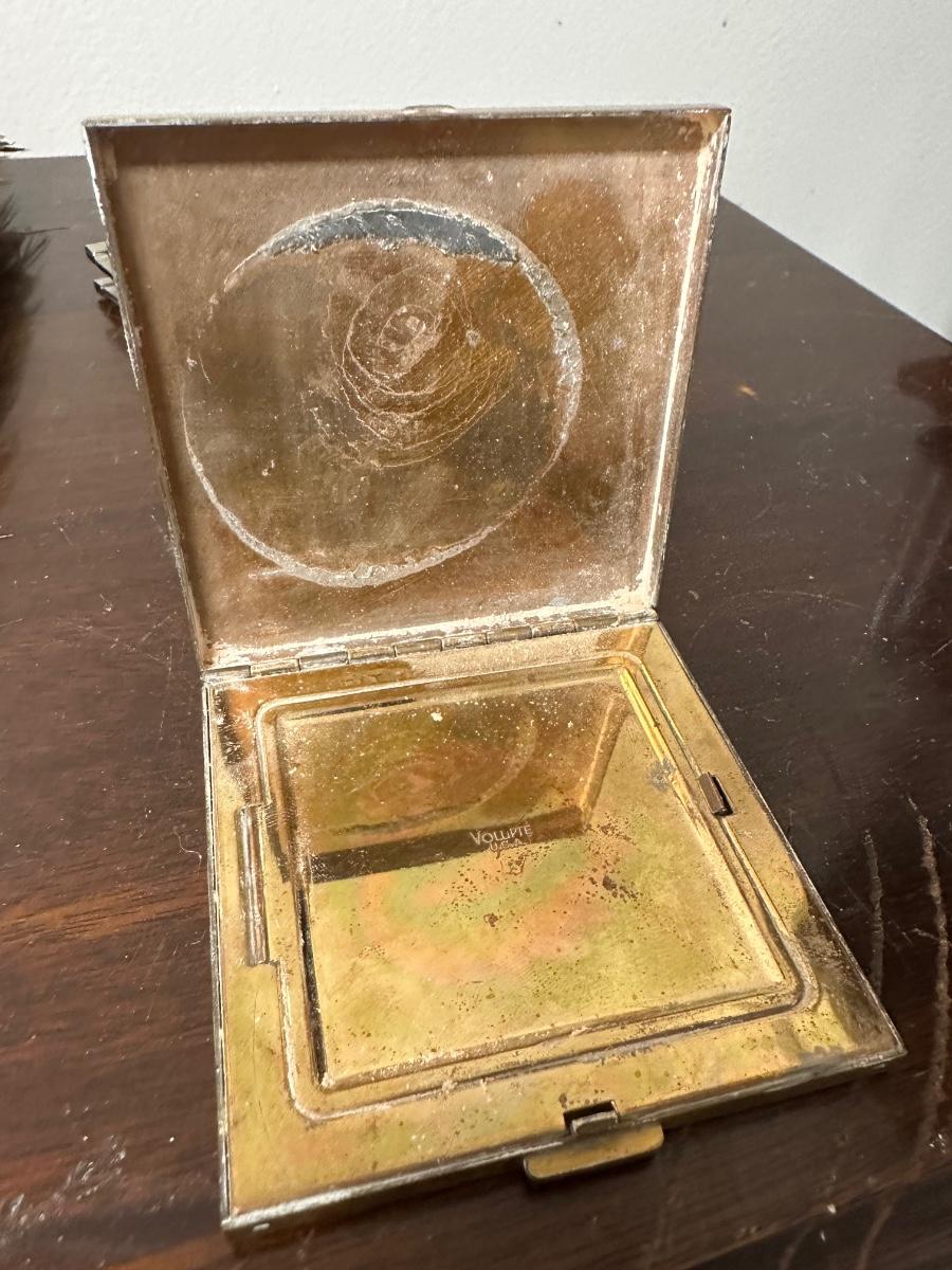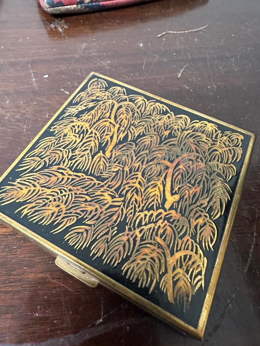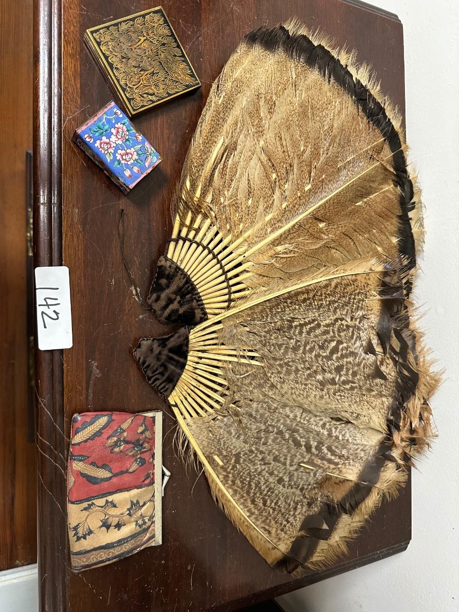2 ANTIQUE TRUKEY FEATHER HAND FANS, COIN PURSE,COMPACT &MATCHBOX COVER AS PICTURED