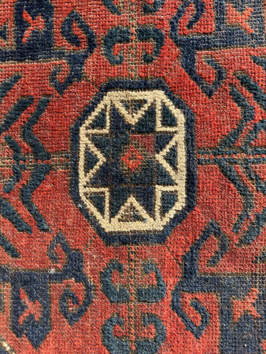 DESCRIPTION: This is an antique oriental bag face from the Anatolia area that should be considered highly collectible. The over all rust-red colored field exhibits a star element woven into an over-all abstracted diamond gul patterned field set into an arrow and diamond border picked out in white.