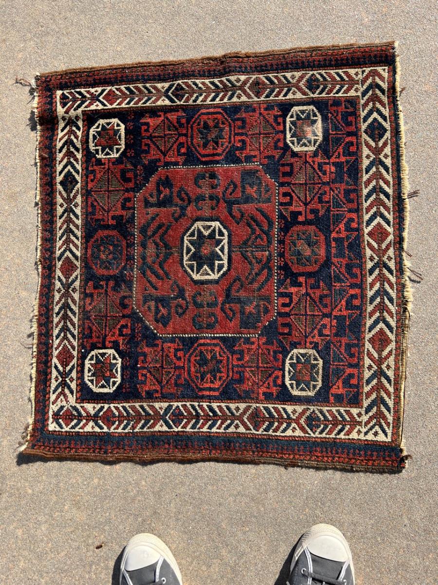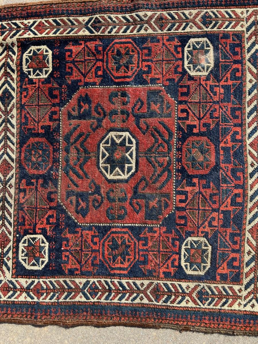 CONDITION: Considering its age, this bag face is in good condition with expected wear to the wool pile and slight loss to end knotting and some 60% loss to the wool pile.. It is suggested that this piece be hung on the wall, or used as a table cover. (please review the photos carefully to assess condition issues)