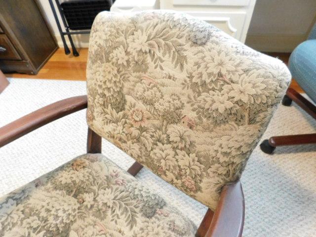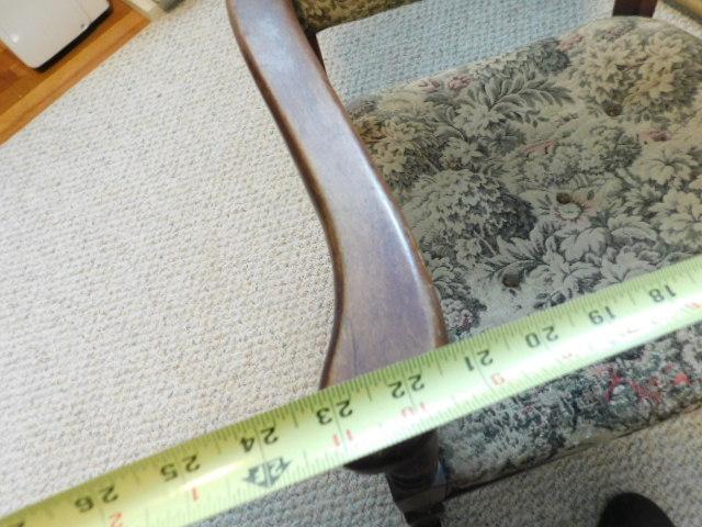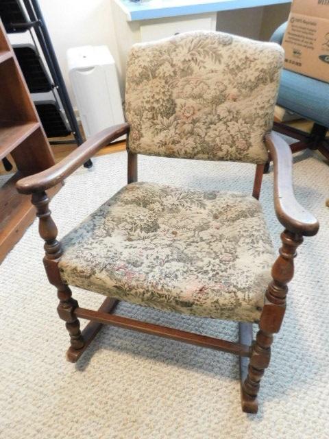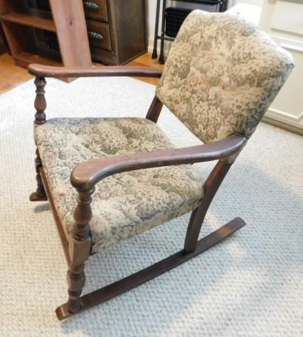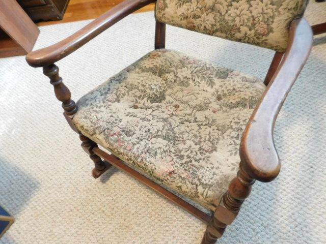 Antique Turned Wood Rocker with Upholstered Seat and Back