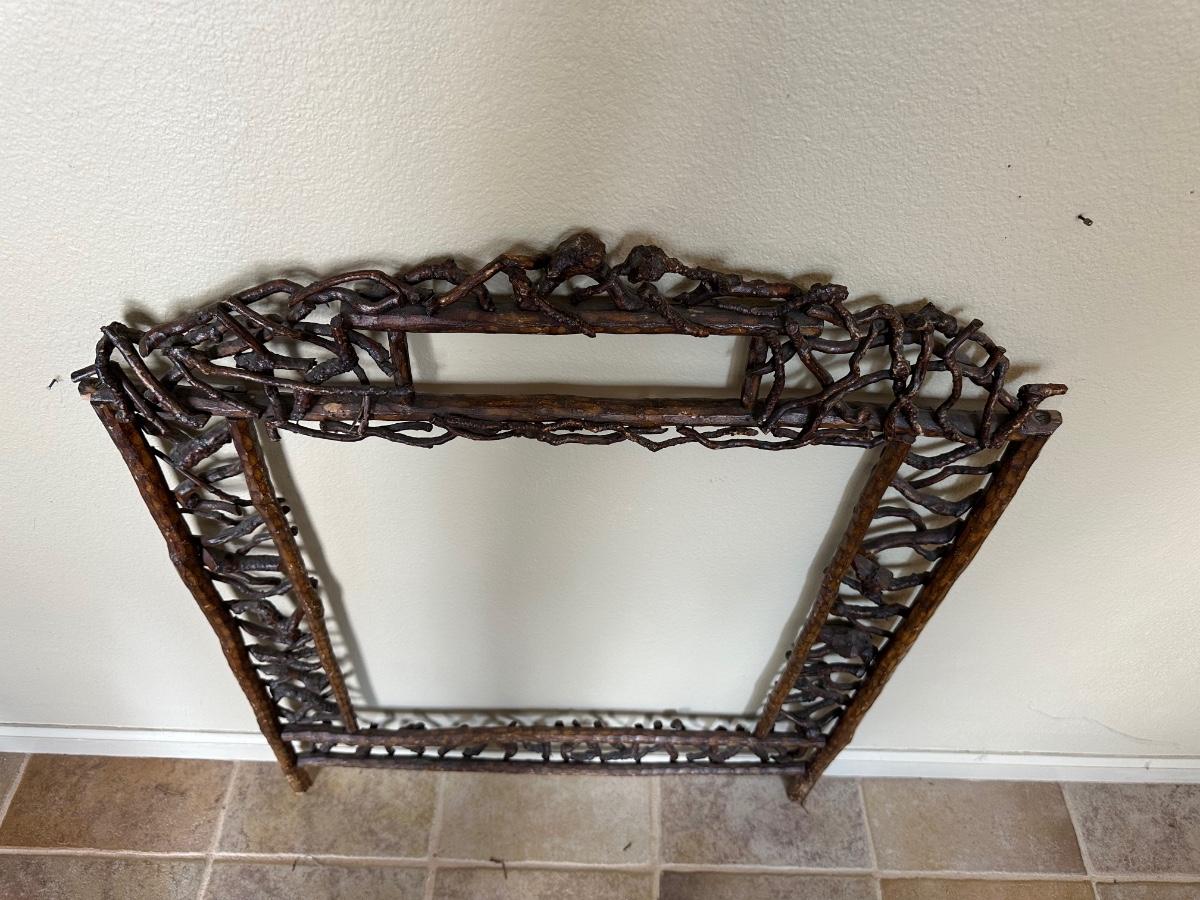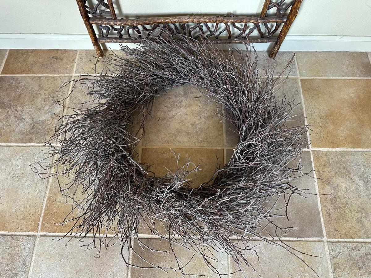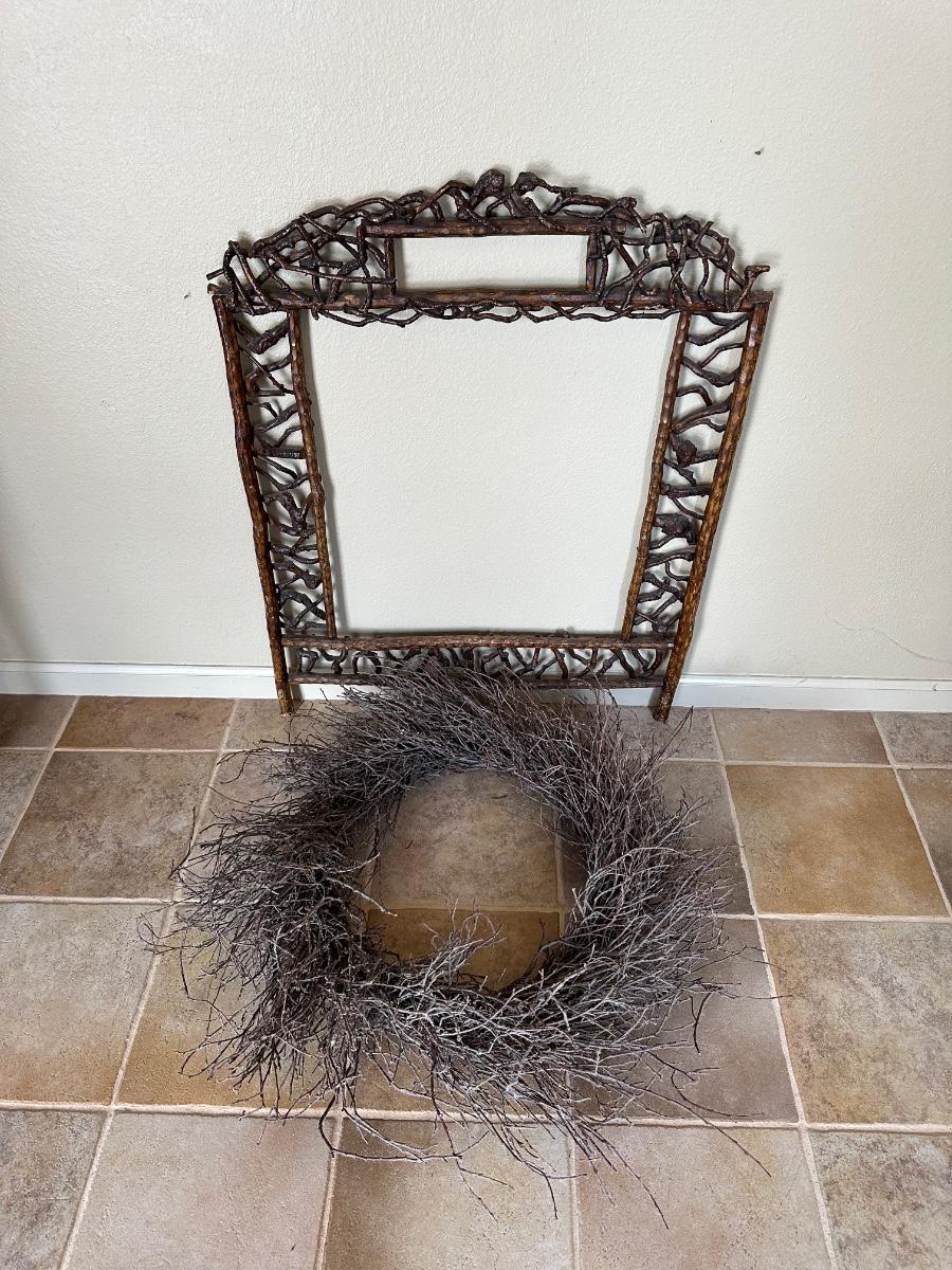 ANTIQUE TWIG FIREPLACE SCREEN AND A DRIED FOLIAGE WREATHE