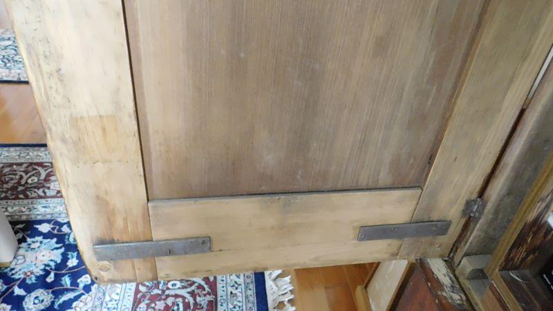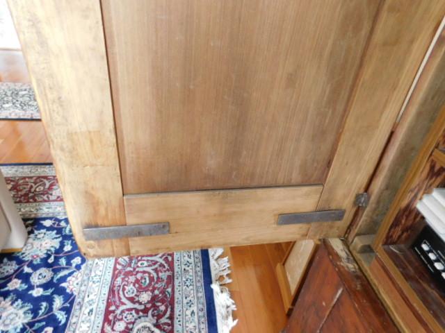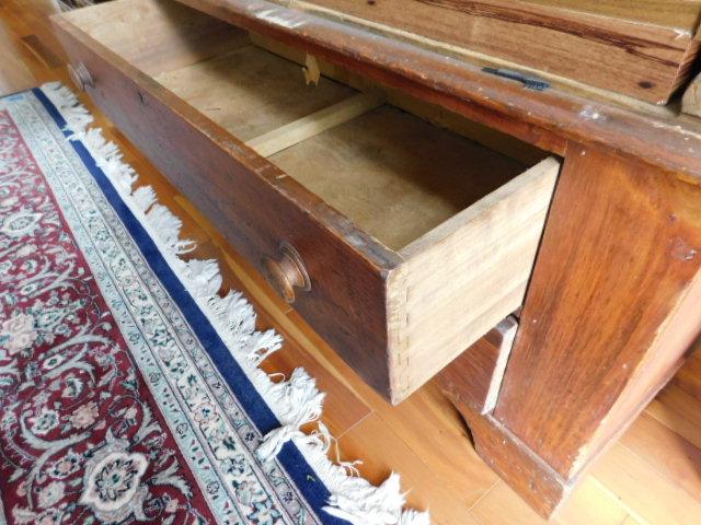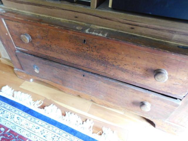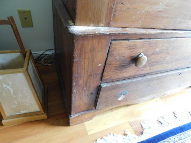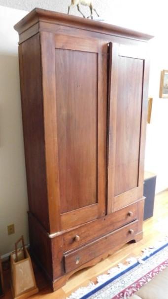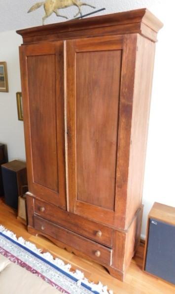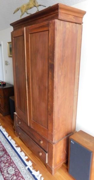 Antique Two Piece Armoire with Double Drawer Blanket Cabinet 48"x20"x88" has scratches and wear. Interior is built out as an entertainment center. Main level has a few steps to maneuver to drive.