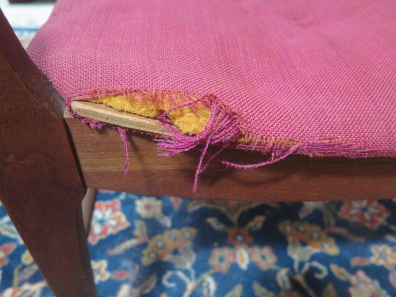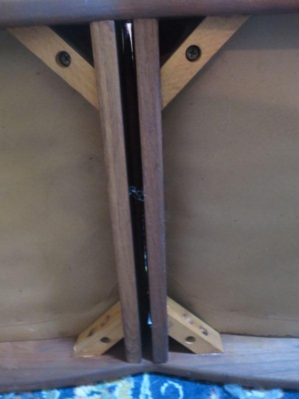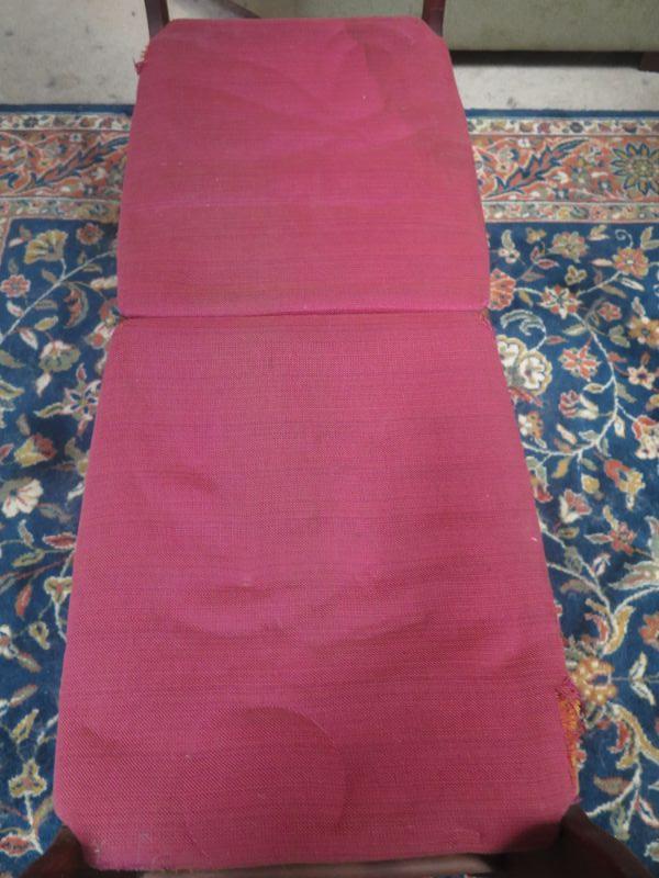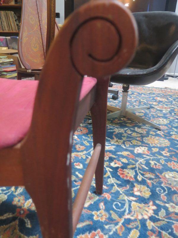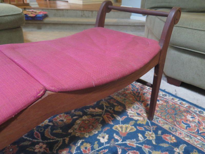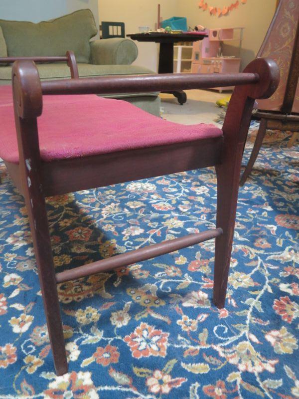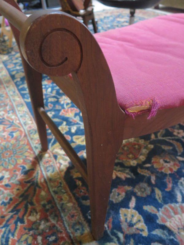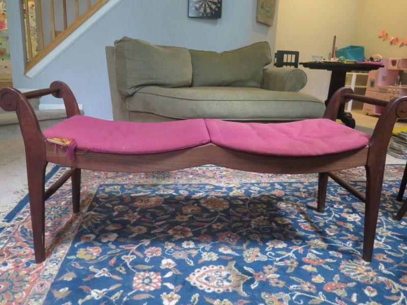 Unique antique bench with fitted curved seats. Needs reupholstering, but in otherwise great condition! **Please read Terms and Conditions before placing a bid. Pick up is Sunday, September 1, 2019 from 10am to 4pm in Williamstown. All sales are final. All sales are as is, where is. Please review all photos. Any props included in photos are not included in listing. All measurements are approximate. Comes from home with cats.
