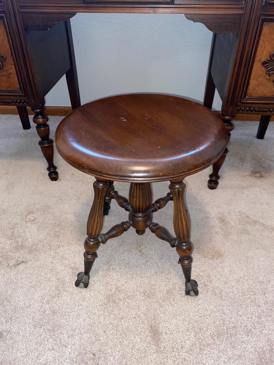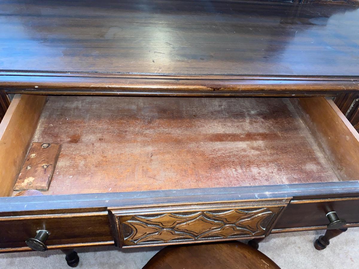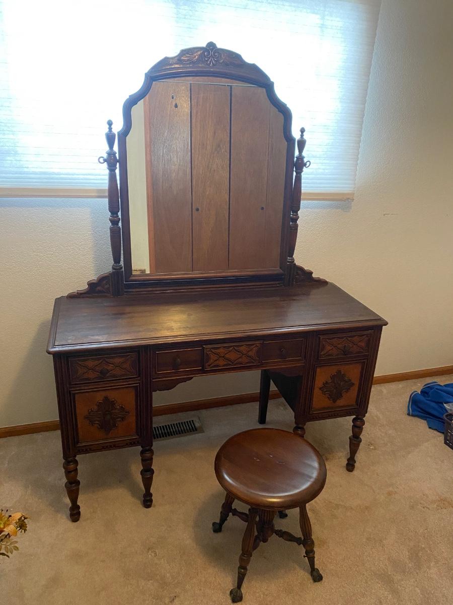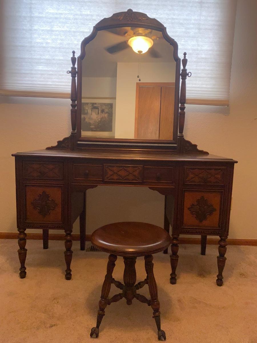 ANTIQUE VANITY and GLASS FOOTED STOOL HUNTLEY SIMMONS FURNITURE COMPANY