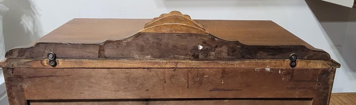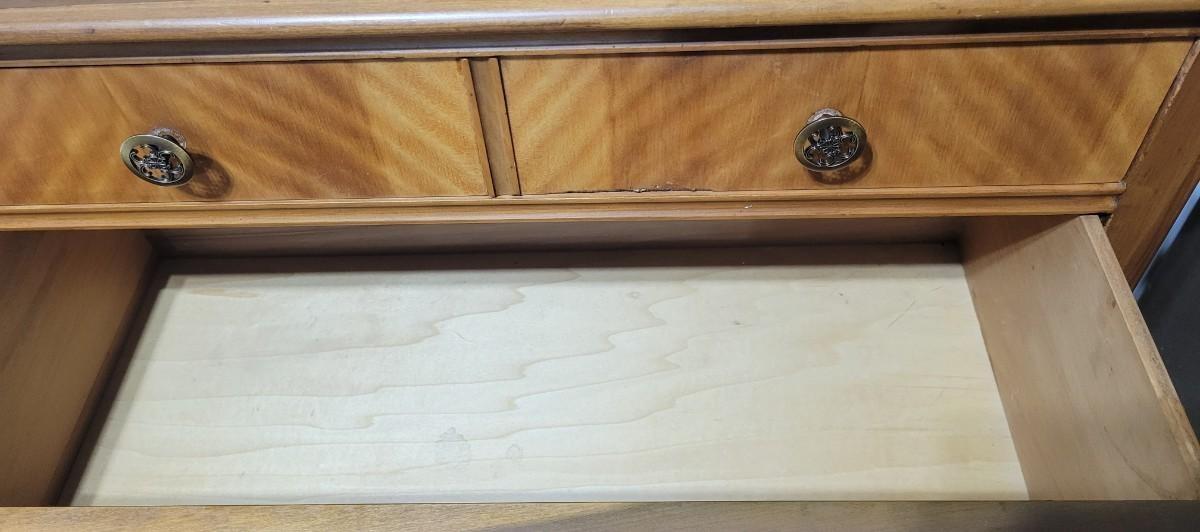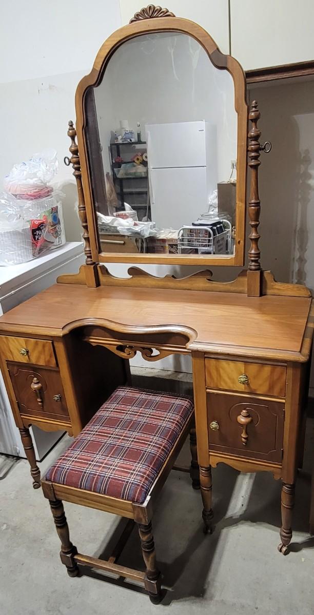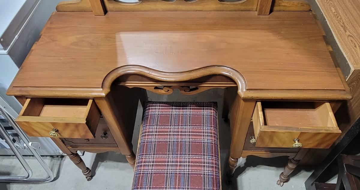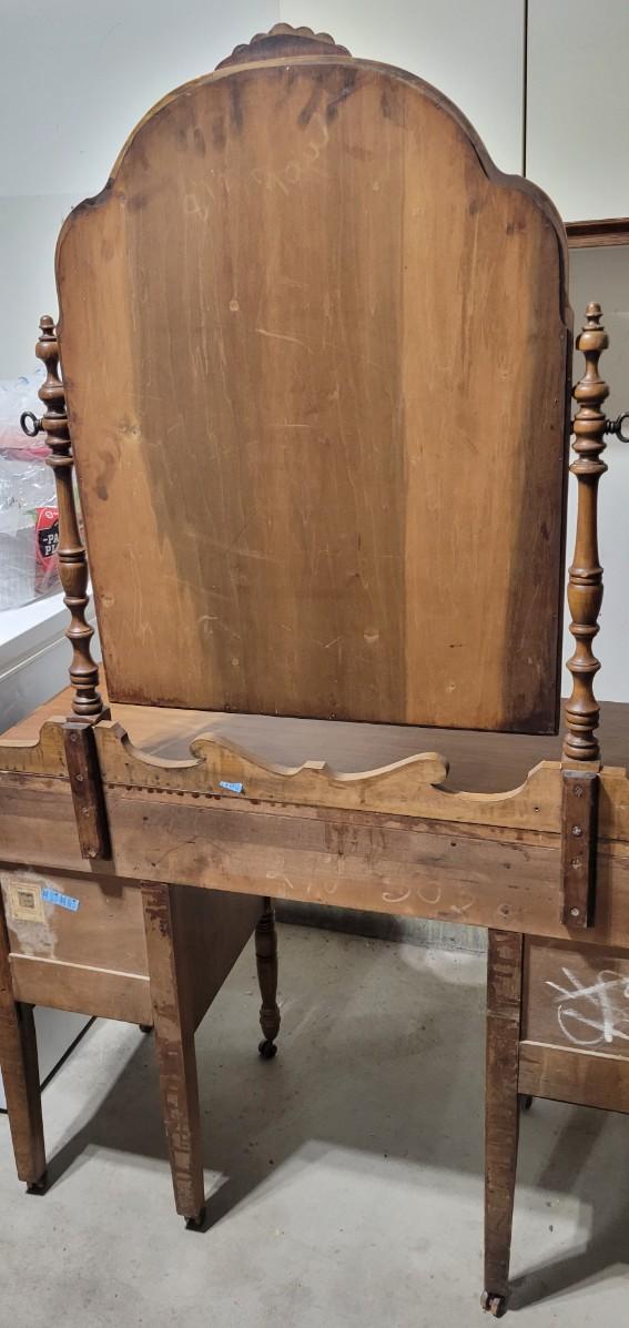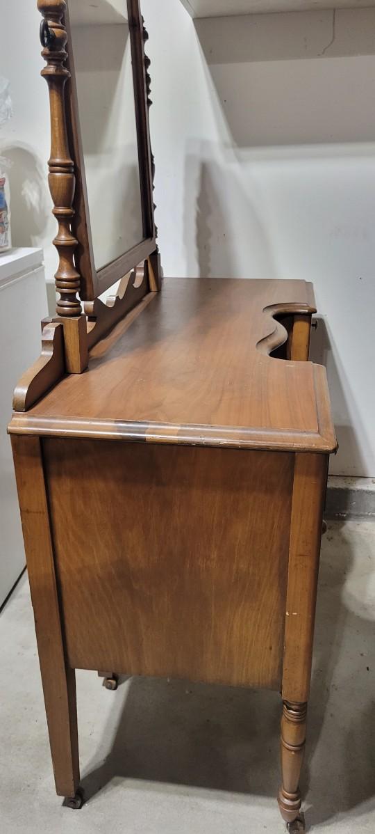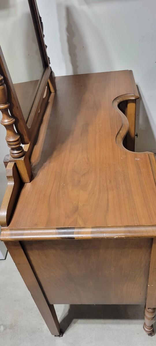 Vanity is in great condition, has its wooden casters. Mirror is in great condition, Vanity top does have a small area on the right front side that shows a "ding". Other than that, the piece appears to be of solid wood construction, and has original hardware.