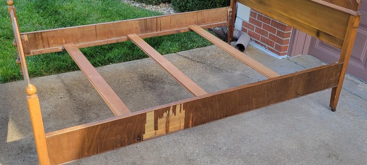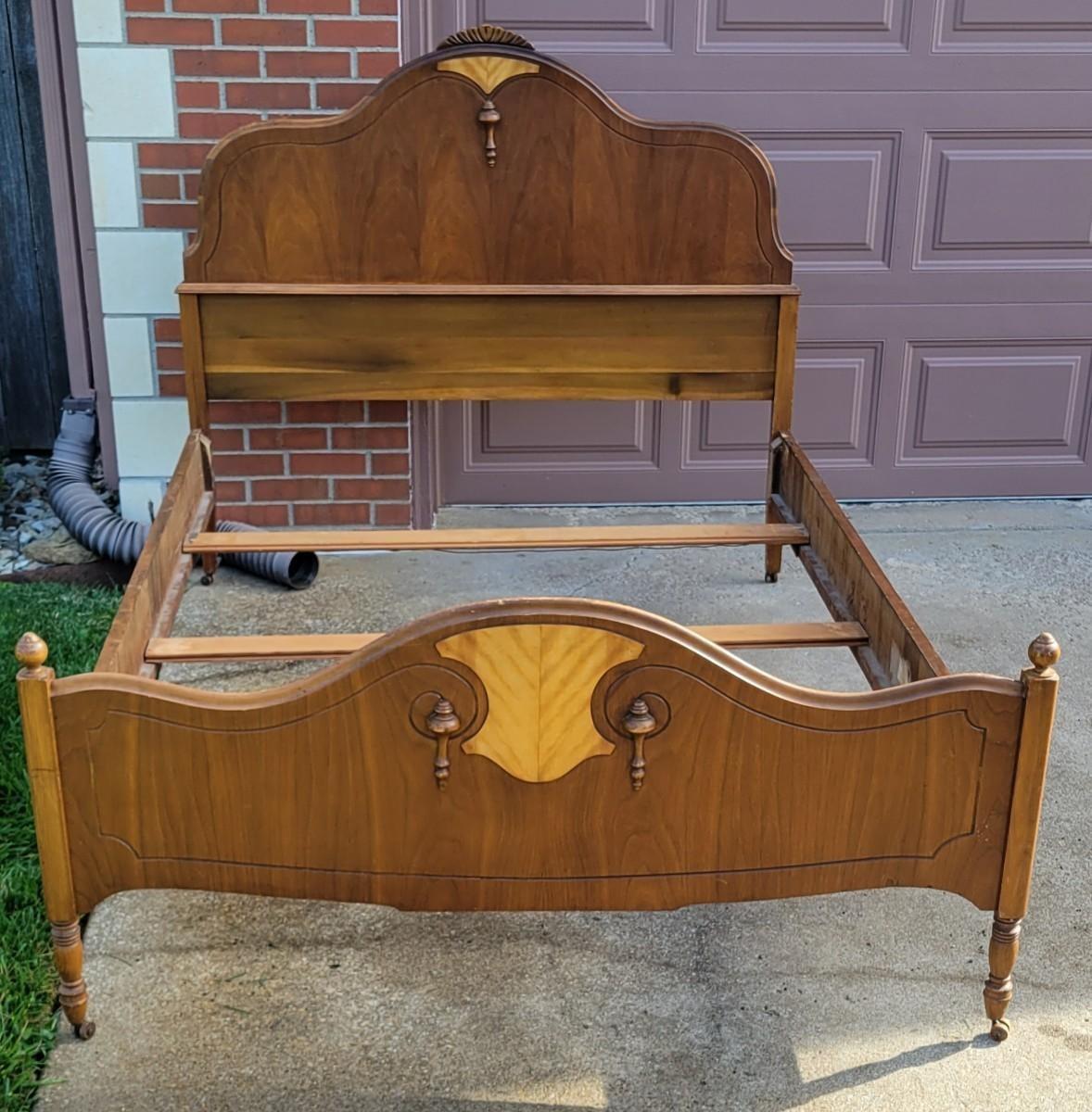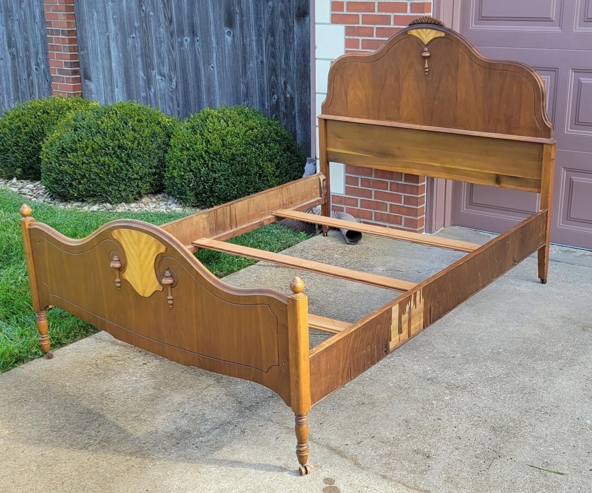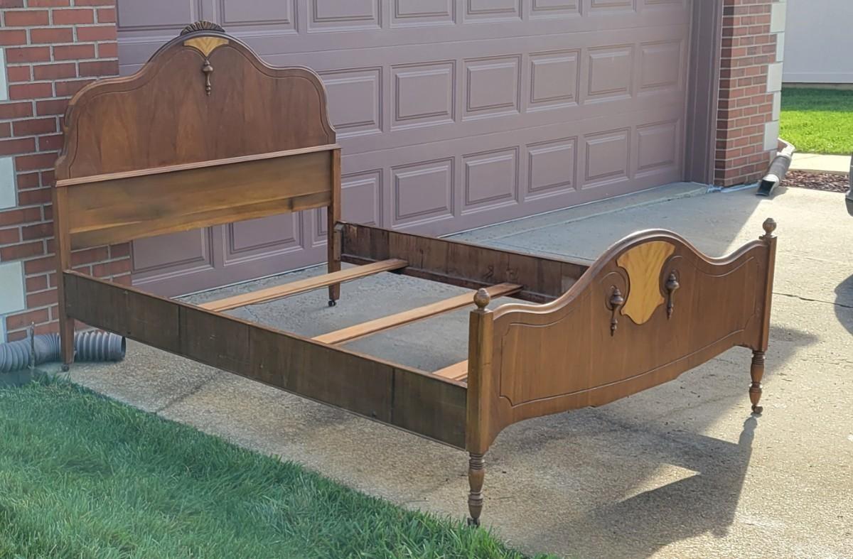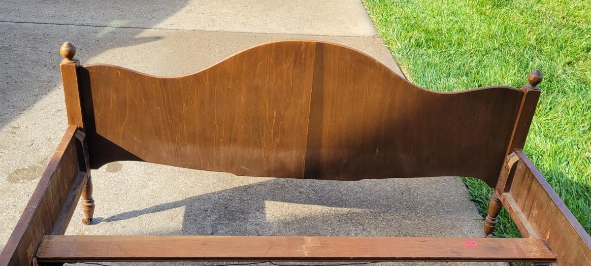 The bed frame is a full size bed frame. Veneer covering with some peeling of the veneer seen on one side rail. This can be seen in the photos.