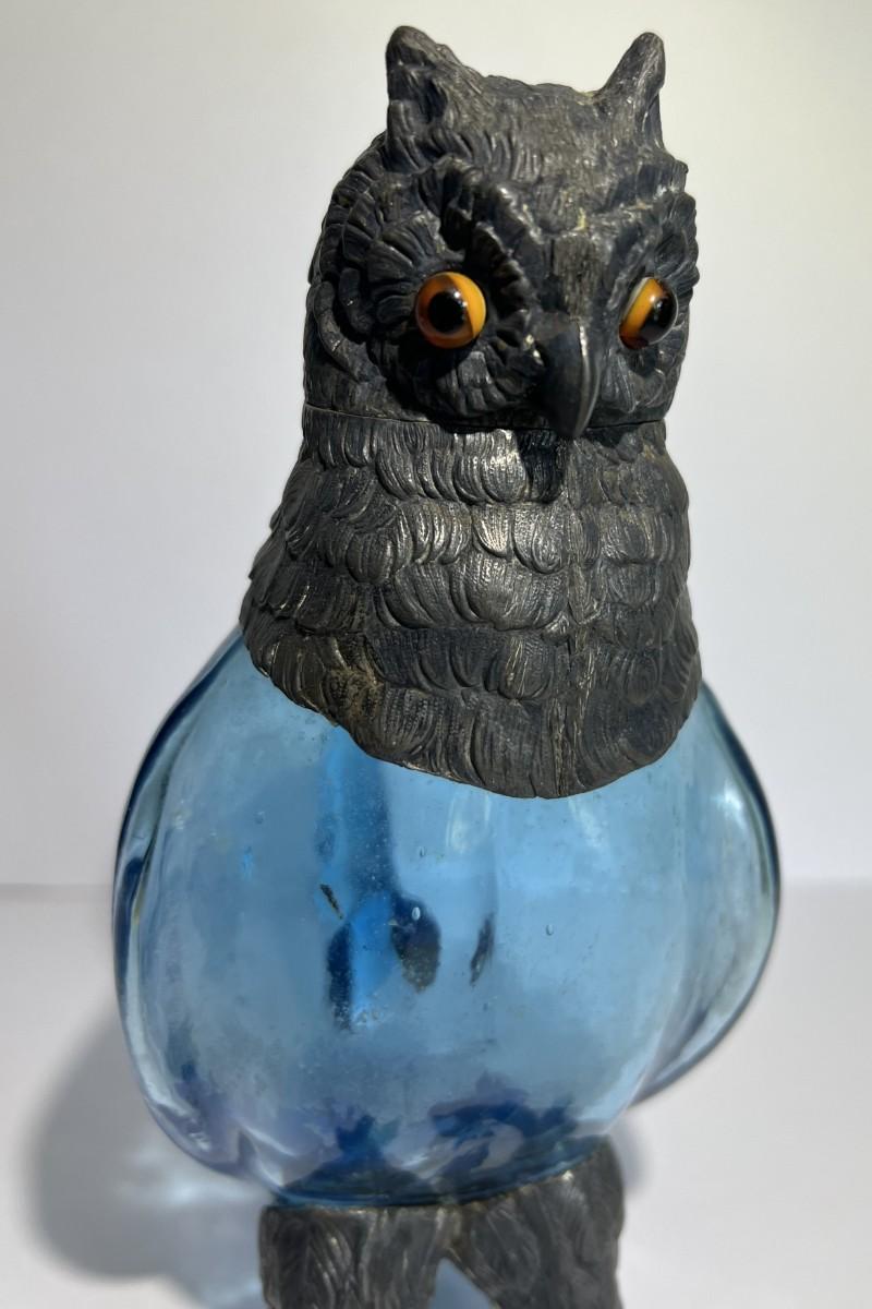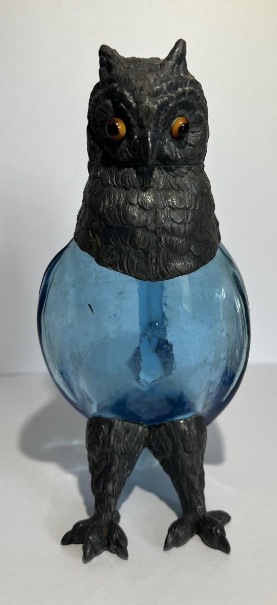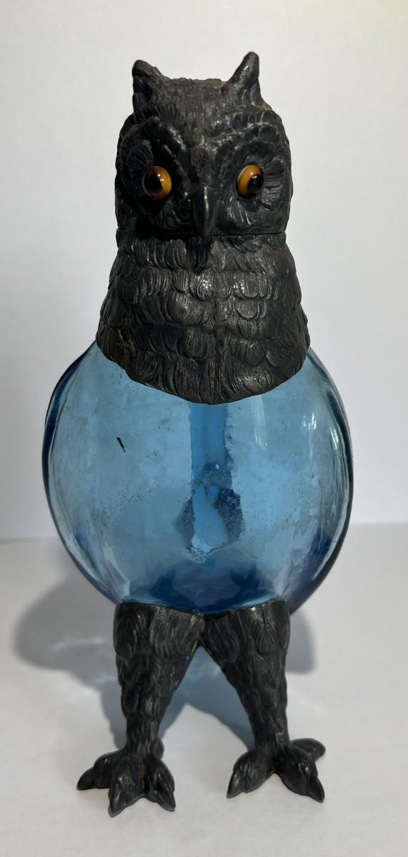 Antique Very Scarce Blue Glass Owl Decanter with Stopper 8" Tall in VG Preowned Condition. $20 Domestic Shipping.
