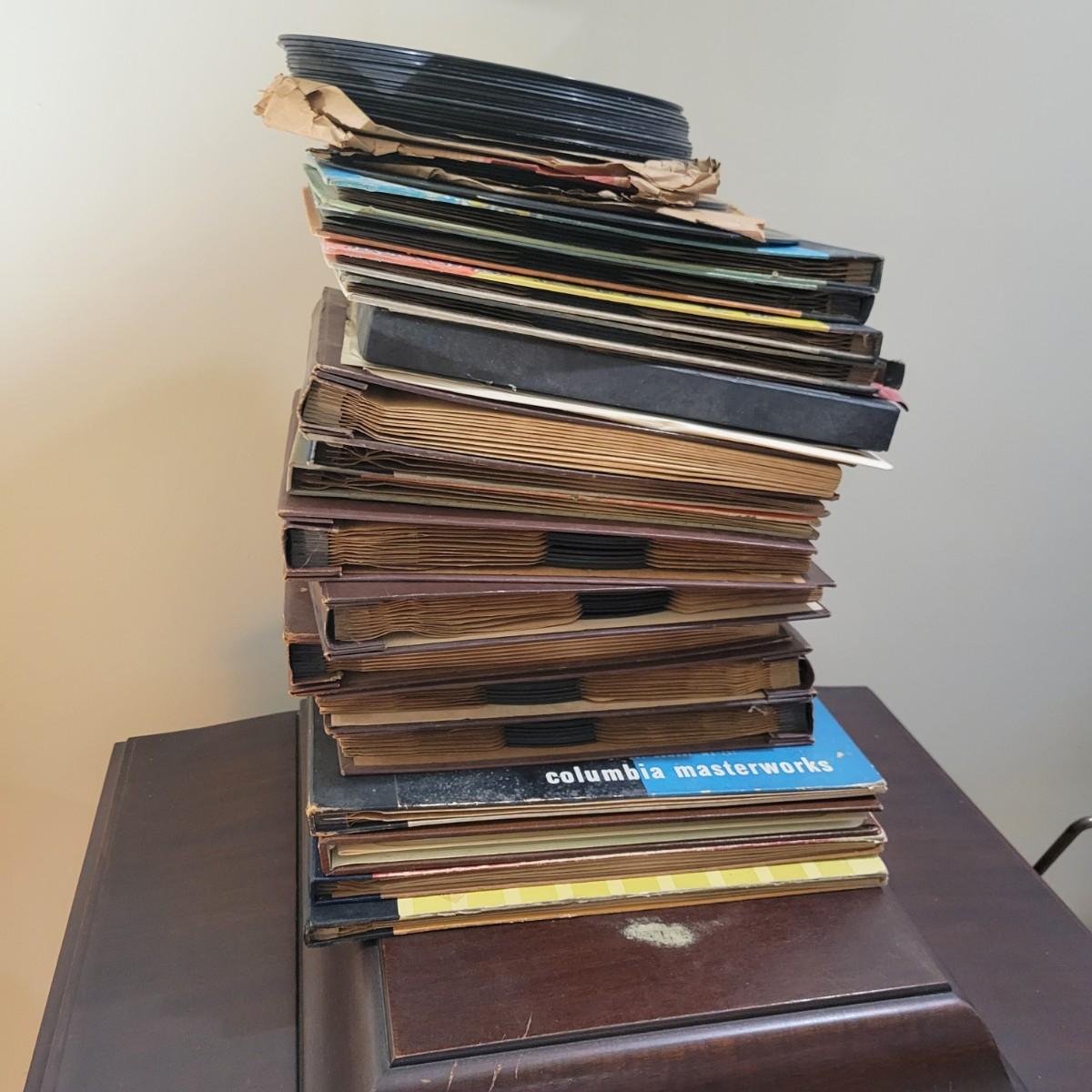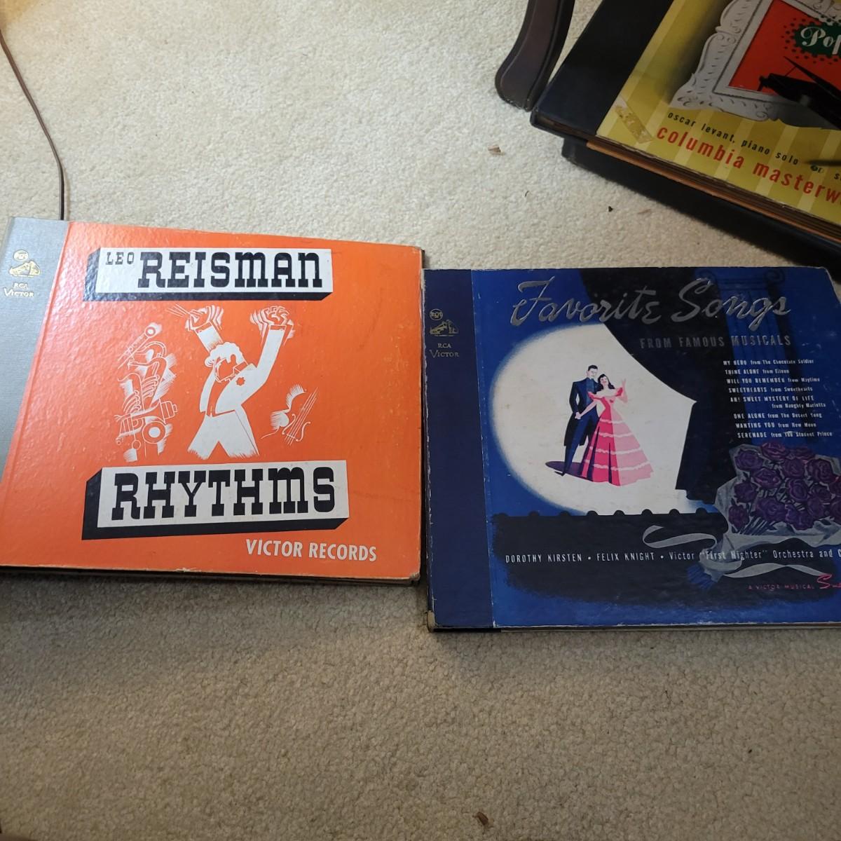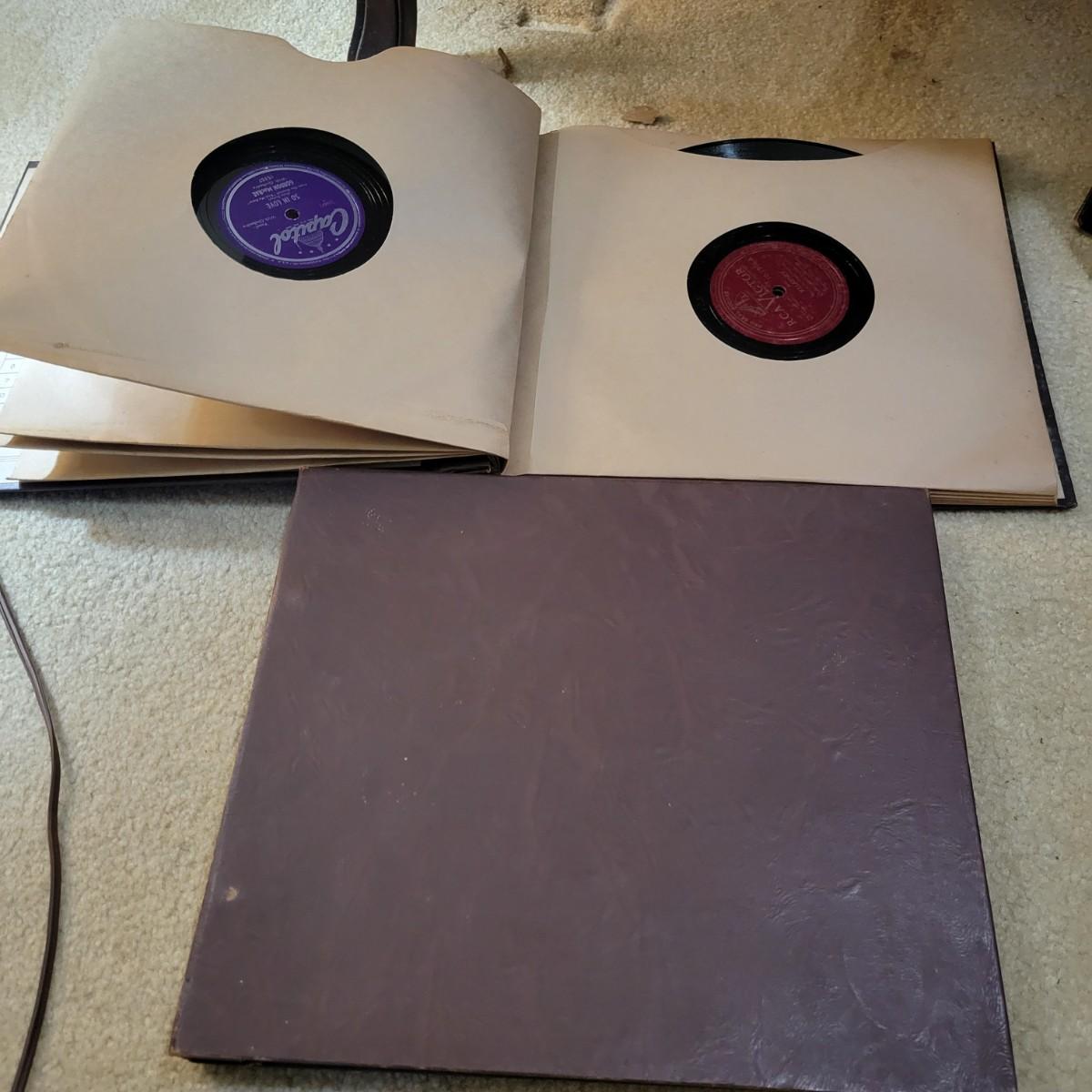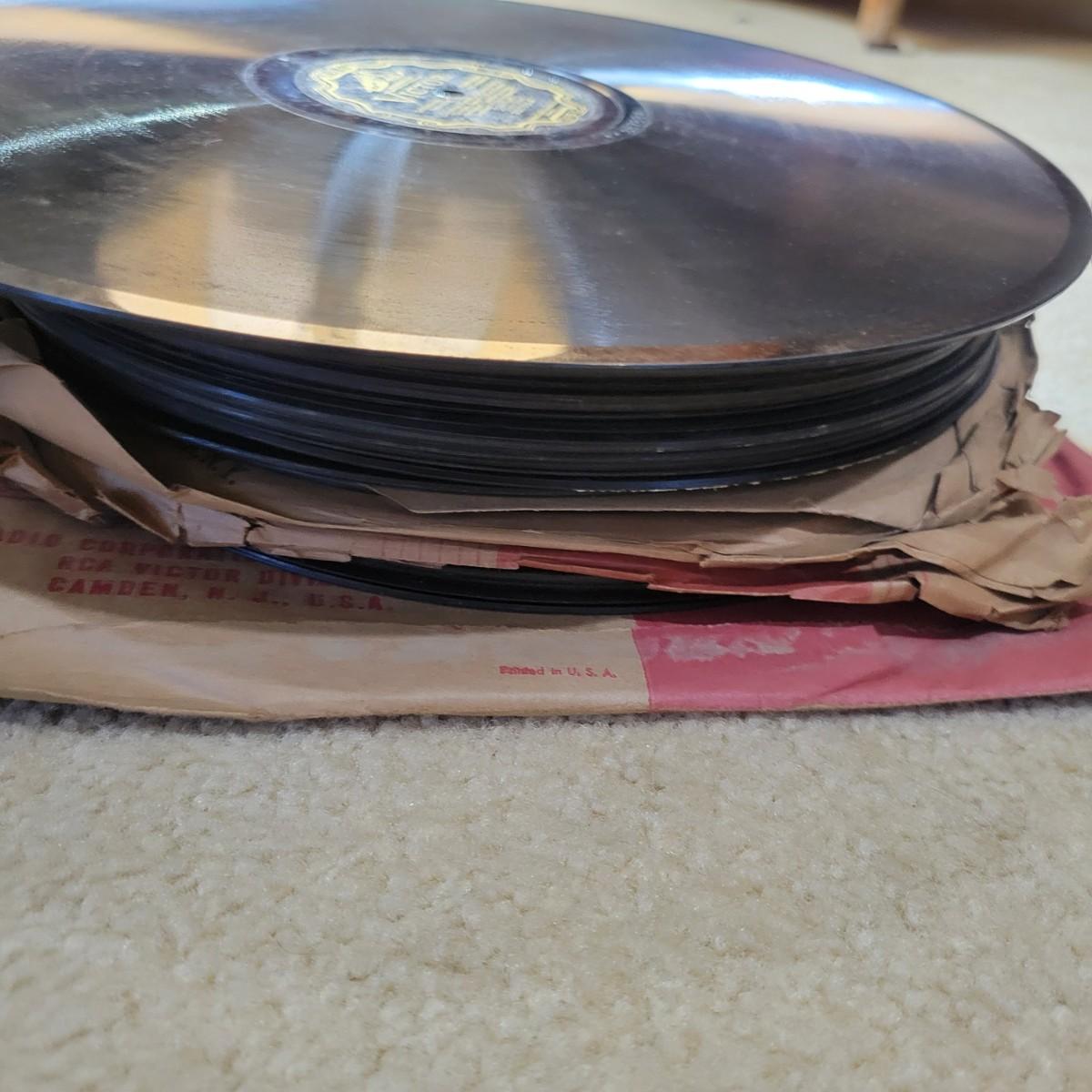 An antique Victor Talking Machine and Victrola recordings in good condition. The console cabinet does have some scratches and blemishes typical of a piece this age. The Victor Talking Machine model VV240 4132 is a humpback style console cabinet with nickel hardware. This item was tested and still works! Spring feels tight and creates a consistent speed. Included with the console is a cleaning pad and weights. Cabinet is a rich cherry stain and features three storage compartments. Also included in this lot is a plethora of victrola recordings. Over 80 recordings featuring Mario Lanza, Al Jolson, Gershon, Perry Como and many, many more. Local pickup only
