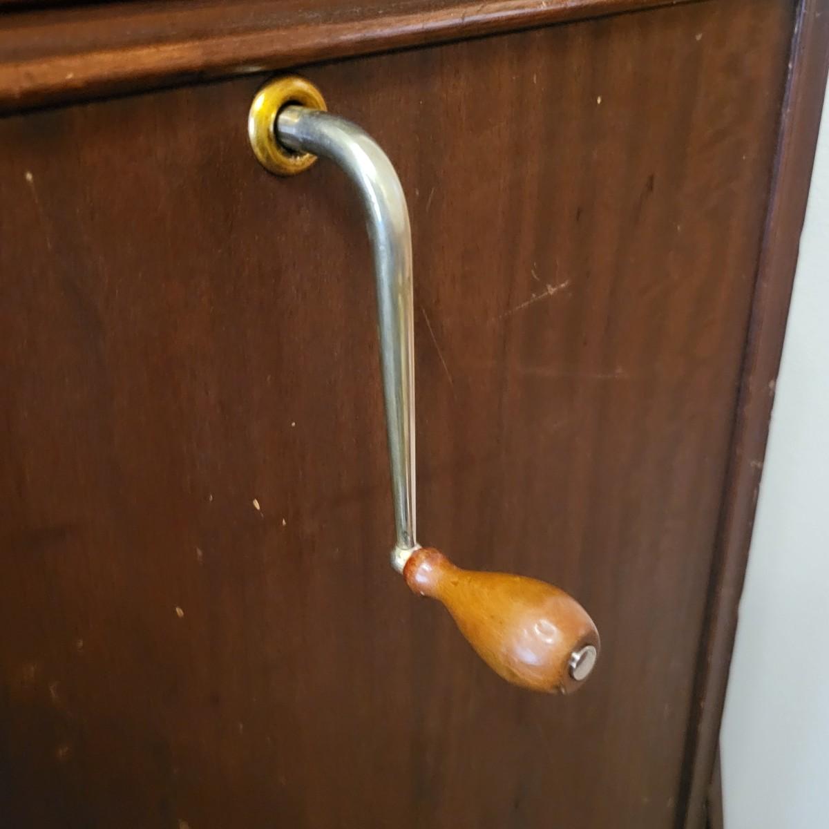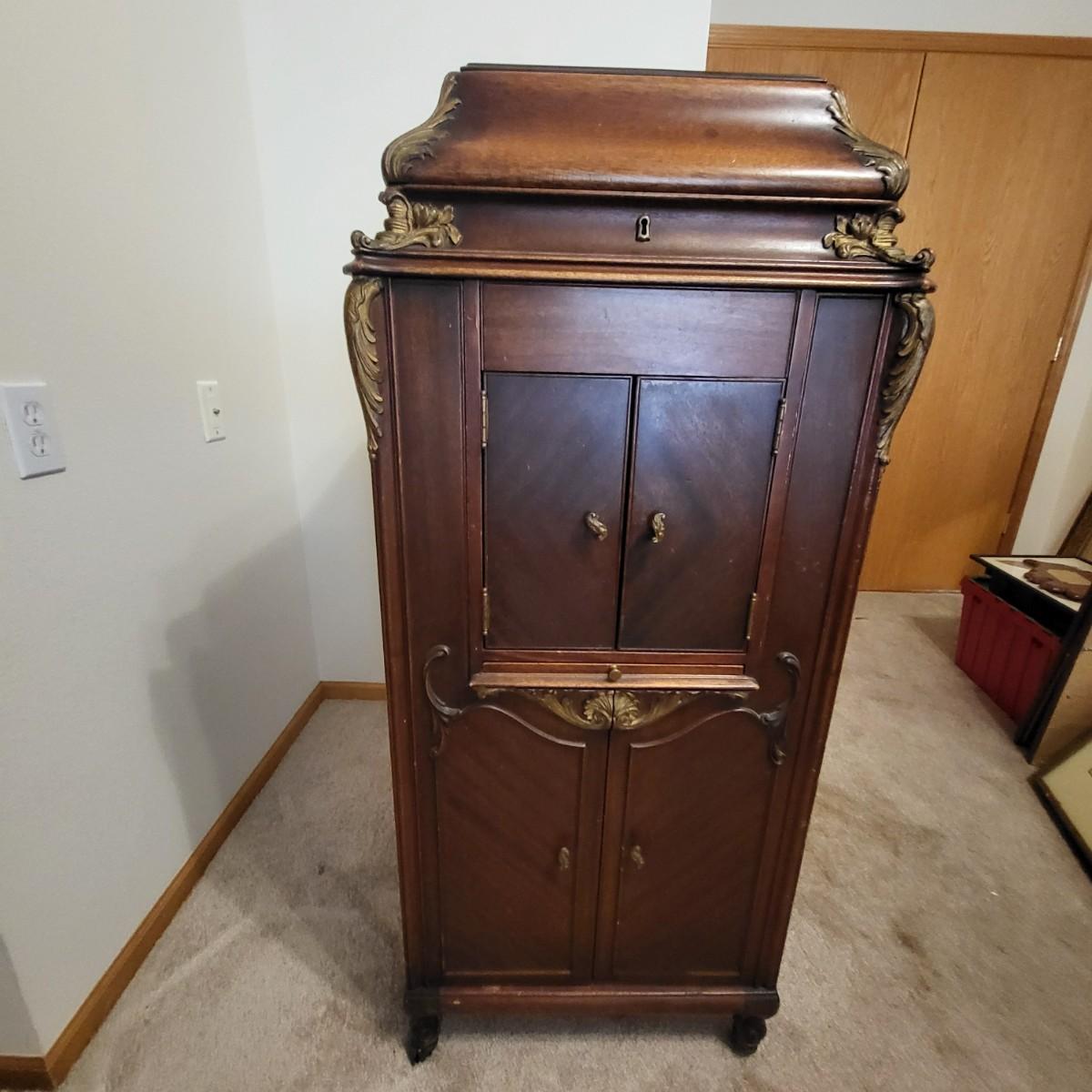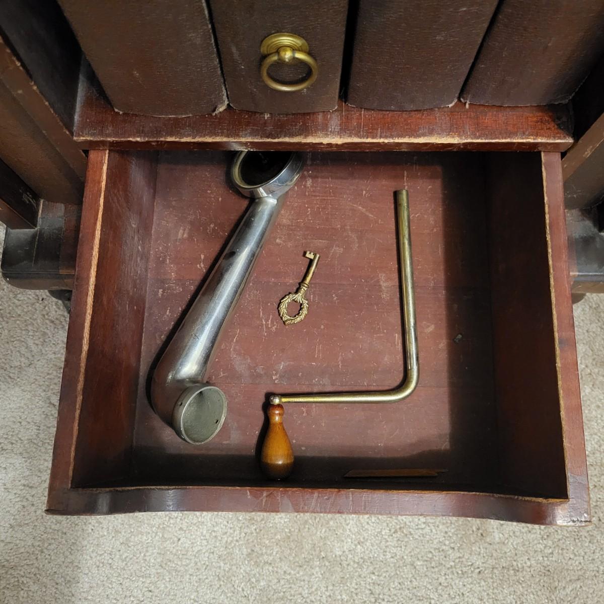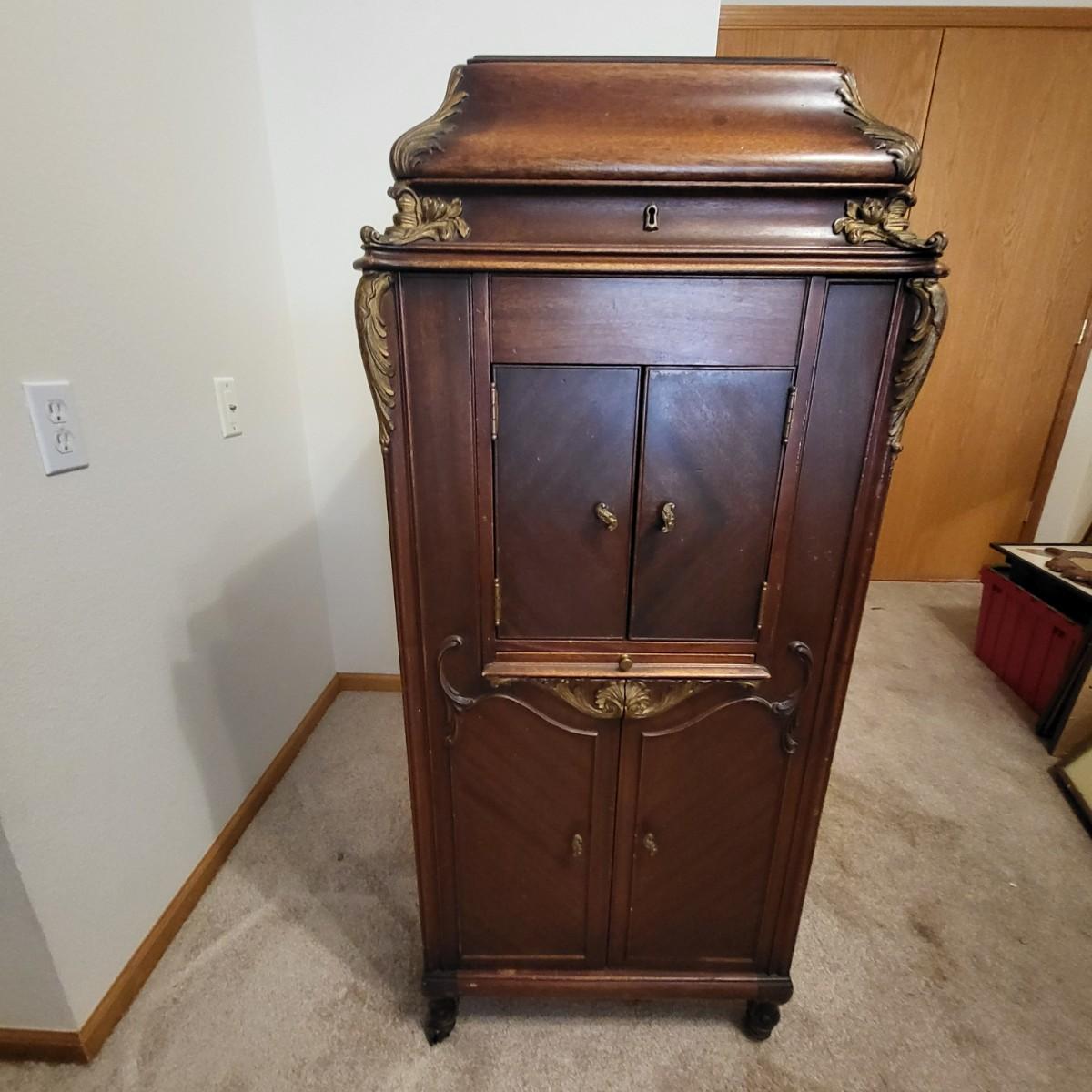 It appears it works but needs a little love and tune up to bri g it back to life. Measurements of cabinet when its closed is 20" wide x 48" tall x 22" deep. Has crank and key. Beautiful piece and hard to find with so many records, too!