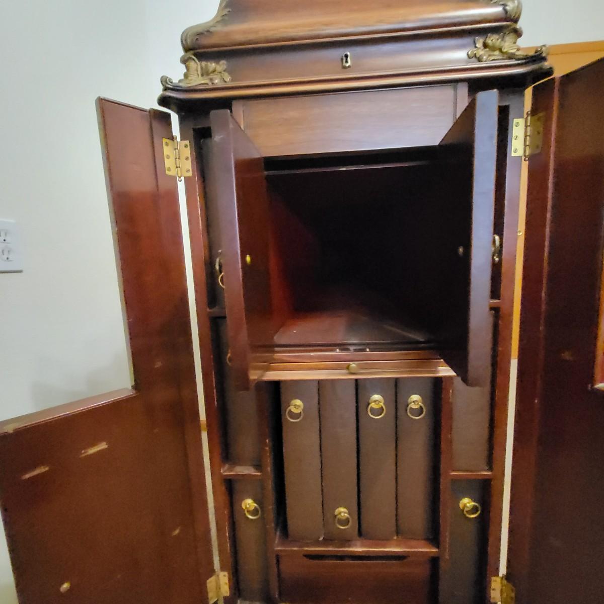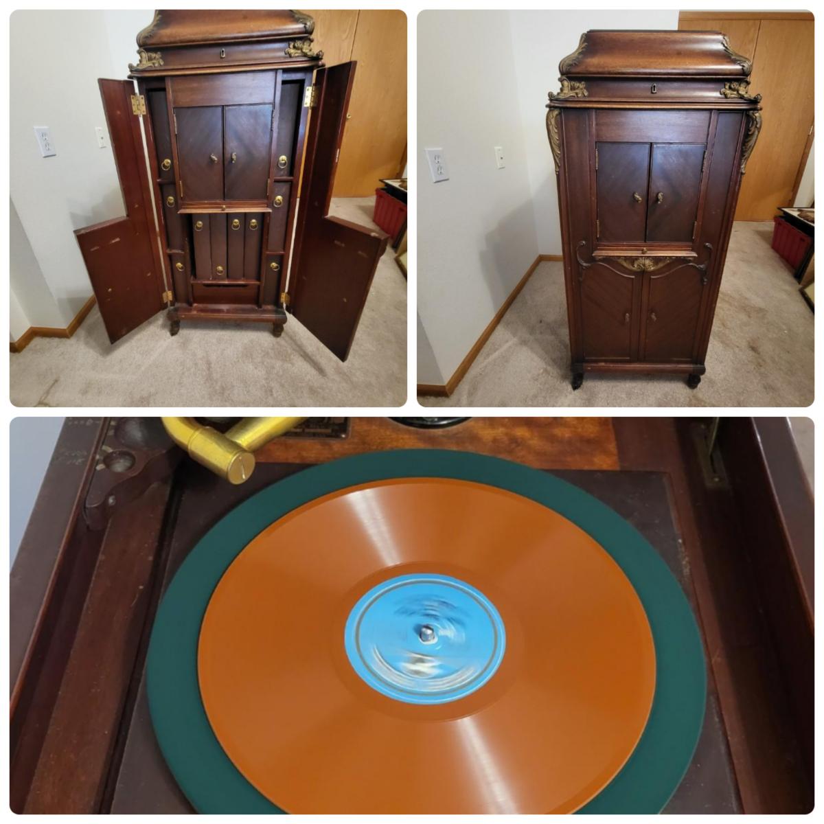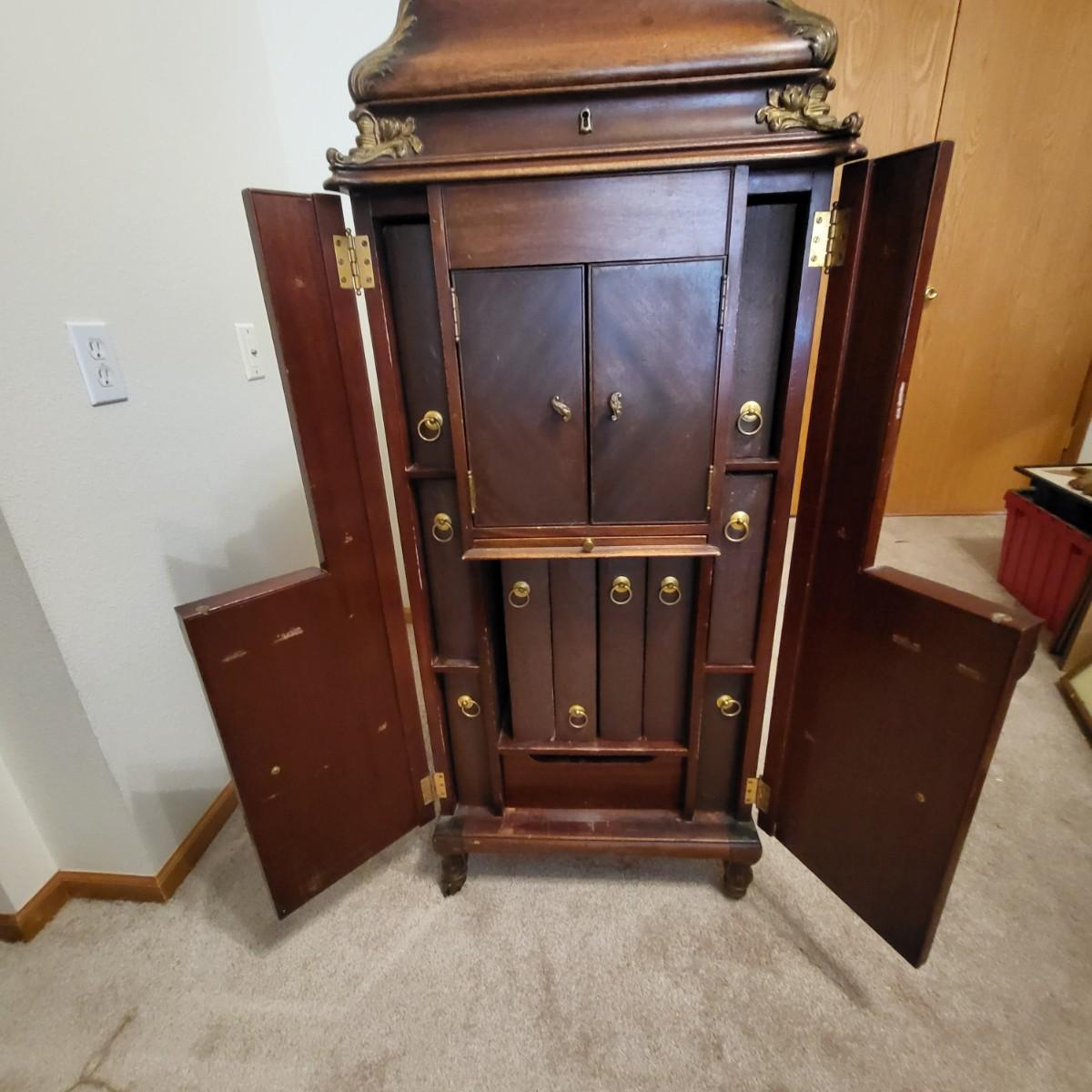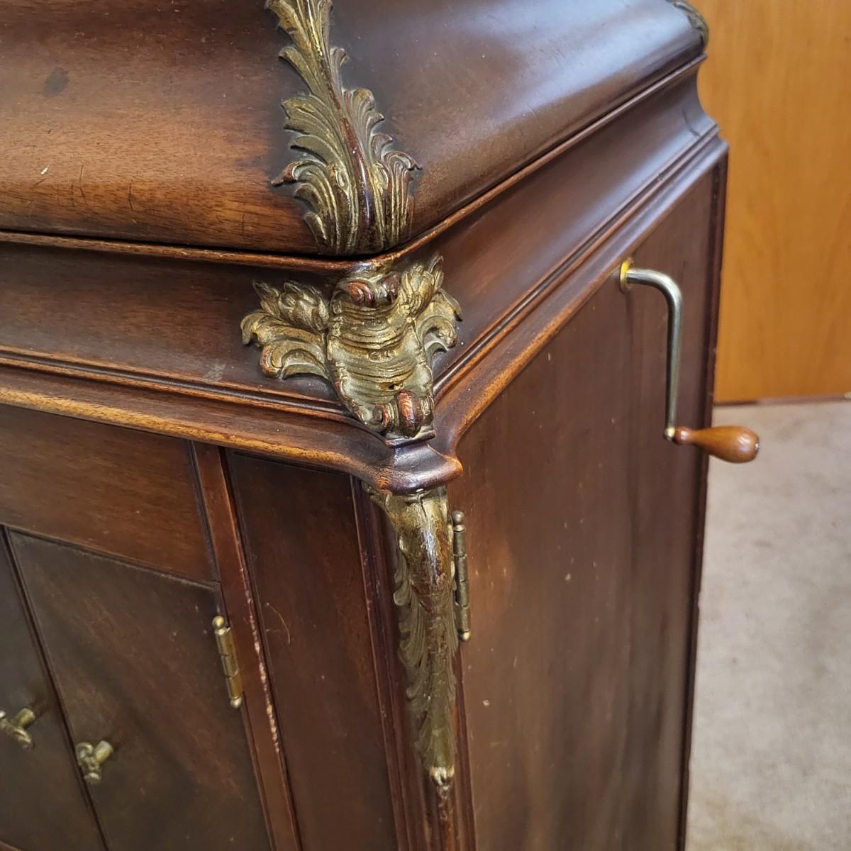 It appears it works but needs a little love and tune up to bri g it back to life. Measurements of cabinet when its closed is 20" wide x 48" tall x 22" deep. Has crank and key. Beautiful piece and hard to find with so many records, too!
