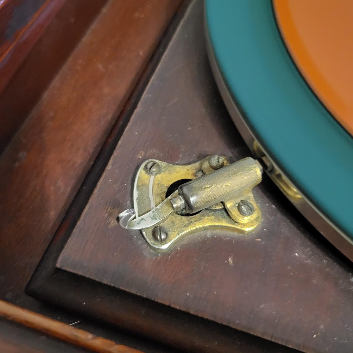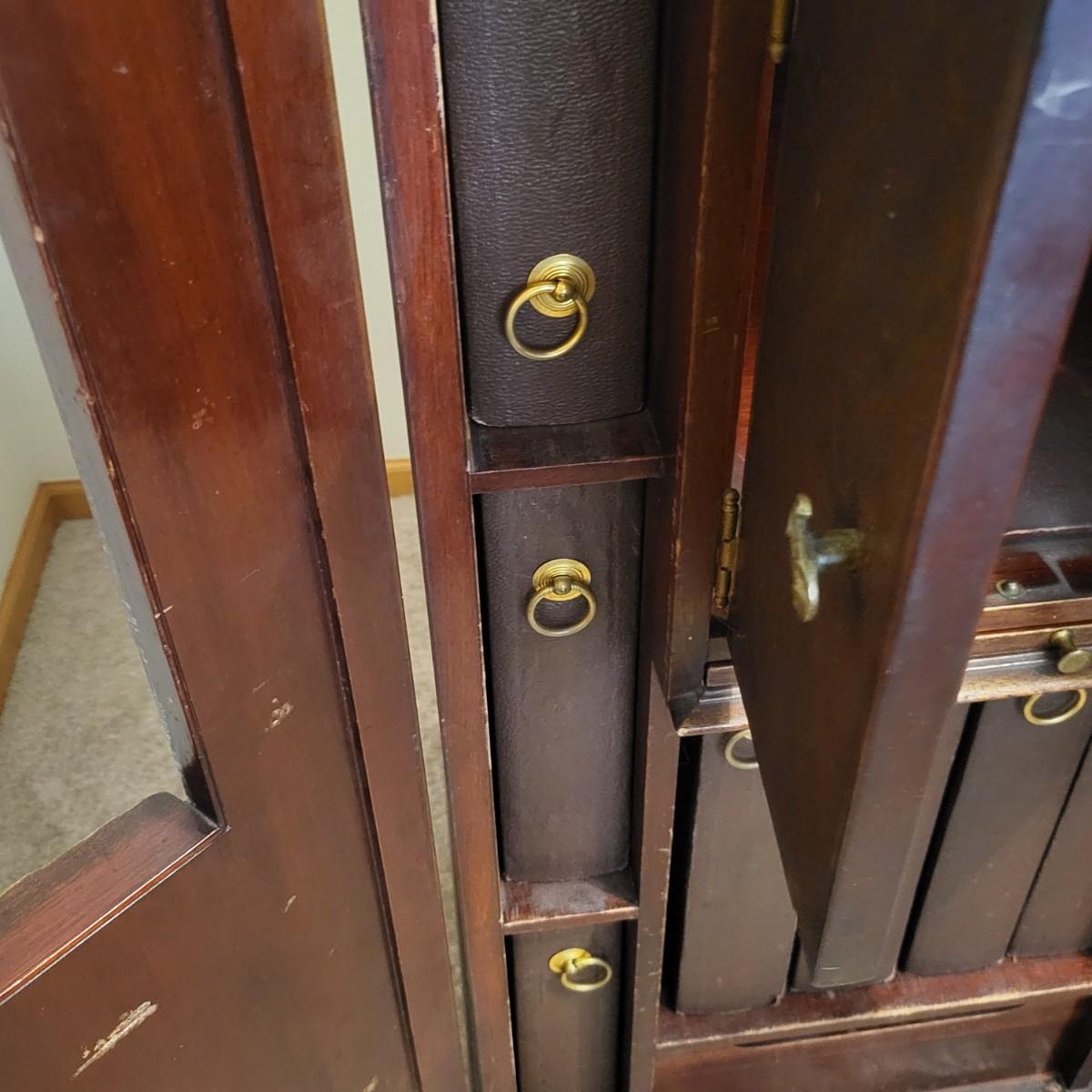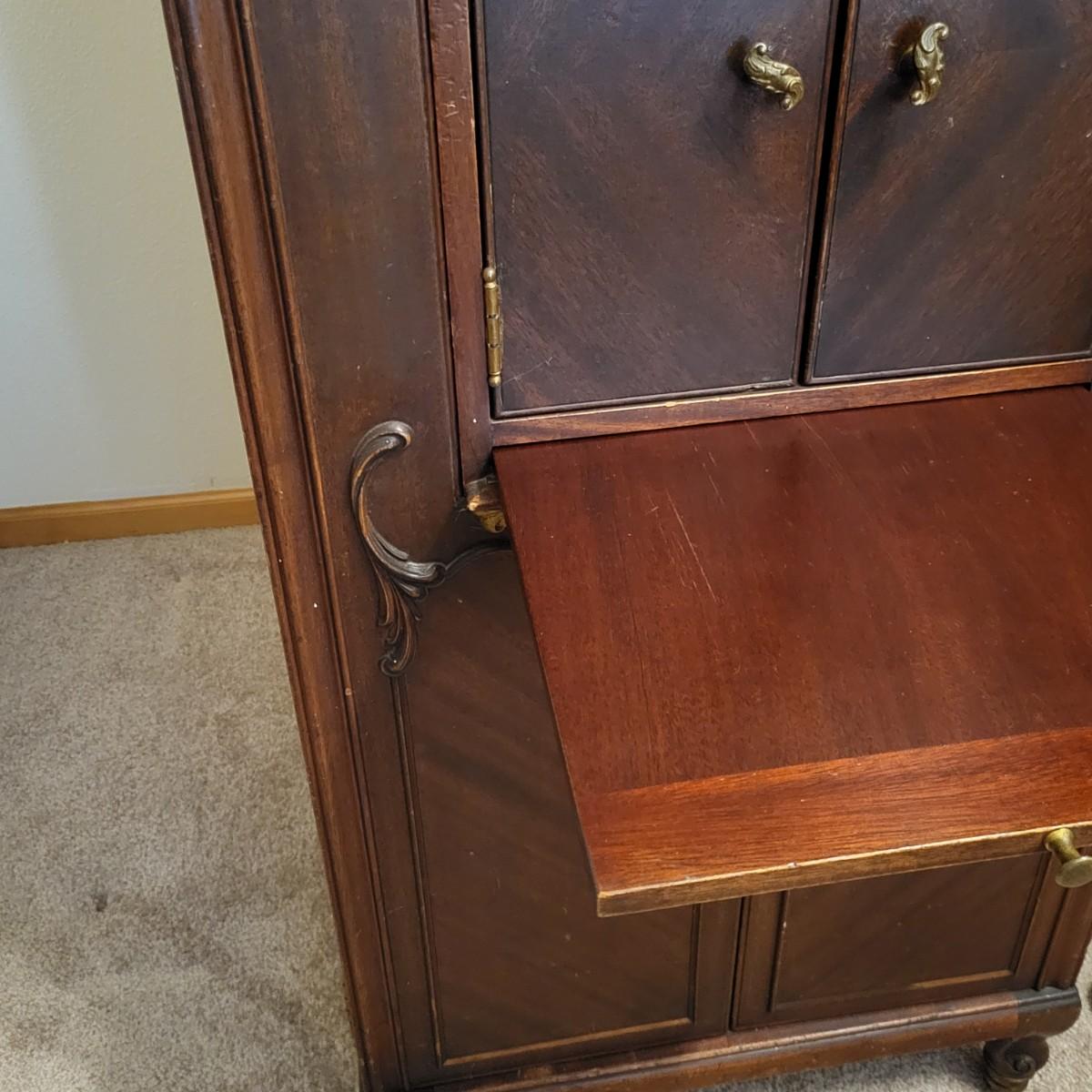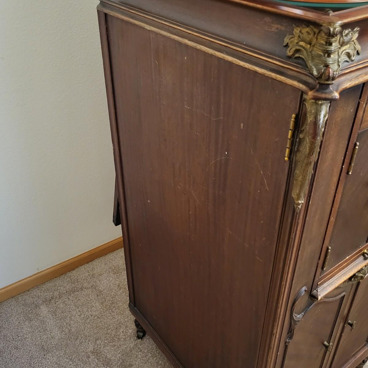 It appears it works but needs a little love and tune up to bri g it back to life. Measurements of cabinet when its closed is 20" wide x 48" tall x 22" deep. Has crank and key. Beautiful piece and hard to find with so many records, too!