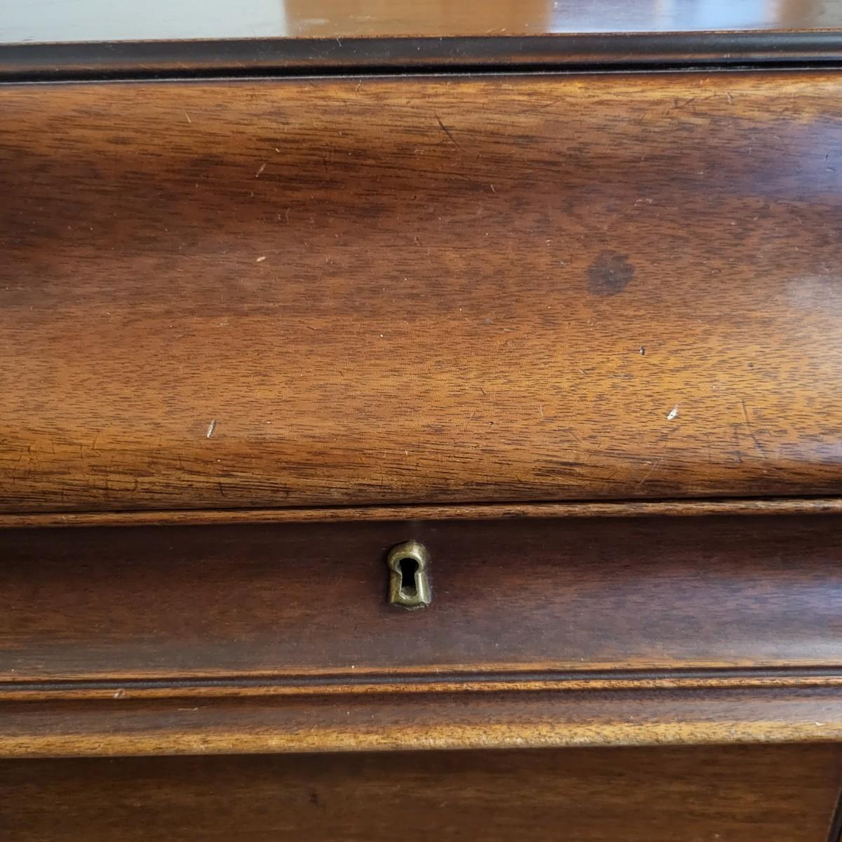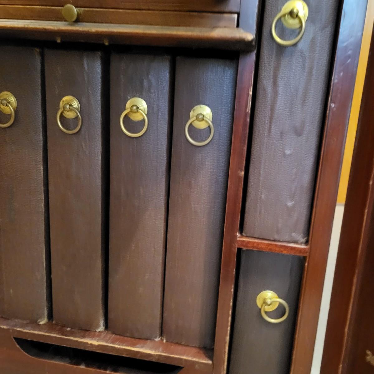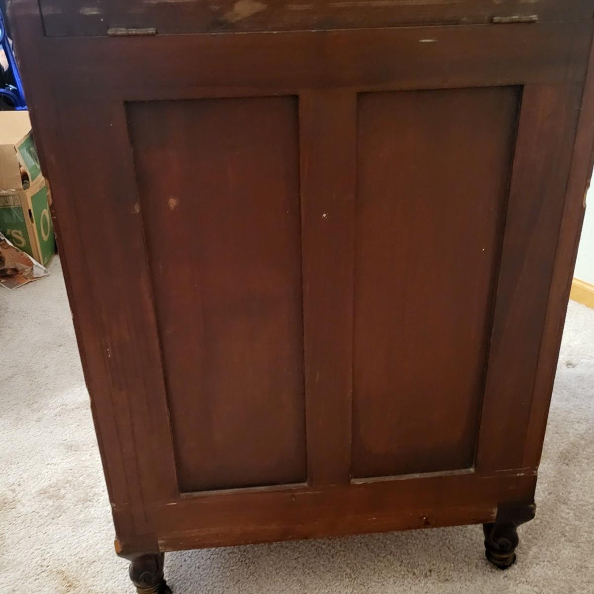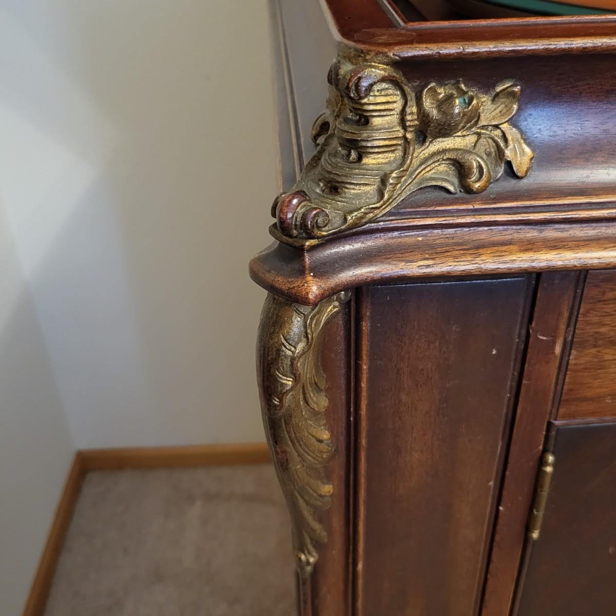 It appears it works but needs a little love and tune up to bri g it back to life. Measurements of cabinet when its closed is 20" wide x 48" tall x 22" deep. Has crank and key. Beautiful piece and hard to find with so many records, too!