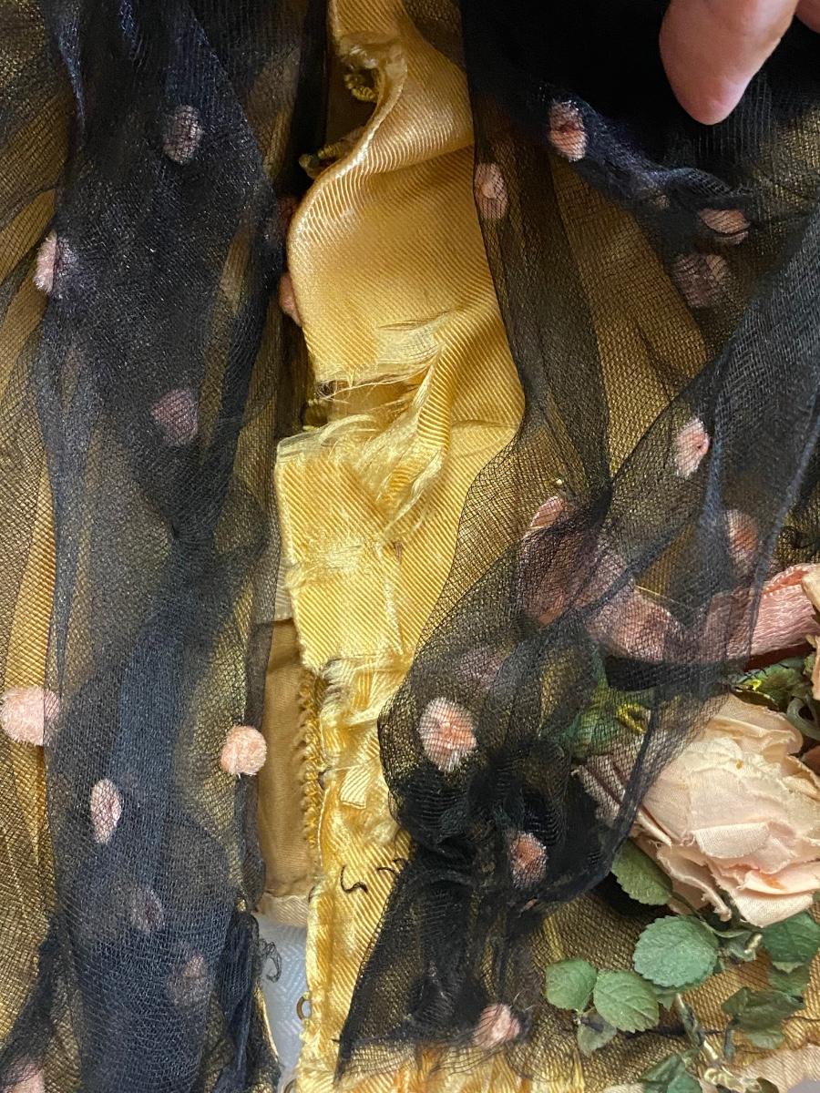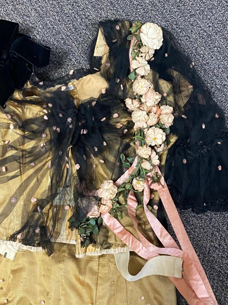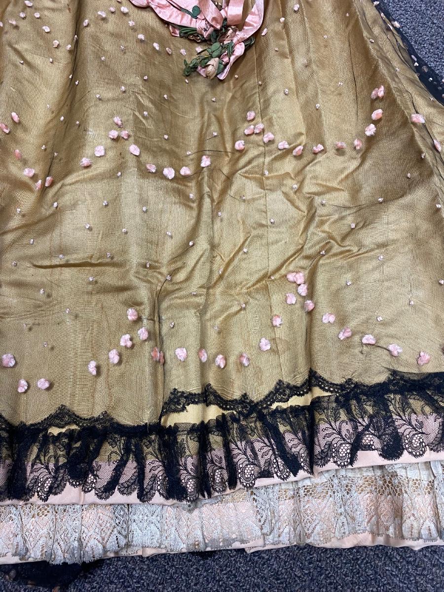 Antique Victorian Art Nouveau Romantic Two-Piece Bodice & Skirt Fancy Party Gala Dress. Fine mesh black lace with a beige lining and pink floral adornments. Bodice has faux flowers and ribbon on one side but it looks like it may have been added. Small size won't fit size 8 mannequin. Bodice is under 12" at waist, skirt is about 12". Boned lining with maker label still readable. In good antique condition, may have discolor and small holes but no major damage was noted. Fine lace is delicate from age.
