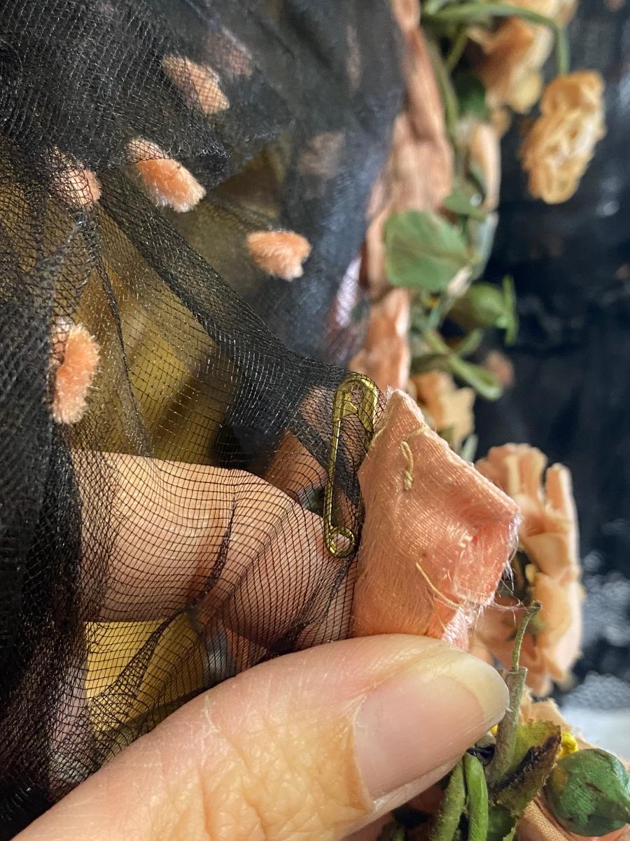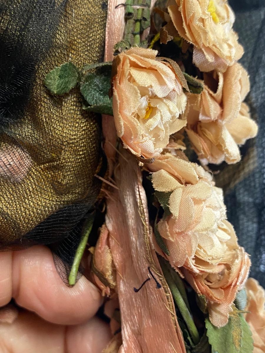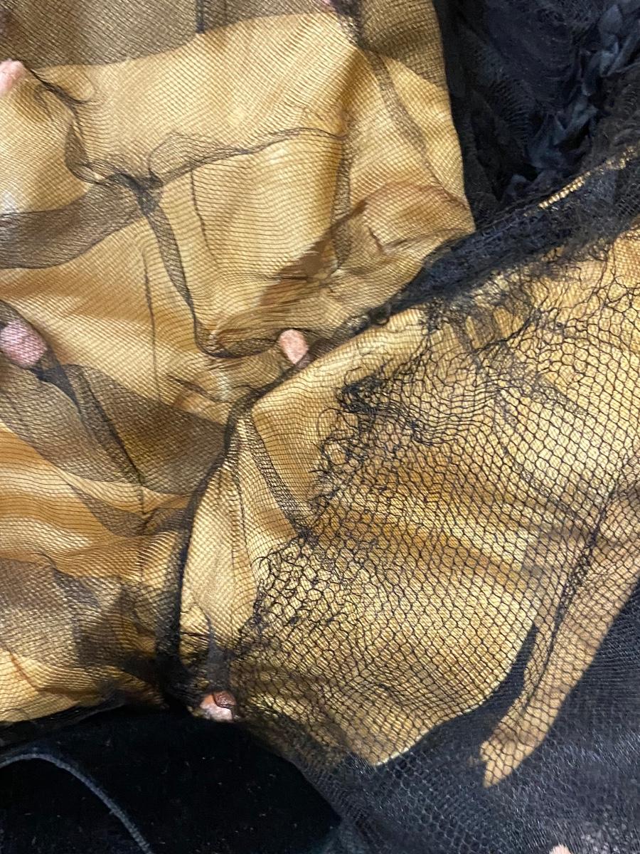 Antique Victorian Art Nouveau Romantic Two-Piece Bodice & Skirt Fancy Party Gala Dress. Fine mesh black lace with a beige lining and pink floral adornments. Bodice has faux flowers and ribbon on one side but it looks like it may have been added. Small size won't fit size 8 mannequin. Bodice is under 12" at waist, skirt is about 12". Boned lining with maker label still readable. In good antique condition, may have discolor and small holes but no major damage was noted. Fine lace is delicate from age.