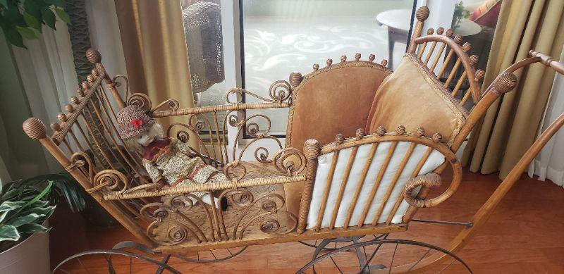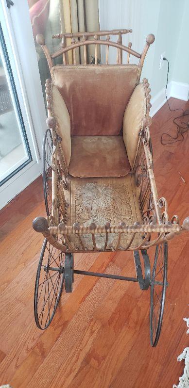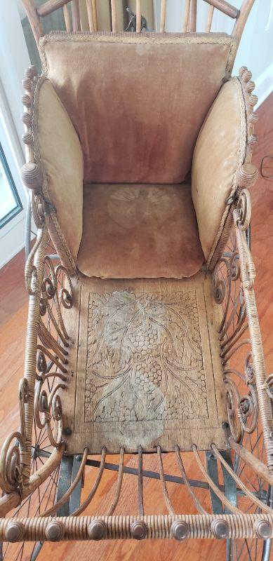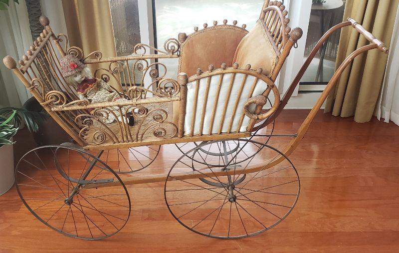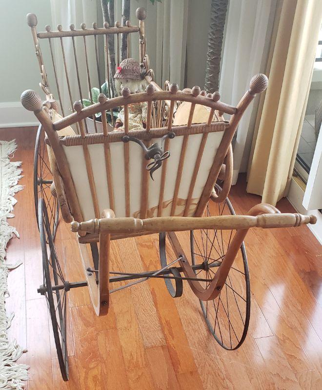 Antique Victorian Baby Buggy Stroller Carriage Pram Wood Metal Wheels Stick Ball