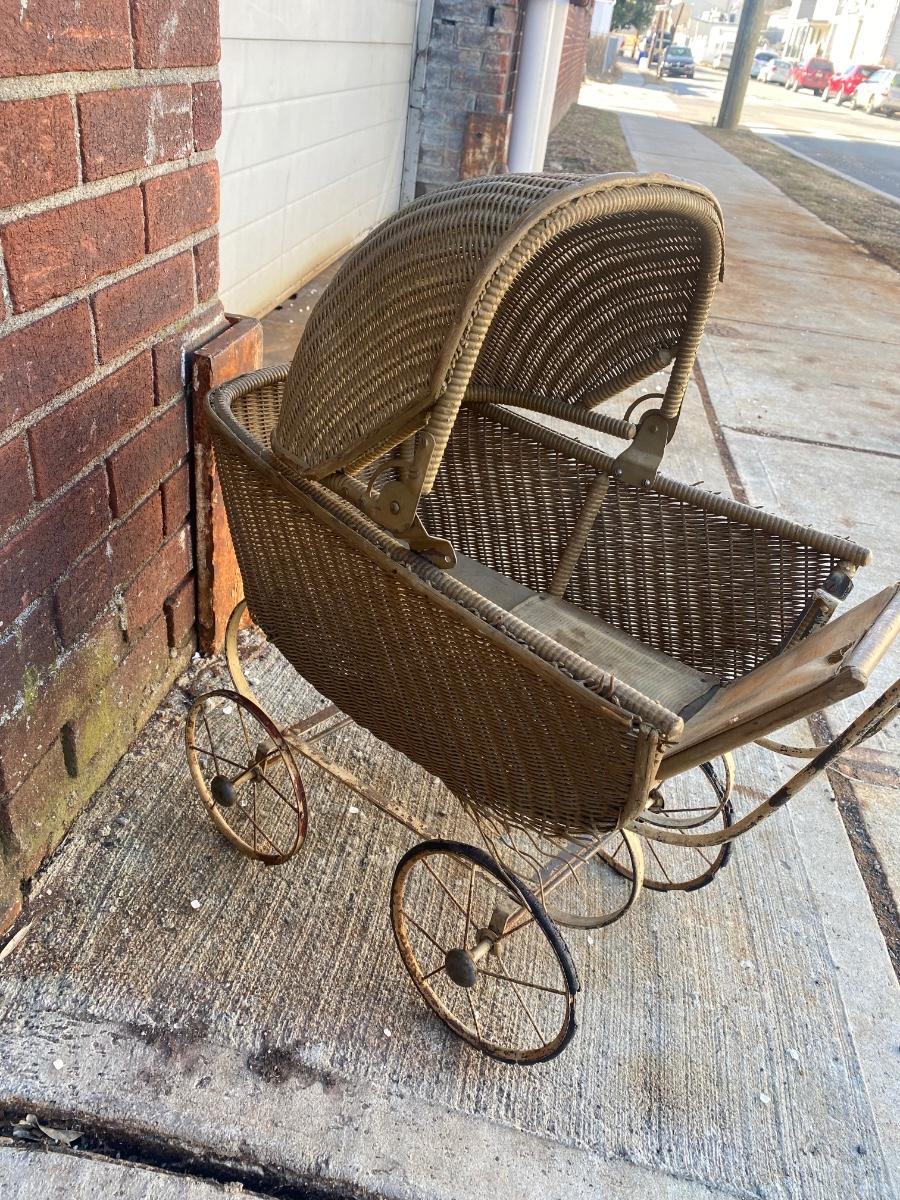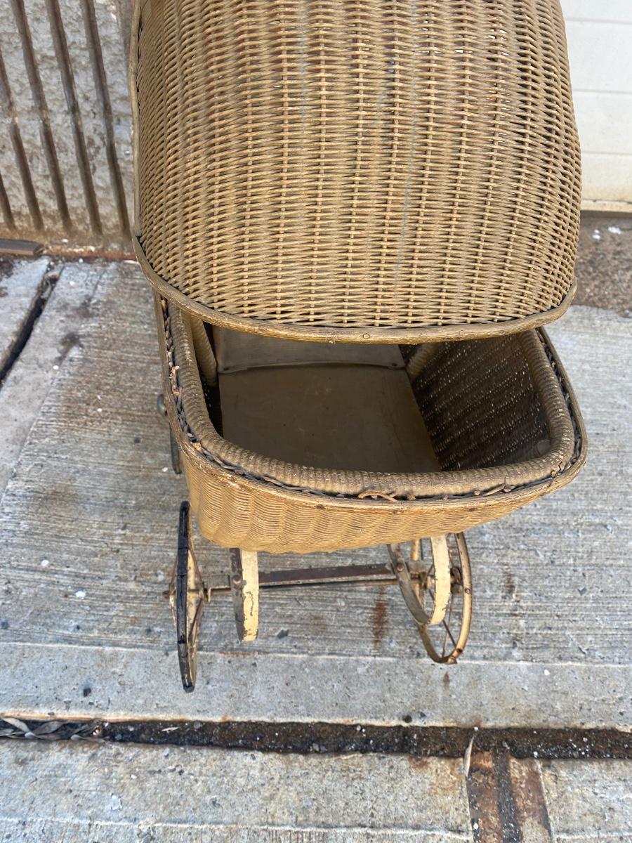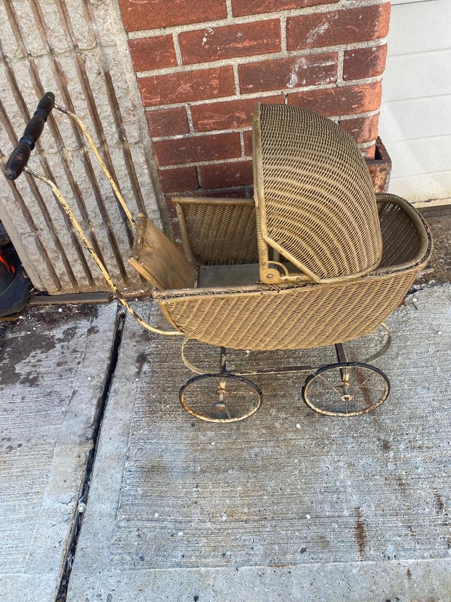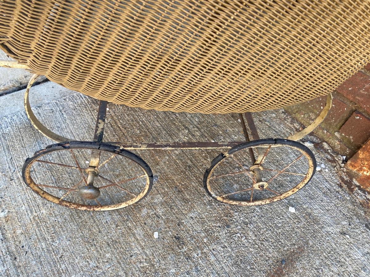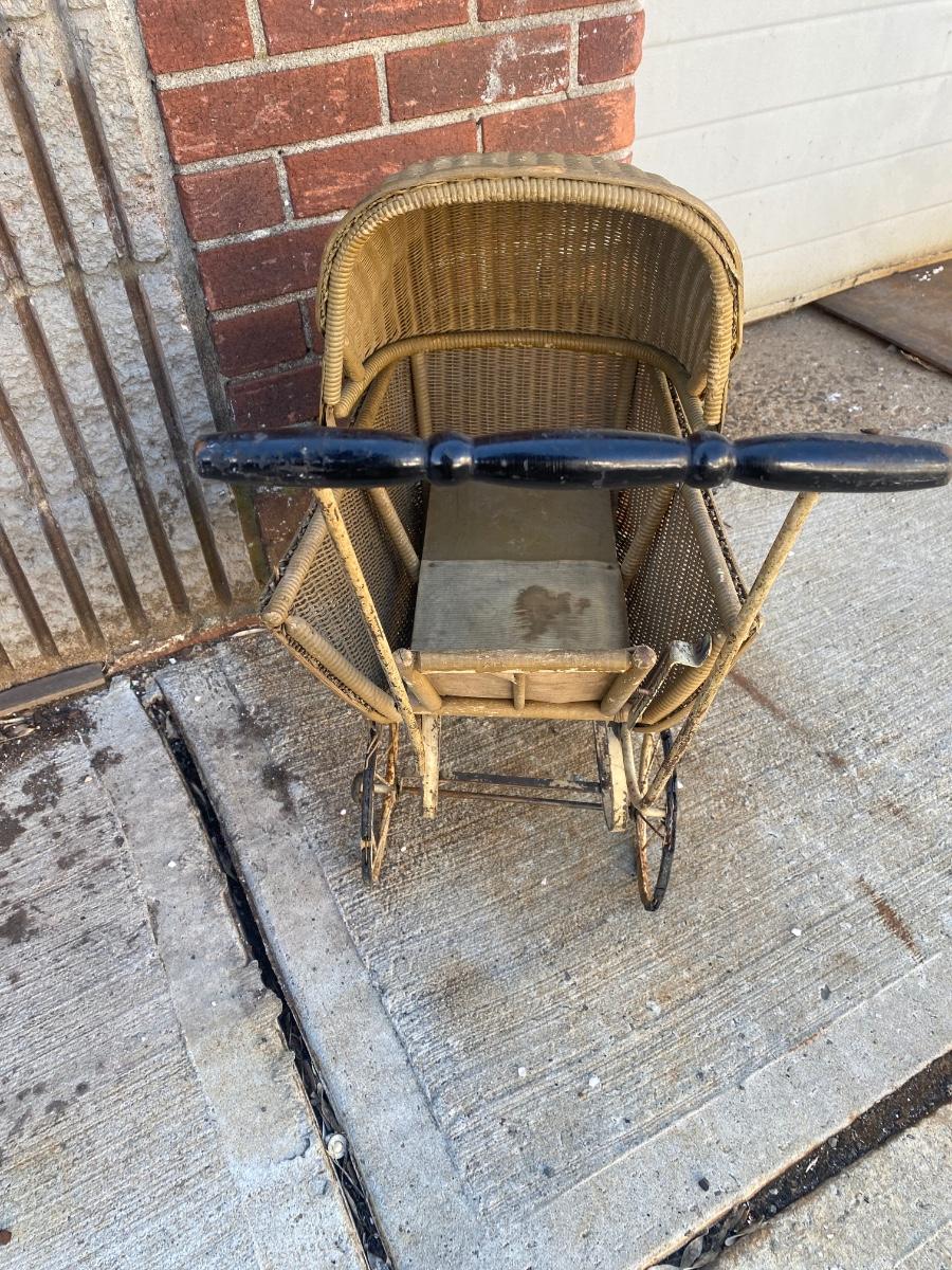 This antique Victorian baby doll stroller is a beautiful piece made of wicker and rattan, with metal accents. Foot rest is adjustable and top part is movable . Solid wood handle. Great for your antique doll display.