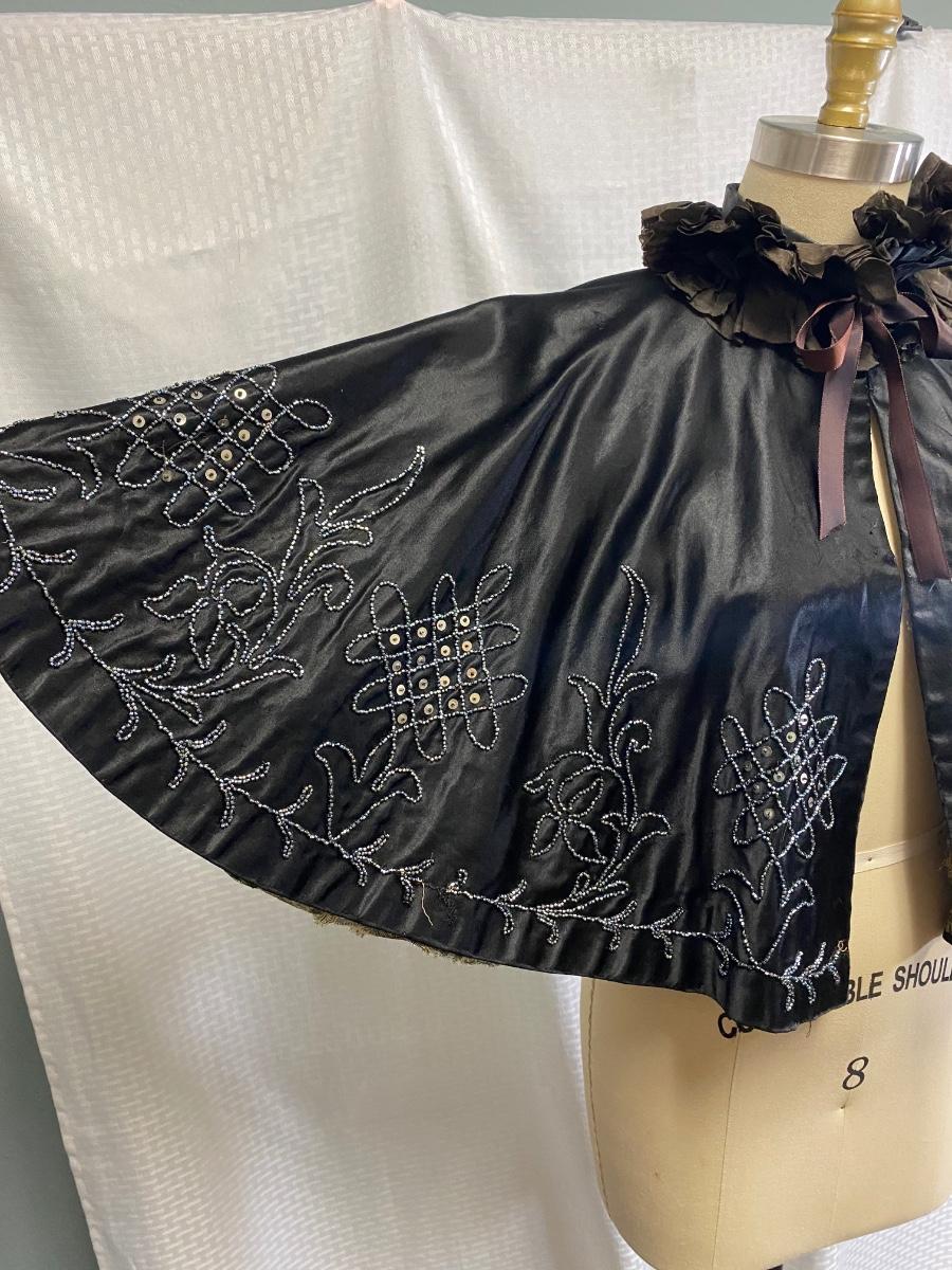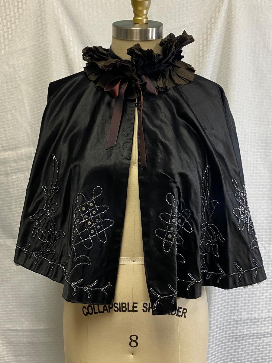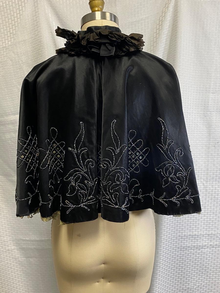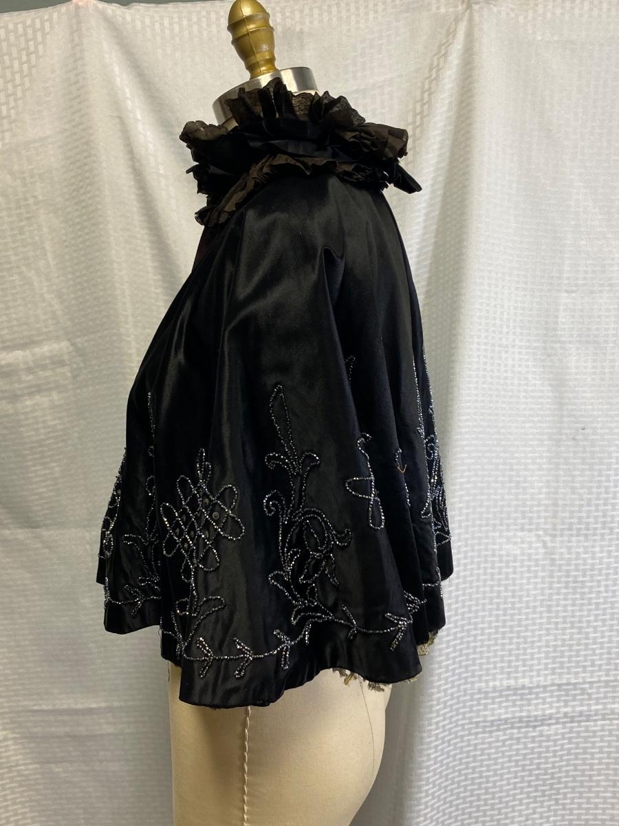 Antique Victorian Black Beaded Shoulder Cape Shawl. Neck hook and eye closure with ribbon tie. Beautifully hand beaded design. Lined in a paisley fabric. The outer fabric is in very good antique condition. The inside fabric is falling apart from age. Sits about hip level.