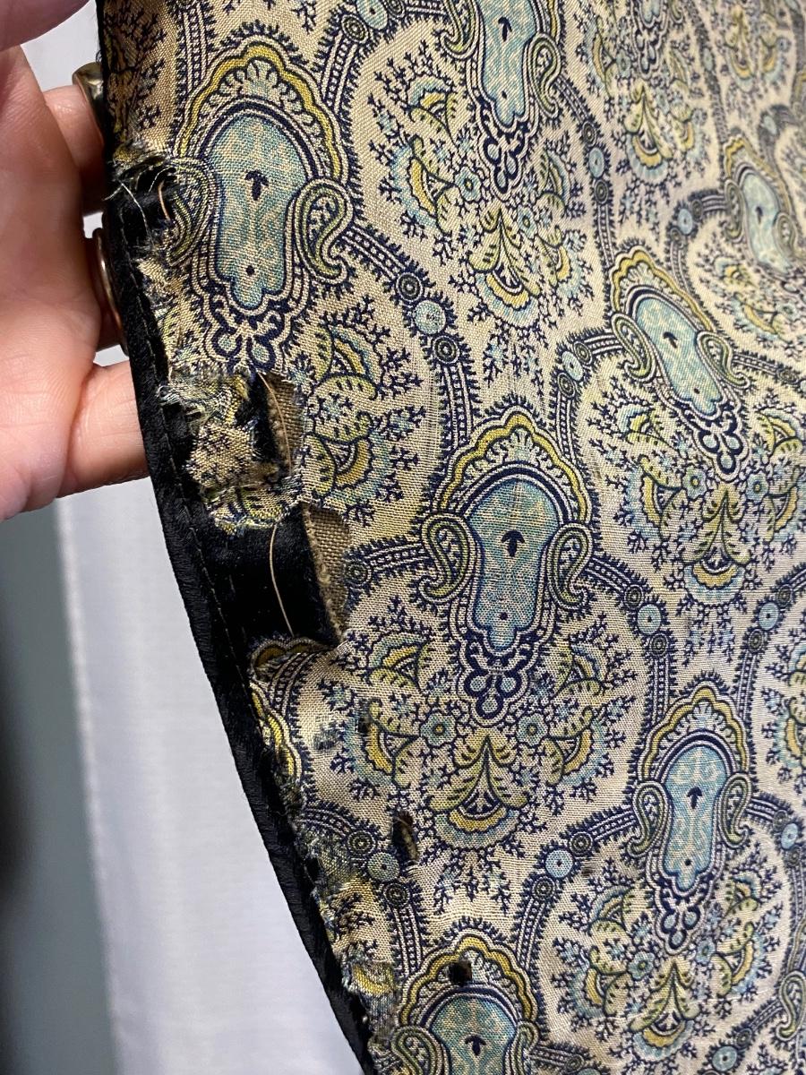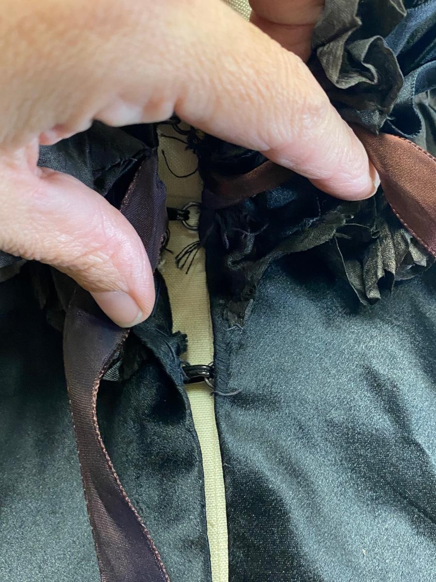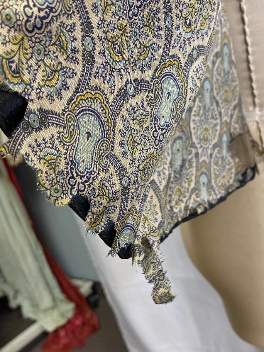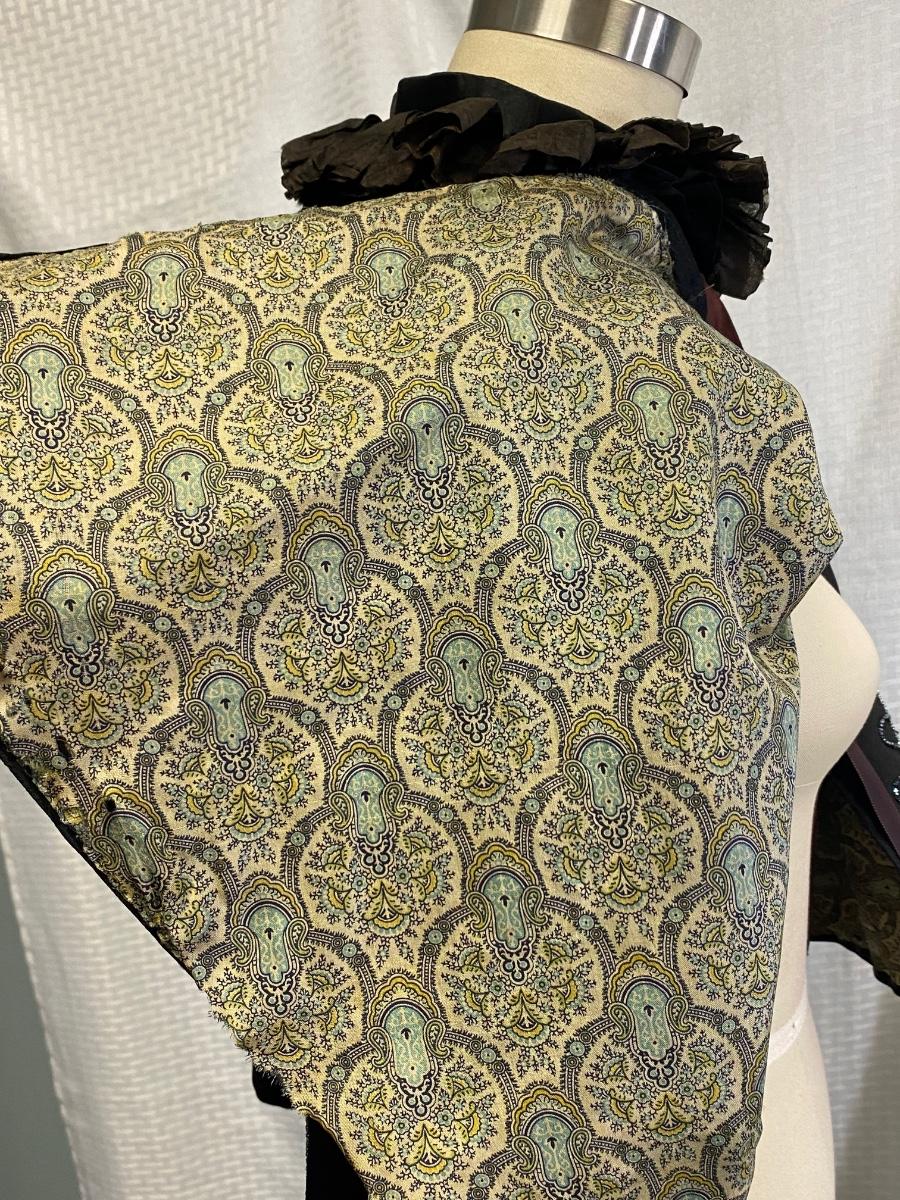 Antique Victorian Black Beaded Shoulder Cape Shawl. Neck hook and eye closure with ribbon tie. Beautifully hand beaded design. Lined in a paisley fabric. The outer fabric is in very good antique condition. The inside fabric is falling apart from age. Sits about hip level.