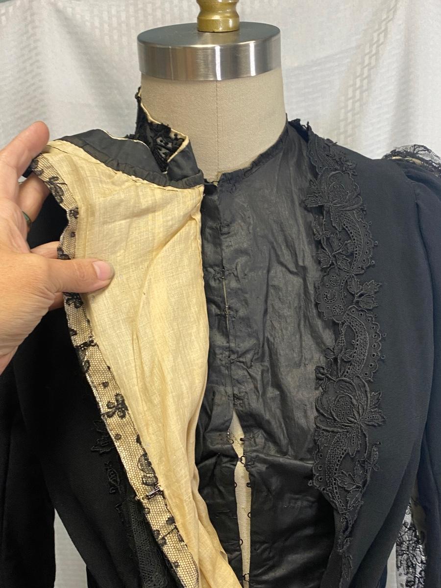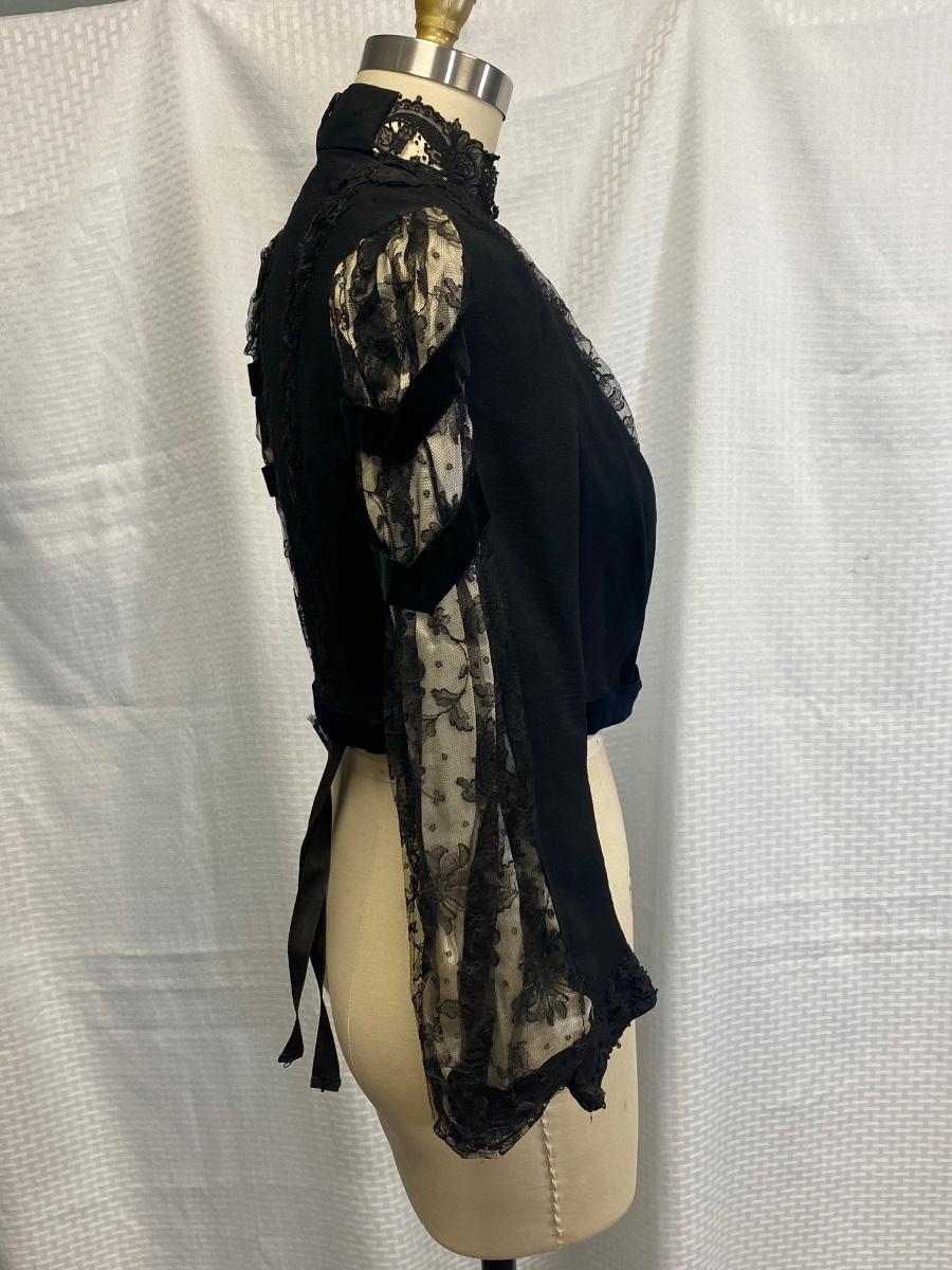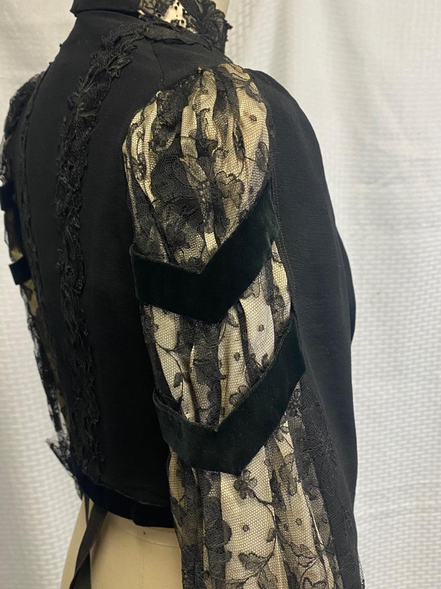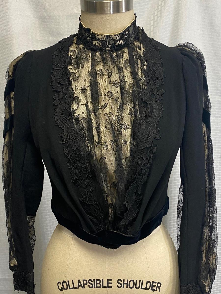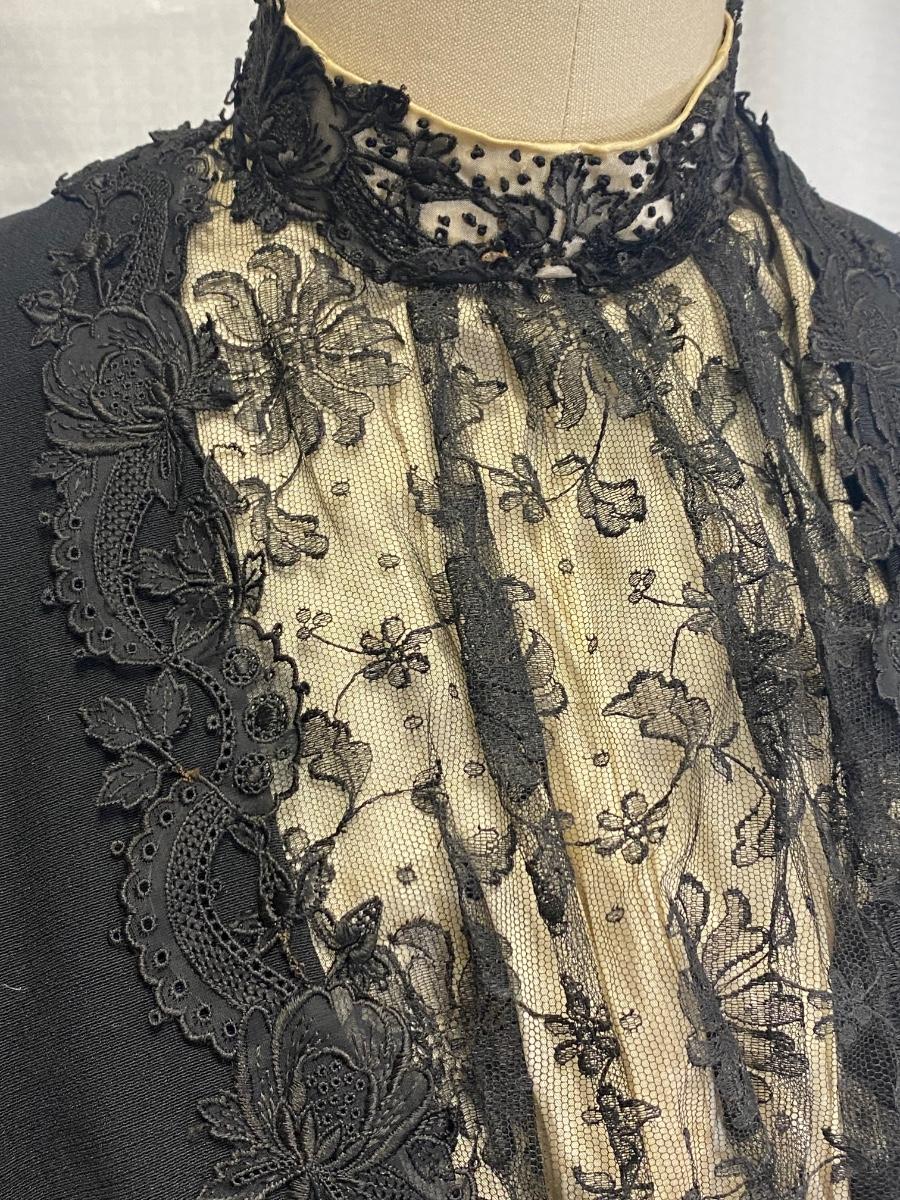 Antique Victorian Black Lace Mourning Gothic Long Sleeve Blouse Bodice Top. In overall good antique condition, no major damage, some very minor holes. Black lace with white cotton contrast underneath. Fits the size 8 mannequin well. Hook and eye closures may need some replaced or restitched. In wearable condition if worn with care.