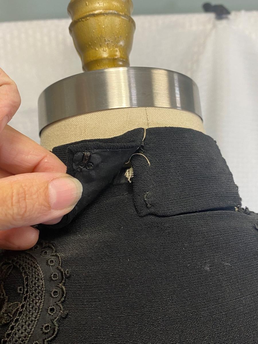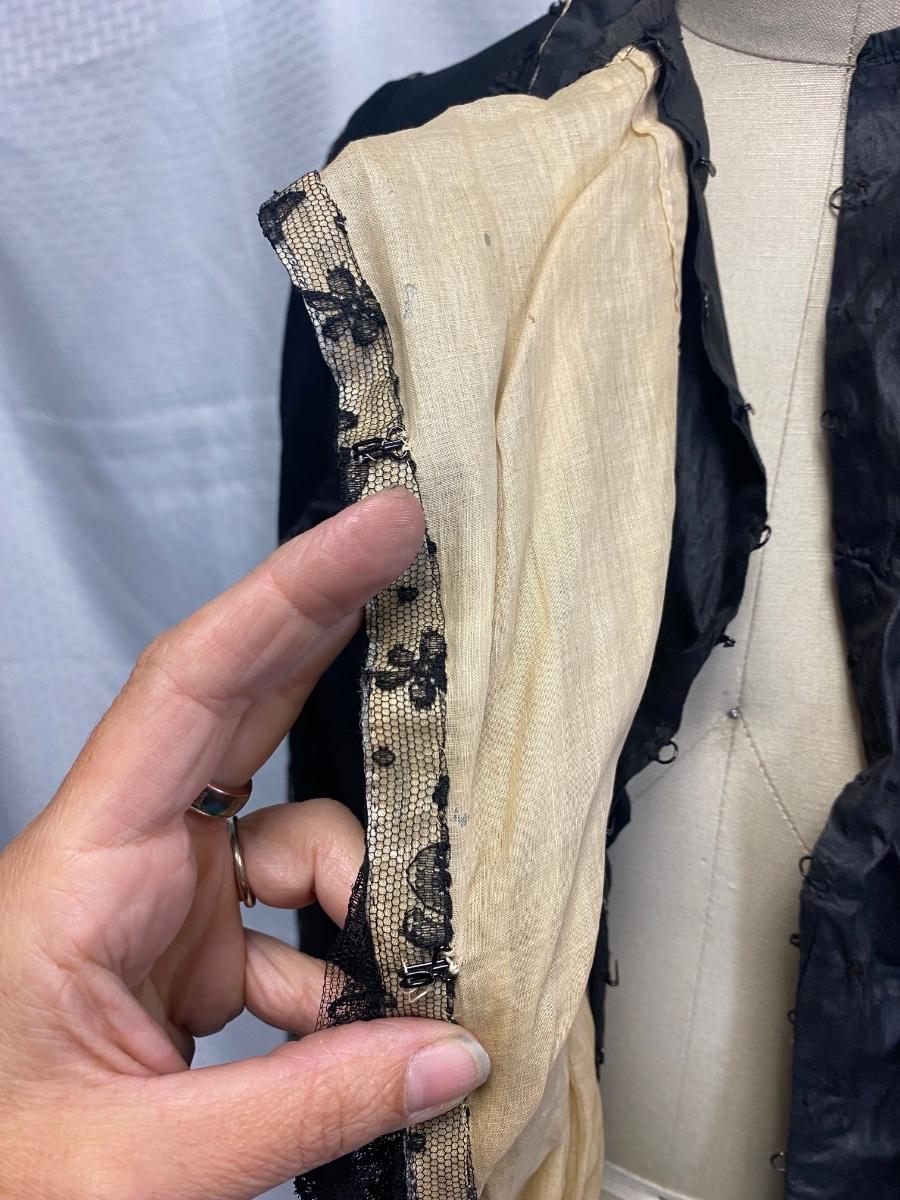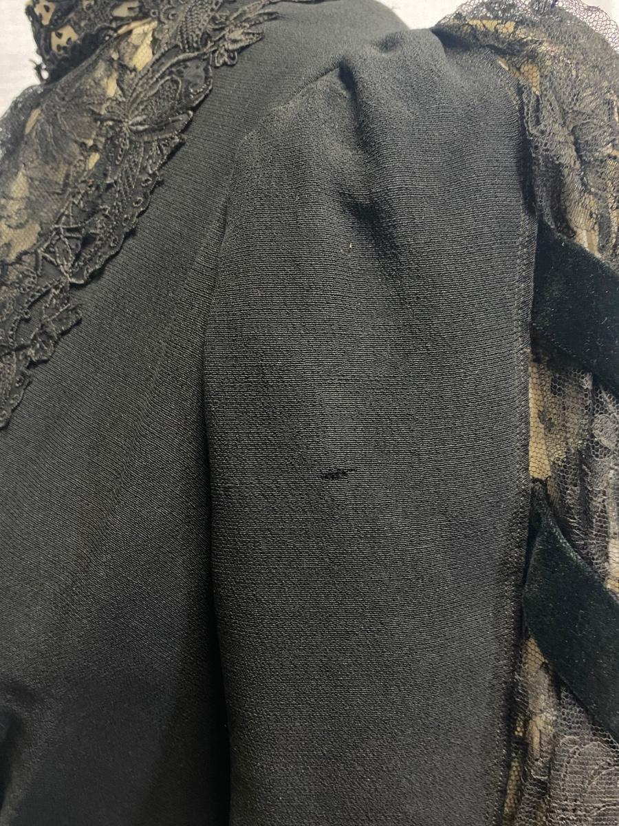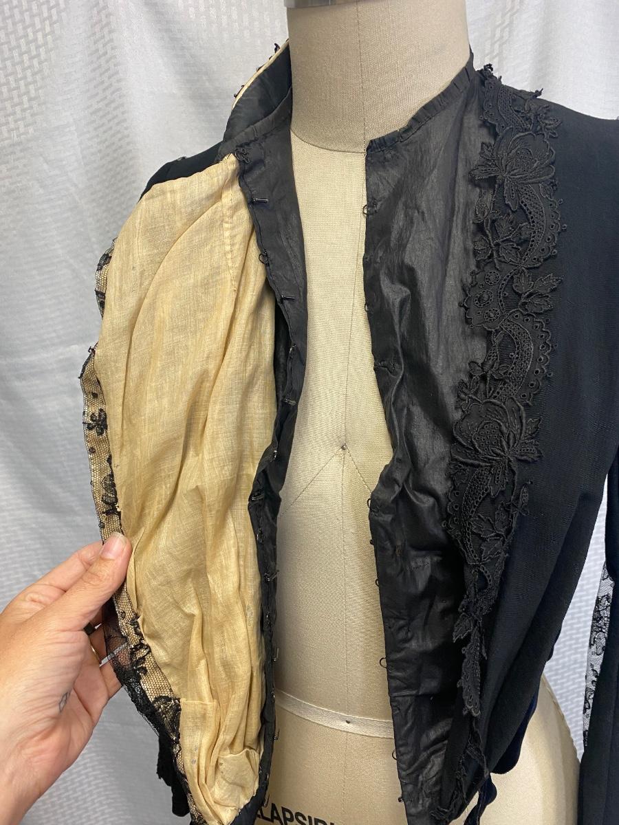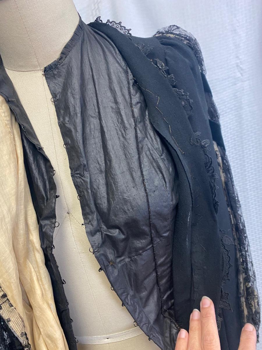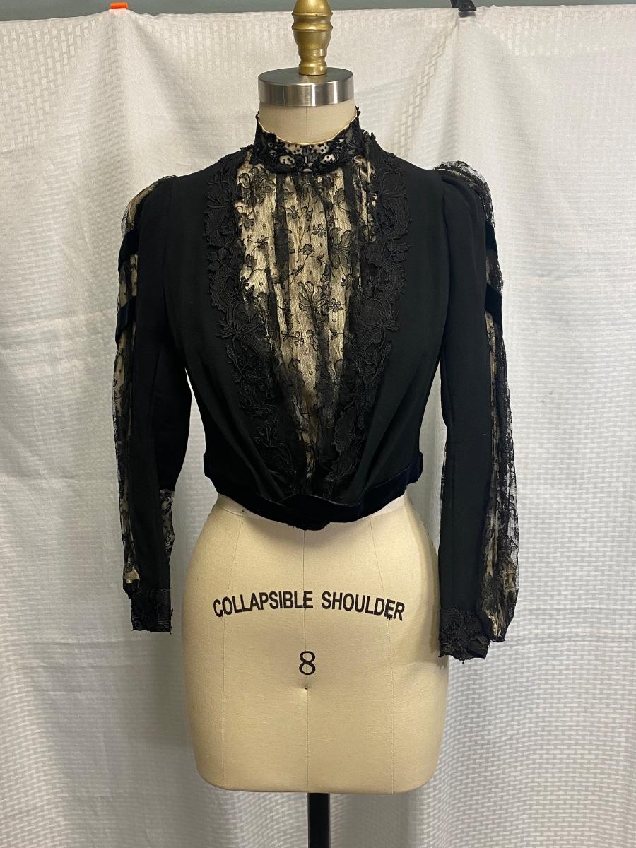 Antique Victorian Black Lace Mourning Gothic Long Sleeve Blouse Bodice Top. In overall good antique condition, no major damage, some very minor holes. Black lace with white cotton contrast underneath. Fits the size 8 mannequin well. Hook and eye closures may need some replaced or restitched. In wearable condition if worn with care.