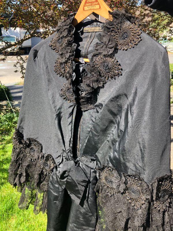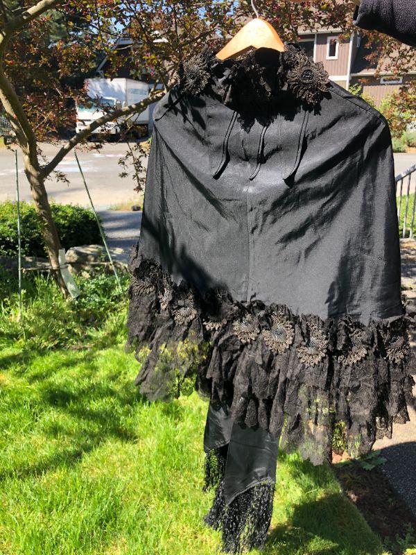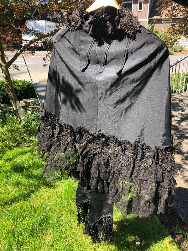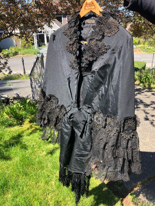 Antique Victorian era black ladies shawl wrap made by Arnold Constable & Co New York. Belonged to the estate owner’s (she’s aged in her 90s) grandmother. In very good condition, was kept stored away in a dark closet.