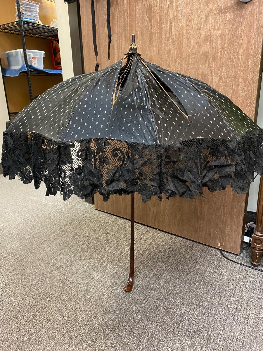 Antique Victorian Black Silk & Lace Mourning Parasol Umbrella. Opens and closes but the material is fragile and torn. Has a name plate on the handle. Natural wood handle.