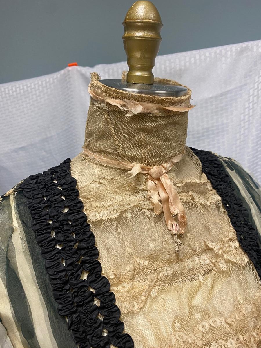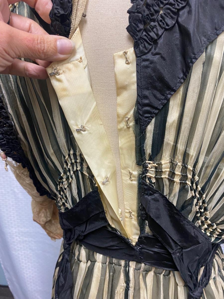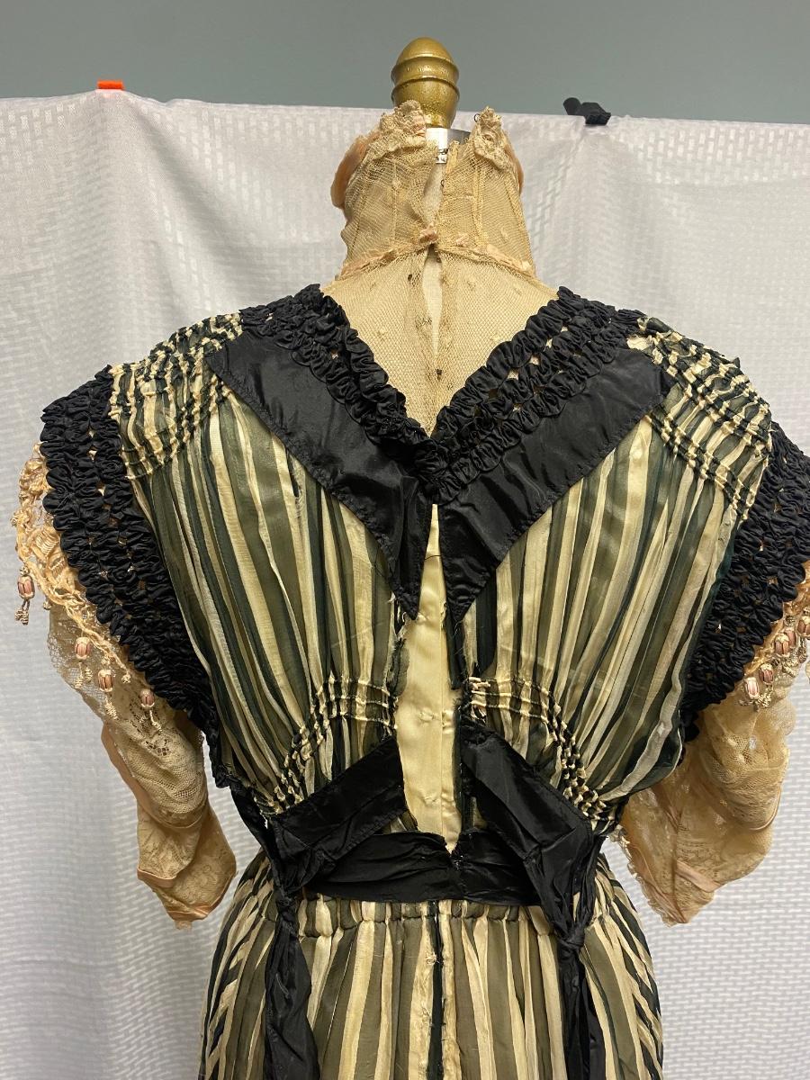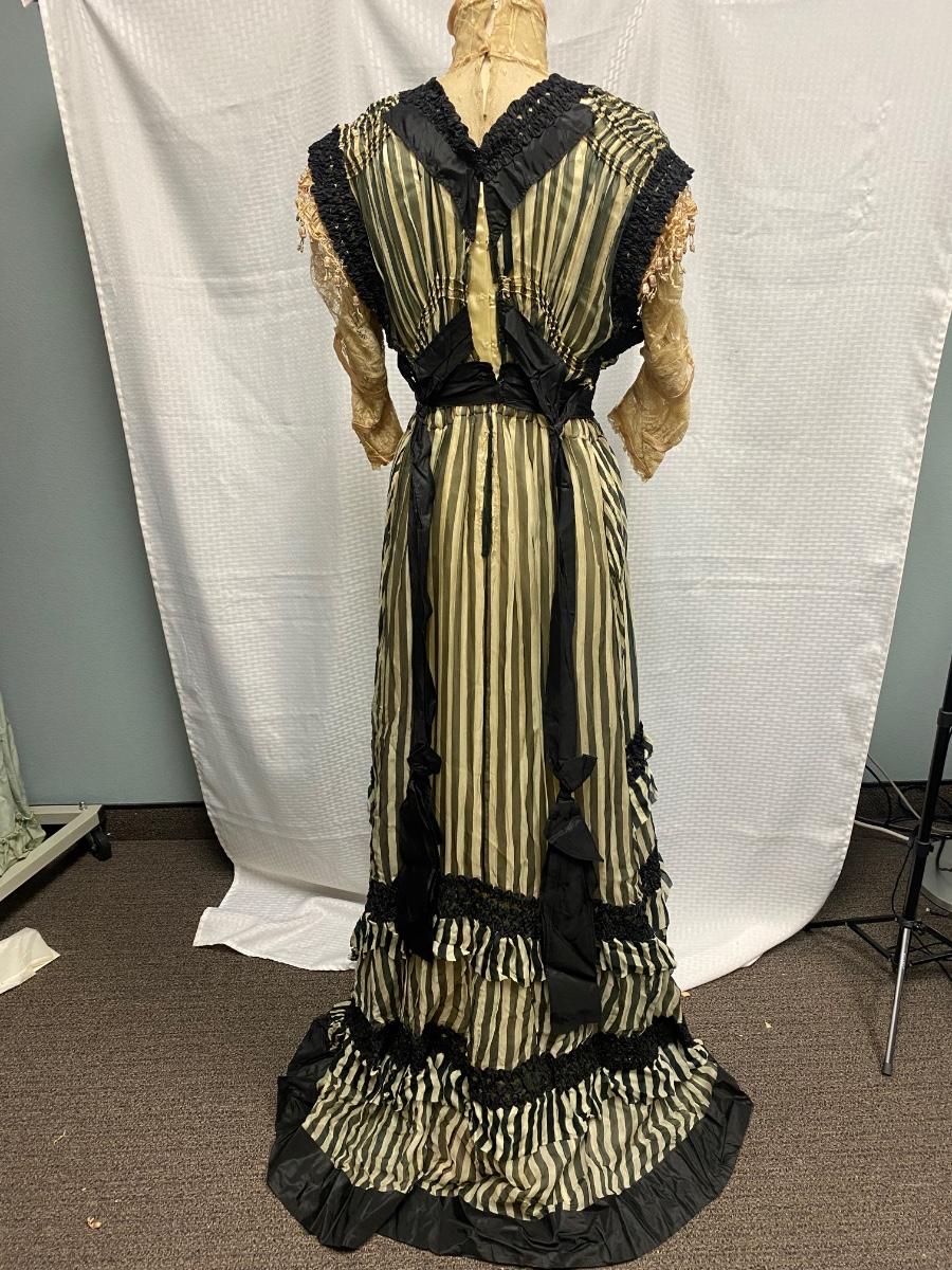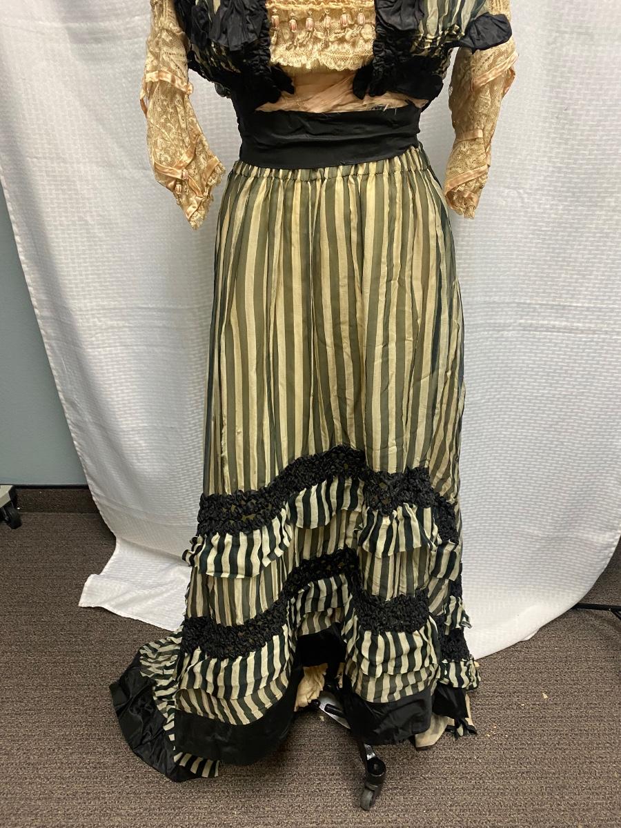 Antique Victorian Black & White Striped with Pink Accents Fancy Gala Opera Dress. One piece dress. Does not fit the size 8 mannequin, a little small through mid-section. There is discolor from age and the fabric is delicate, will tear if not handled carefully. No major holes or stains. A lot of ruffled details. Great for reference or pattern for reproduction.