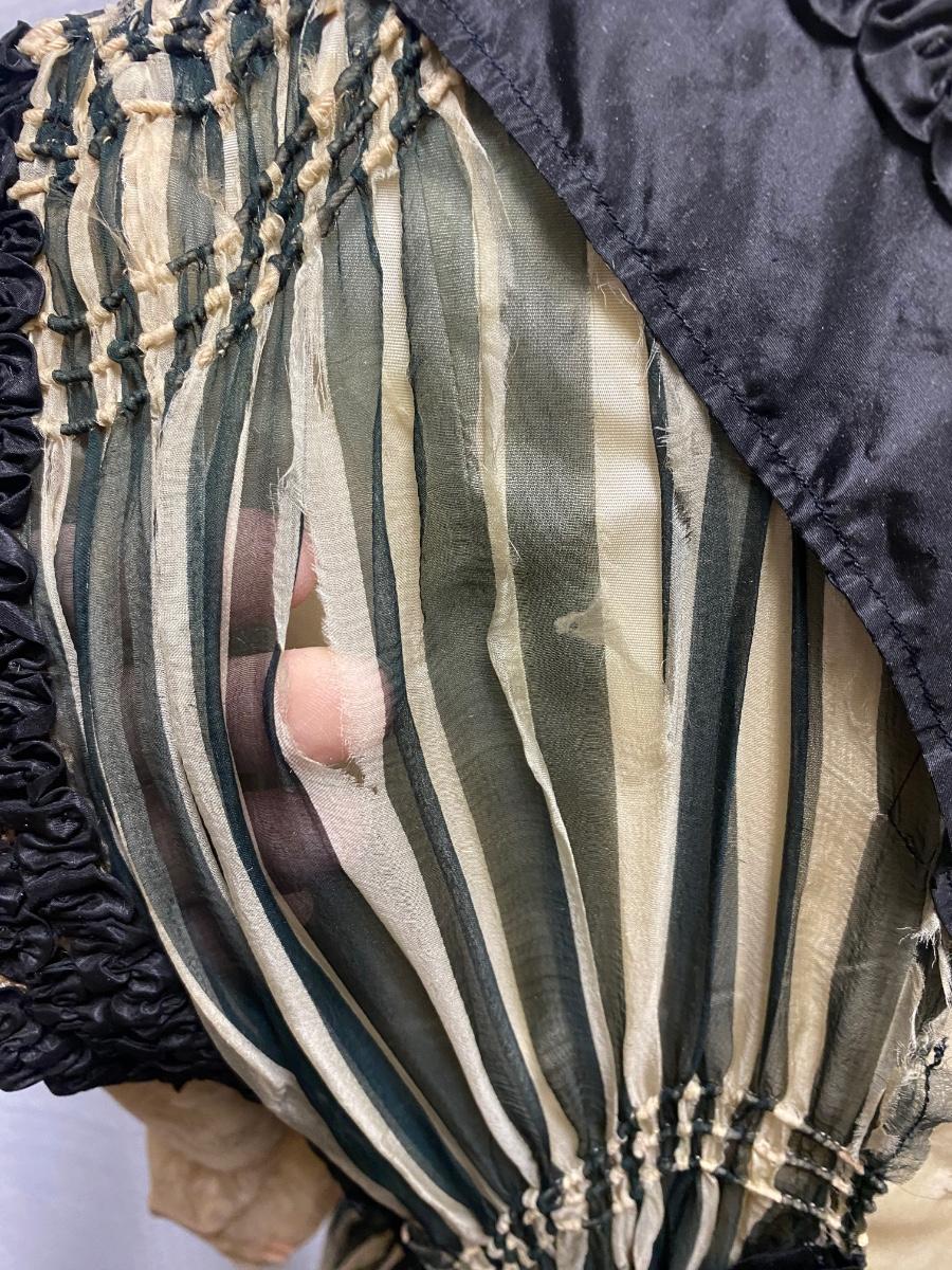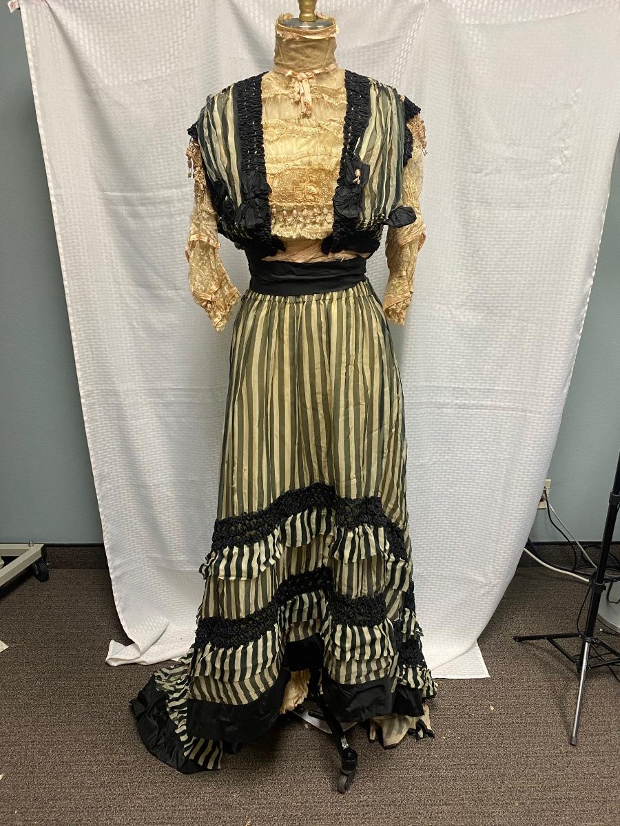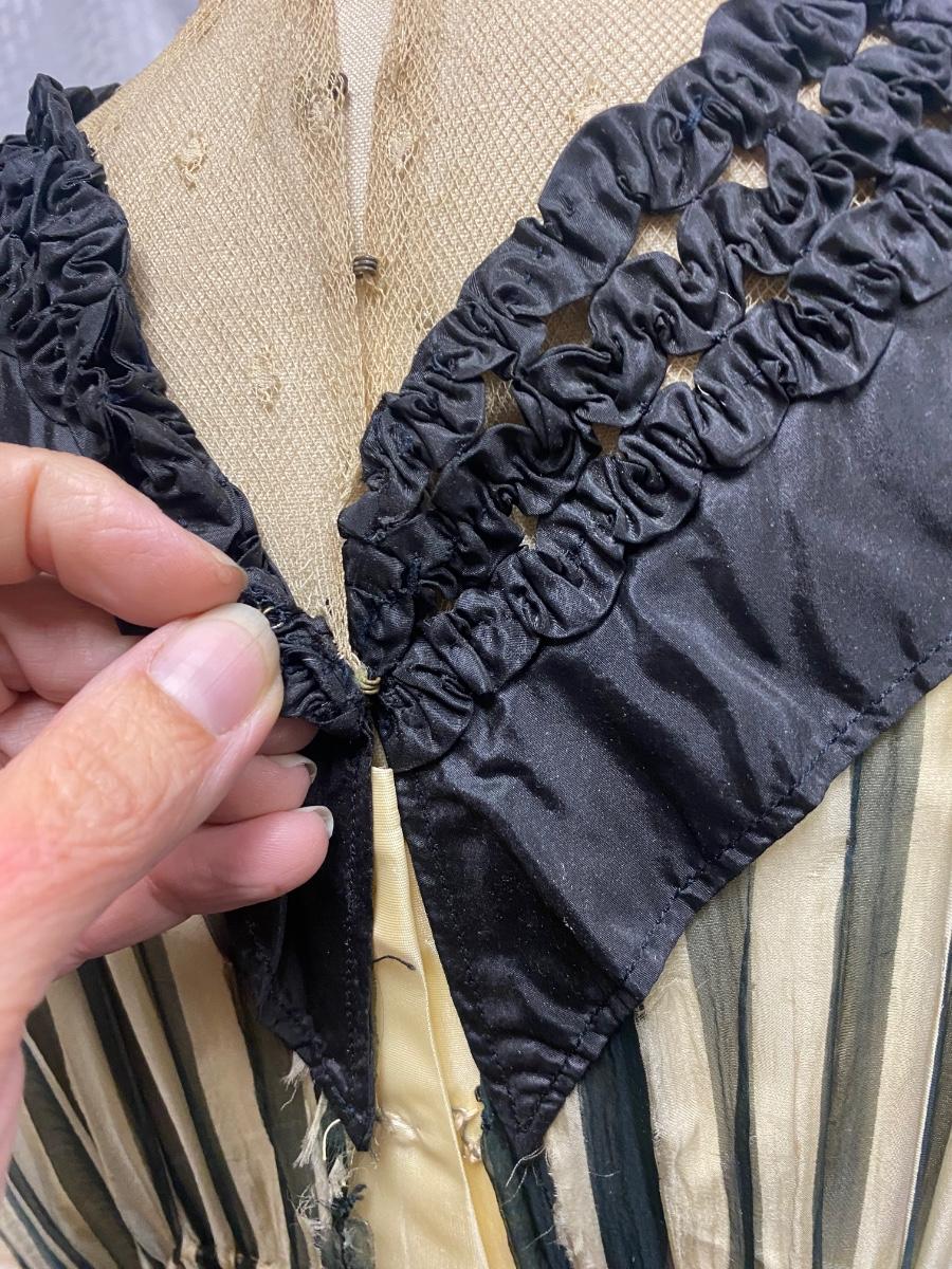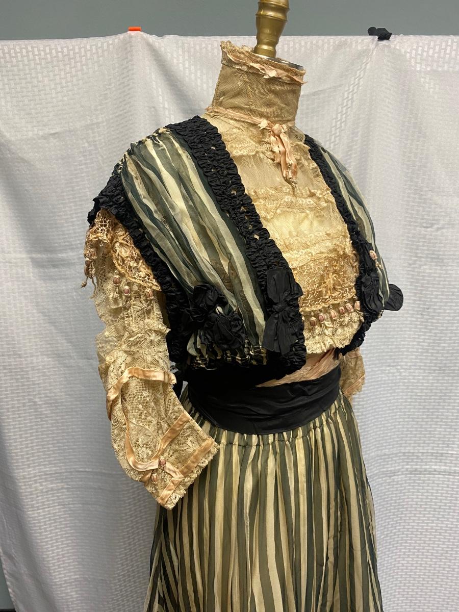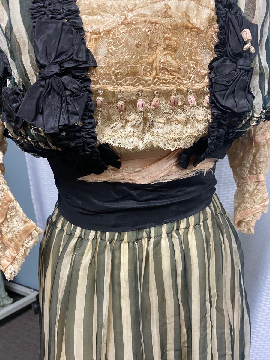Antique Victorian Black & White Striped with Pink Accents Fancy Gala Opera Dress. One piece dress. Does not fit the size 8 mannequin, a little small through mid-section. There is discolor from age and the fabric is delicate, will tear if not handled carefully. No major holes or stains. A lot of ruffled details. Great for reference or pattern for reproduction.