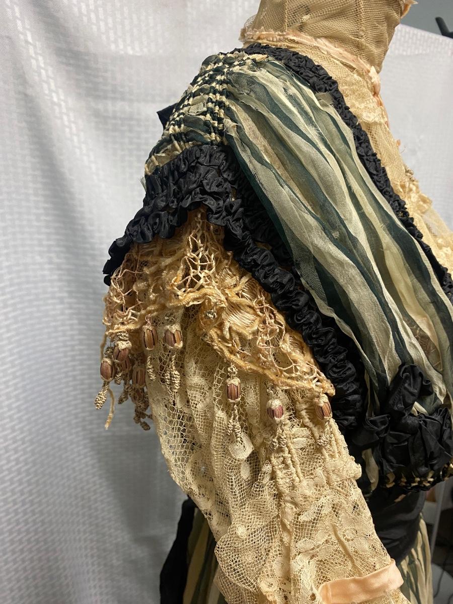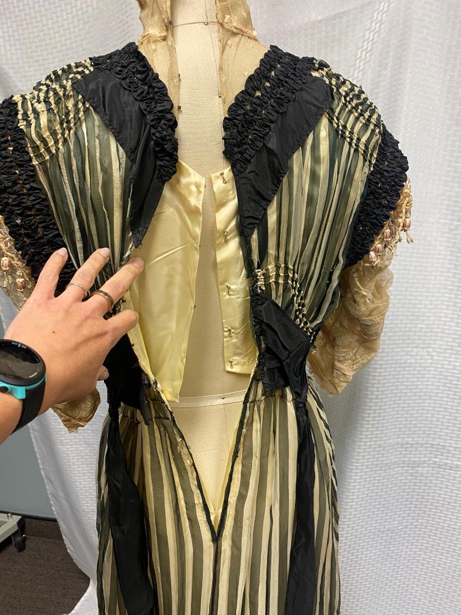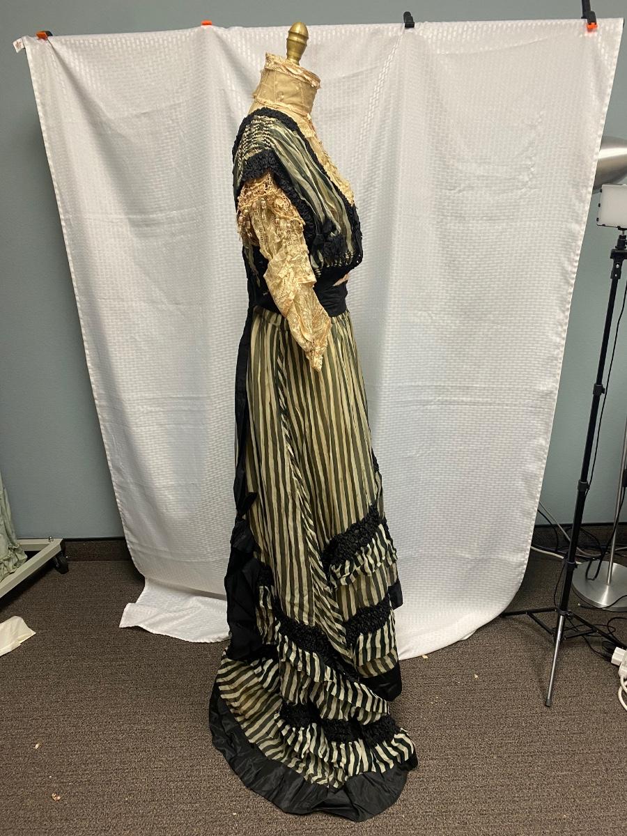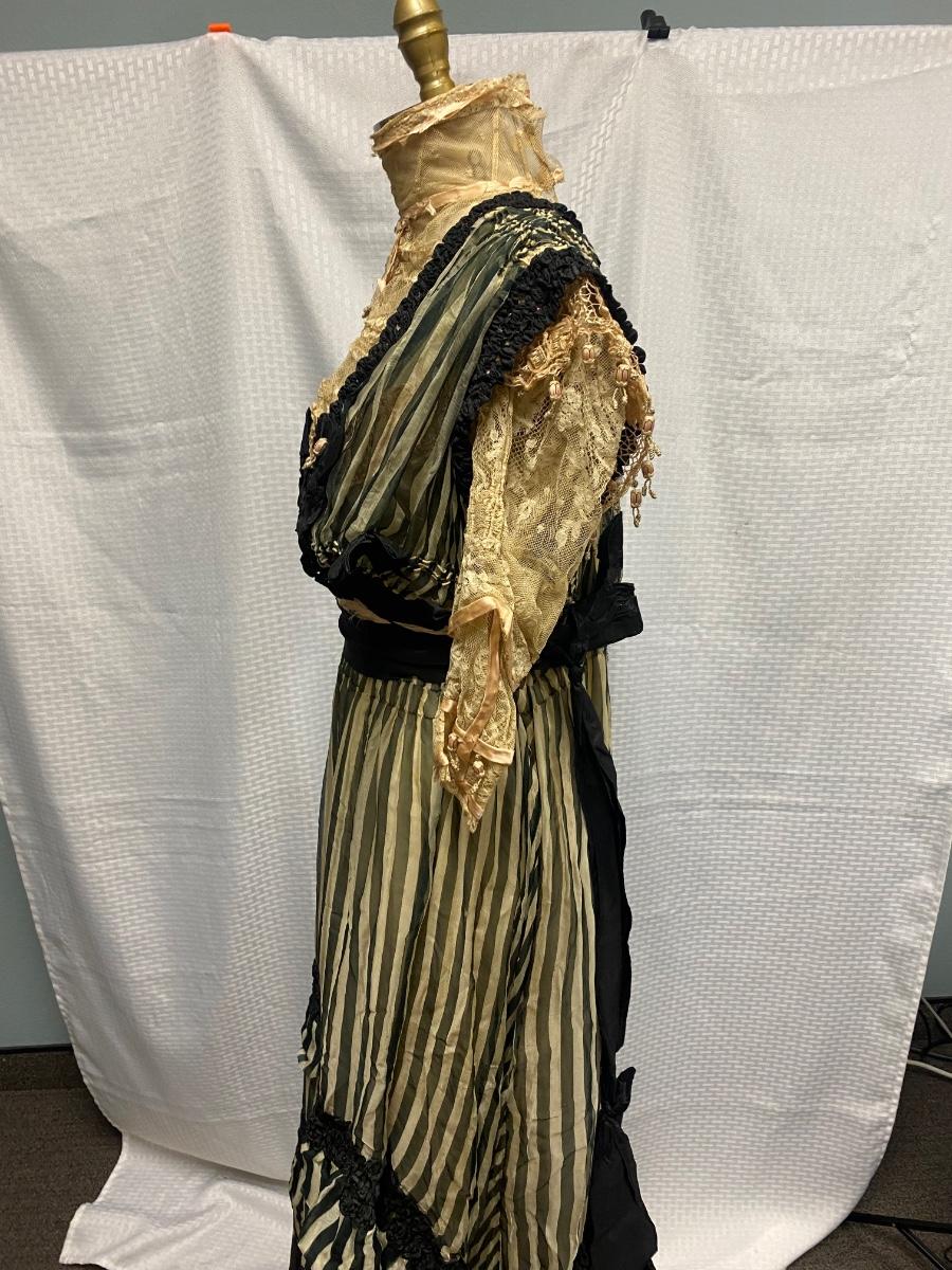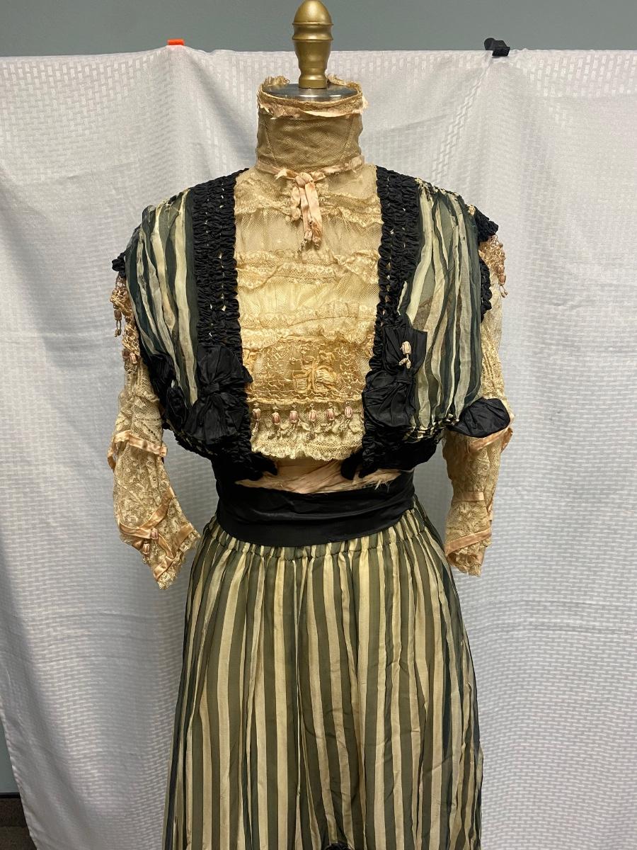 Antique Victorian Black & White Striped with Pink Accents Fancy Gala Opera Dress. One piece dress. Does not fit the size 8 mannequin, a little small through mid-section. There is discolor from age and the fabric is delicate, will tear if not handled carefully. No major holes or stains. A lot of ruffled details. Great for reference or pattern for reproduction.