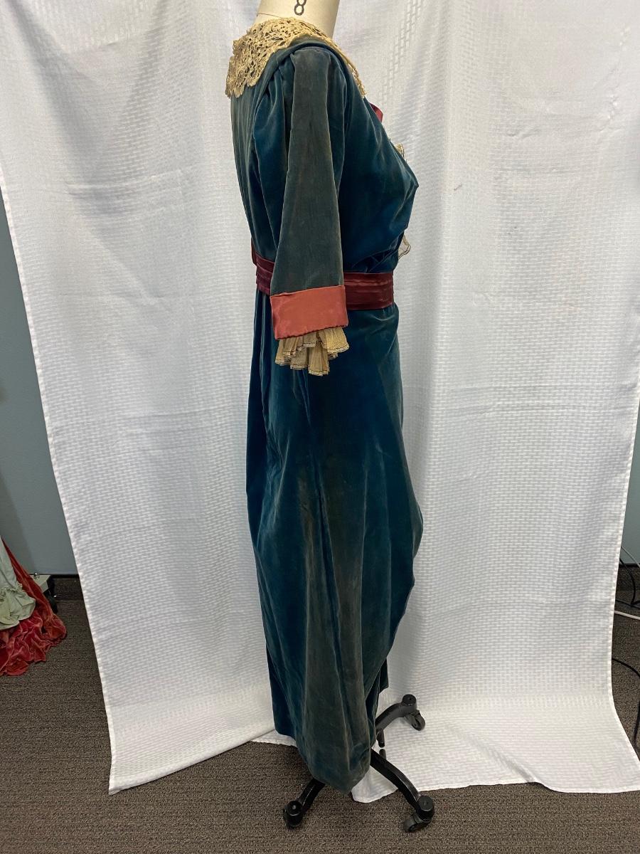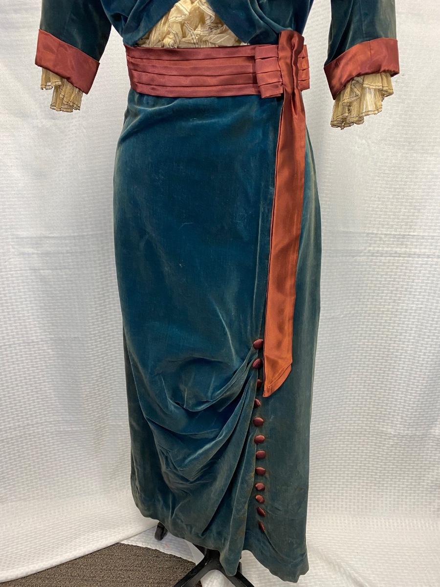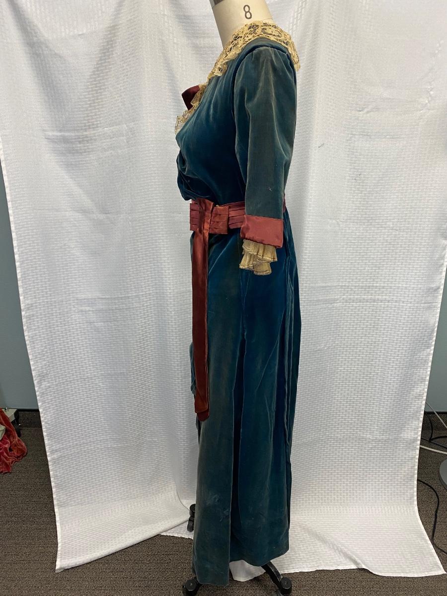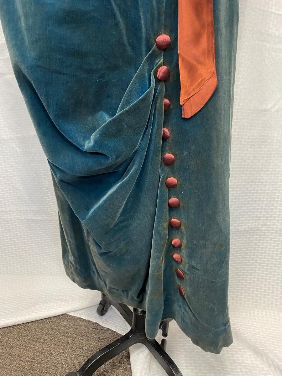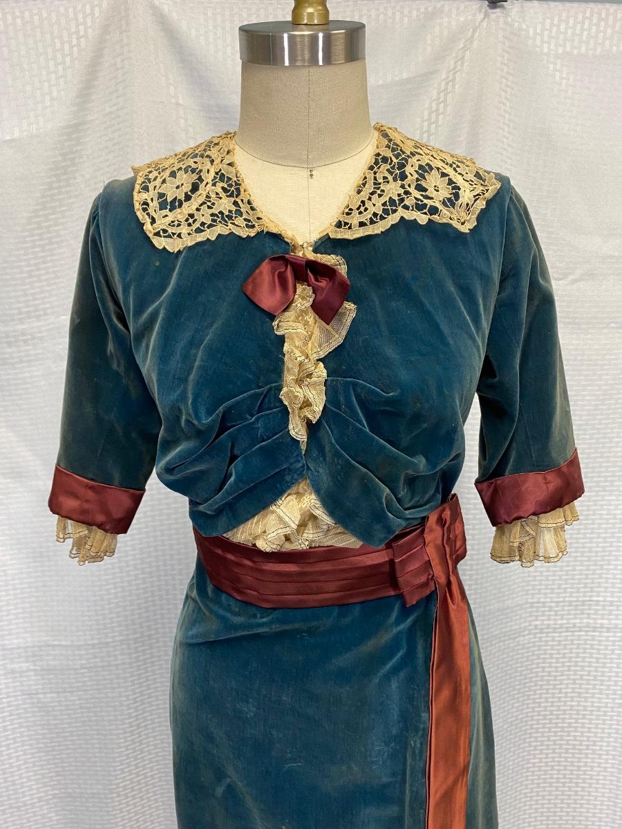 Antique Victorian Blue Velvet & Lace Short Sleeve Dress. Beautiful representation of early 1900s fashion. Fitted straight blue velvet with red ribbon & lace accents. A lot of hook and eye closure layers to the bodice with sewn in boning on the inner most layer. The dress does have slight discolor from age but is in overall good condition. Almost fits the size 8 mannequin, the torso of dress is smaller than the torso of mannequin. Inner lining material is a bit fragile from age, but one could possibly wear this dress if handled carefully or with a little repair of inside layers. Part of a large Victorian/ early 1900s clothing consignment we are currently auctioning.