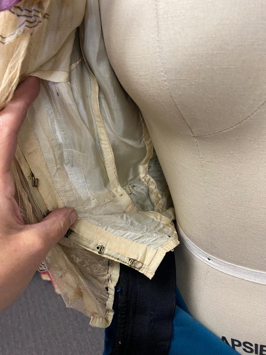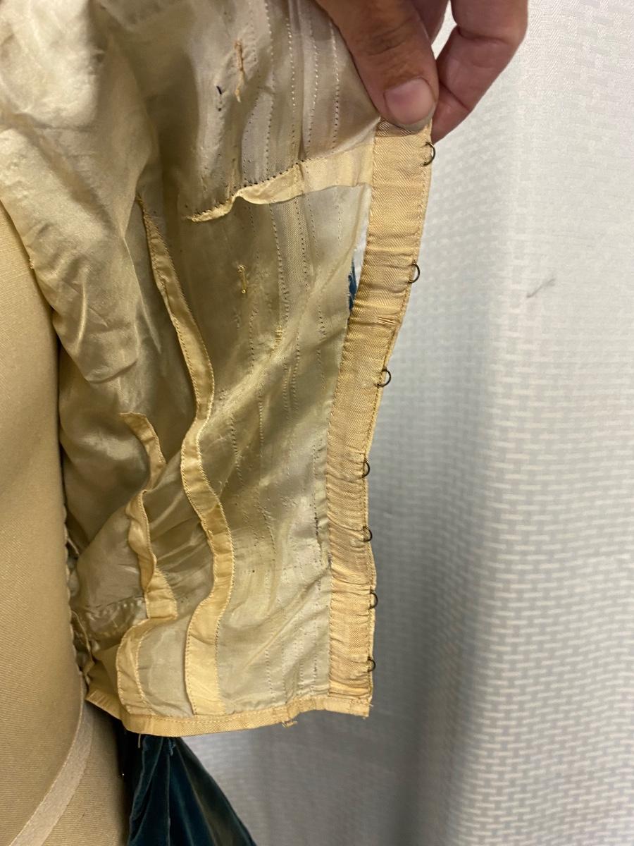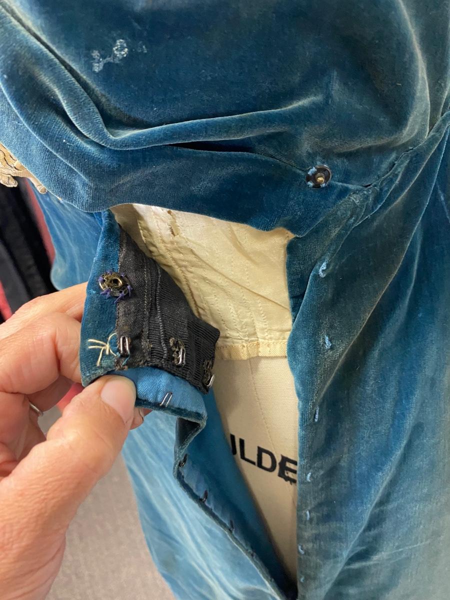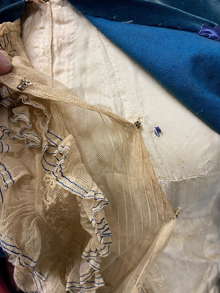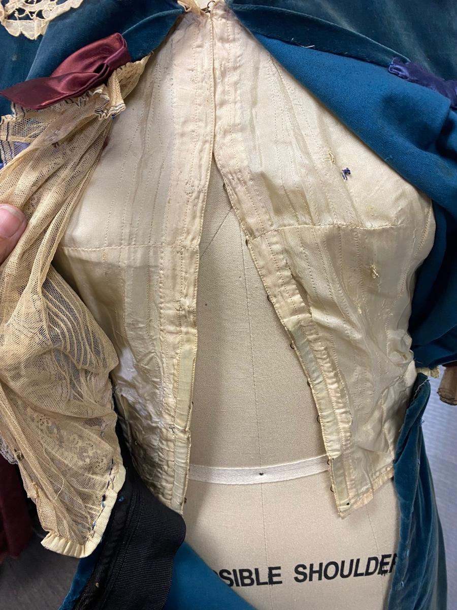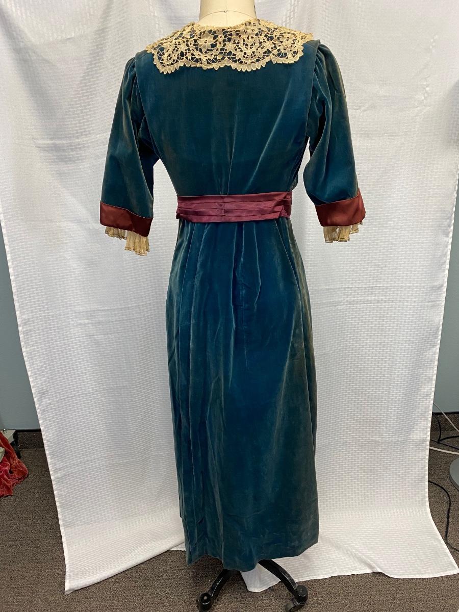 Antique Victorian Blue Velvet & Lace Short Sleeve Dress. Beautiful representation of early 1900s fashion. Fitted straight blue velvet with red ribbon & lace accents. A lot of hook and eye closure layers to the bodice with sewn in boning on the inner most layer. The dress does have slight discolor from age but is in overall good condition. Almost fits the size 8 mannequin, the torso of dress is smaller than the torso of mannequin. Inner lining material is a bit fragile from age, but one could possibly wear this dress if handled carefully or with a little repair of inside layers. Part of a large Victorian/ early 1900s clothing consignment we are currently auctioning.