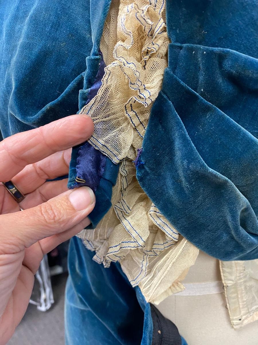 Antique Victorian Edwardian Blue Velvet & Lace Short Sleeve Dress