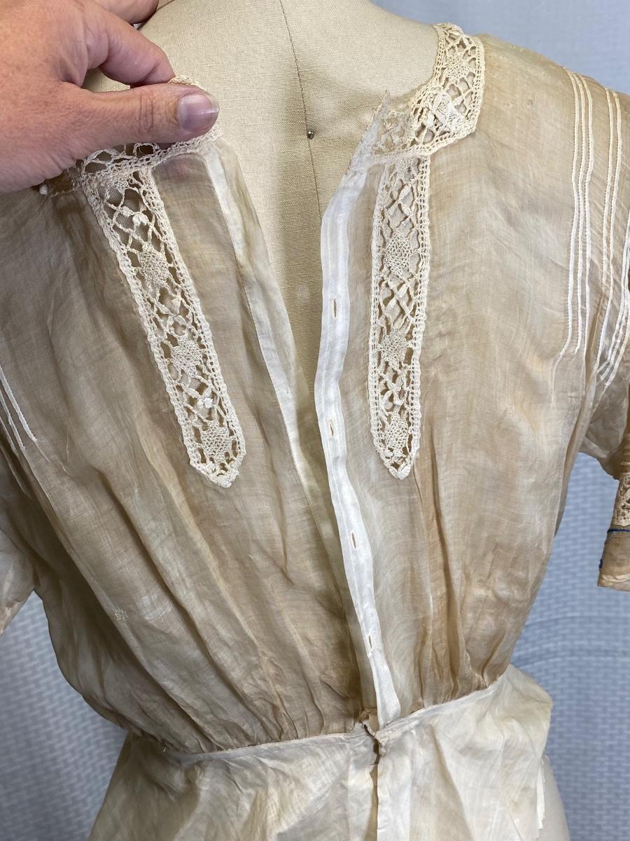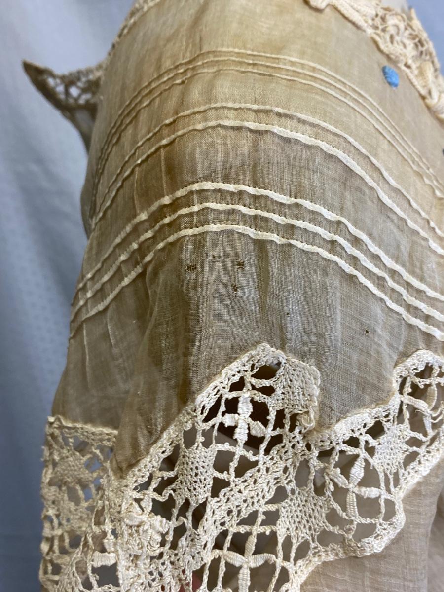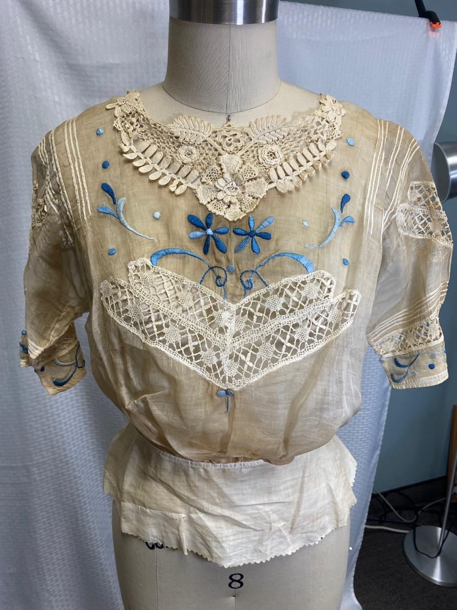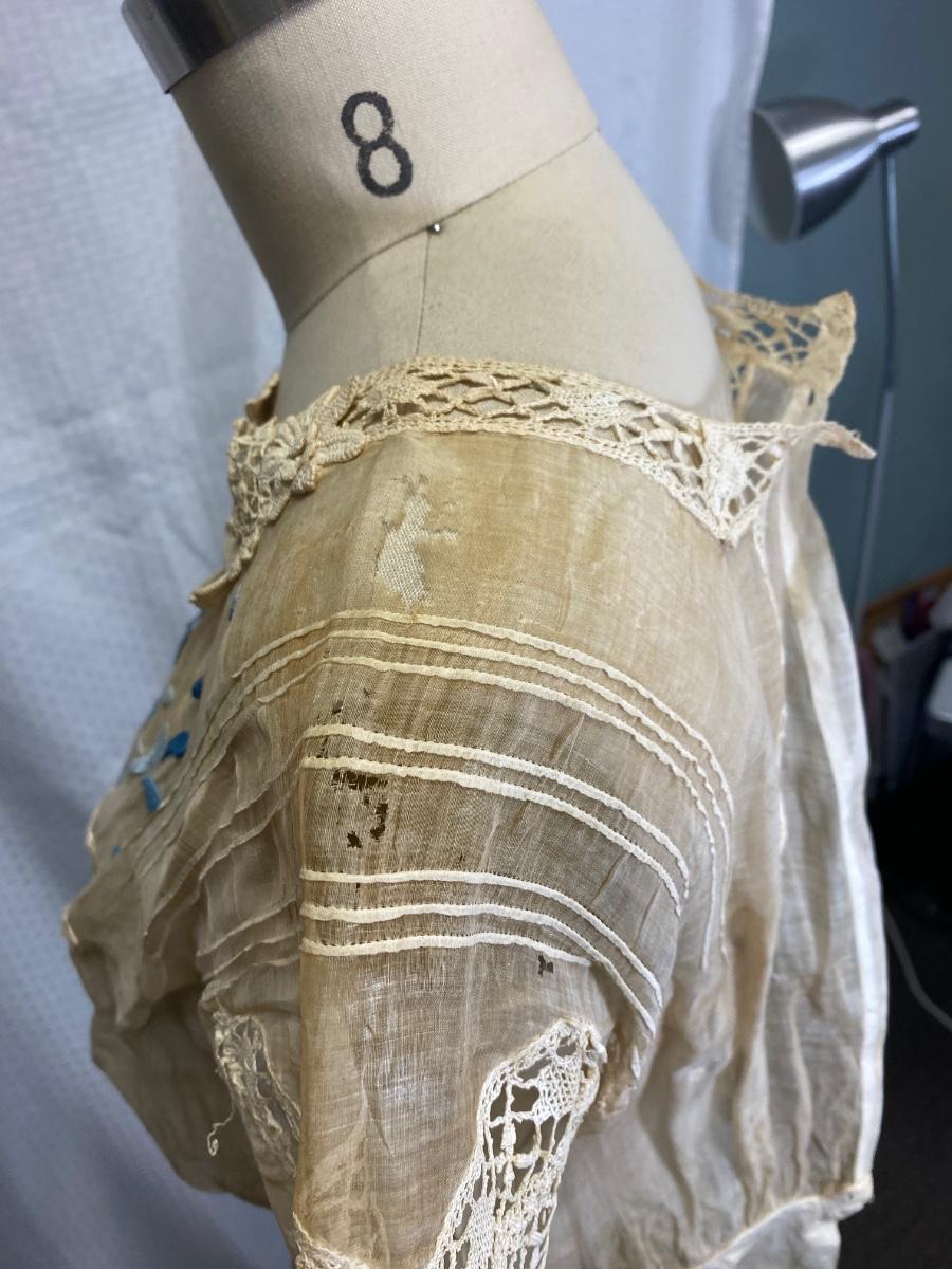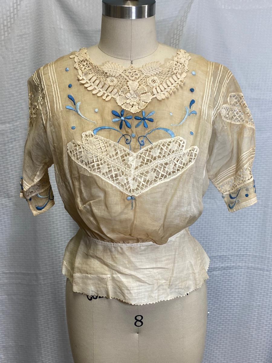 Antique Victorian Boho Cotton Blouse with Blue Floral Embroidery & Lace. There is discolor and some damage to the shoulder from age. It is missing the buttons from the back. Fits a size 8.