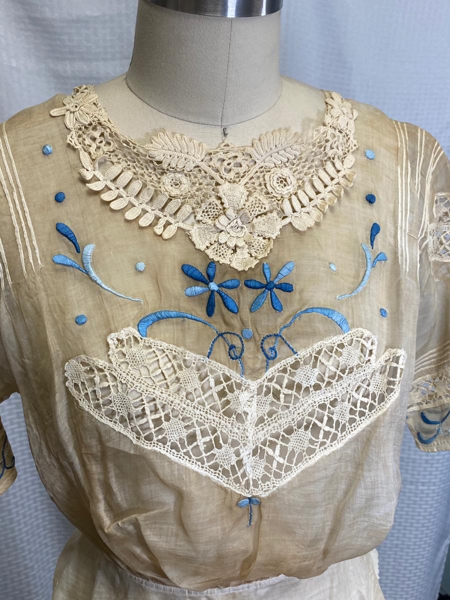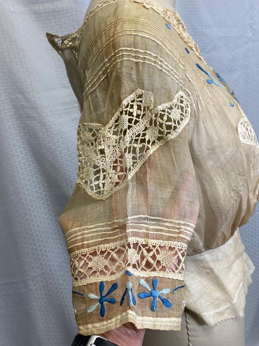 Antique Victorian Boho Cotton Blouse with Blue Floral Embroidery & Lace