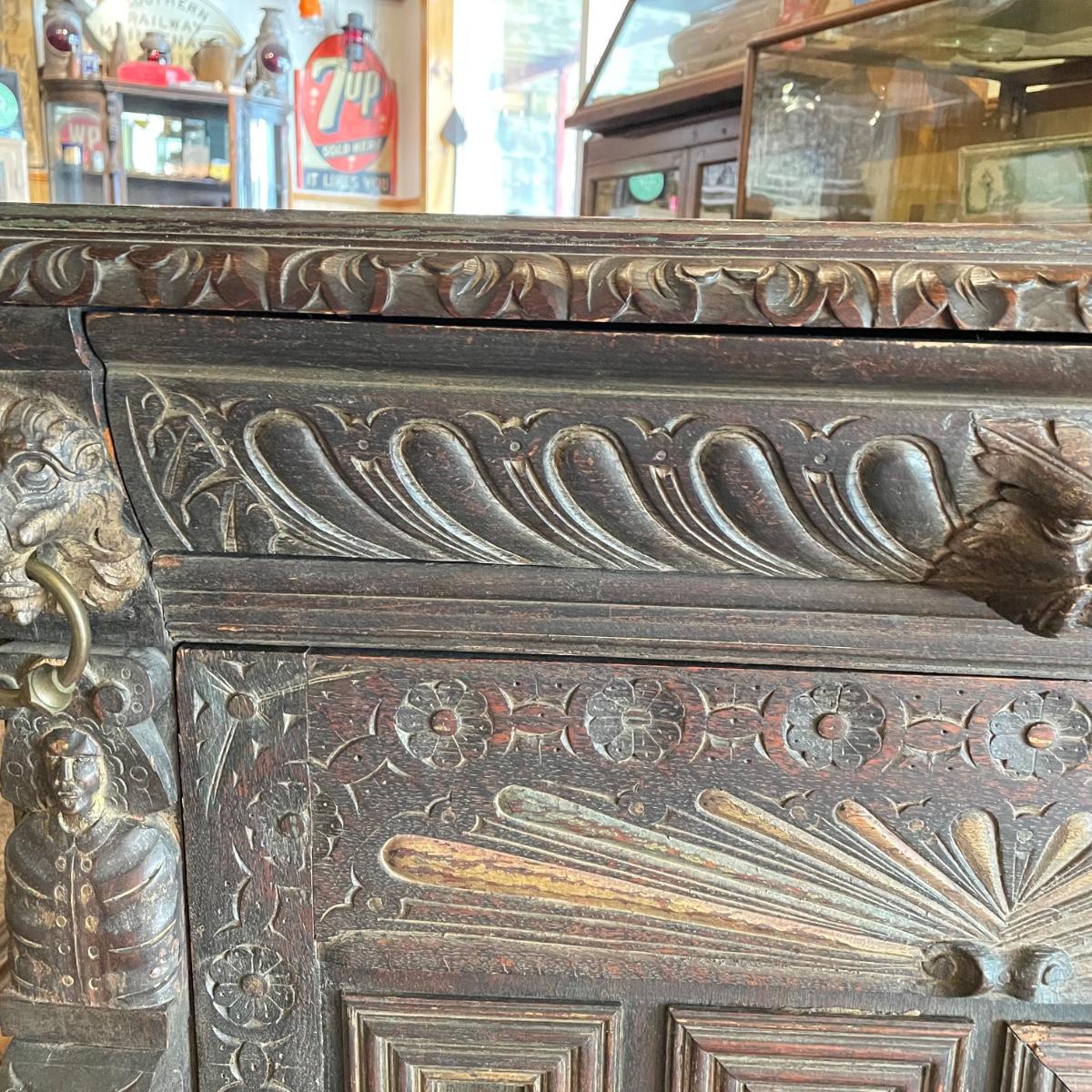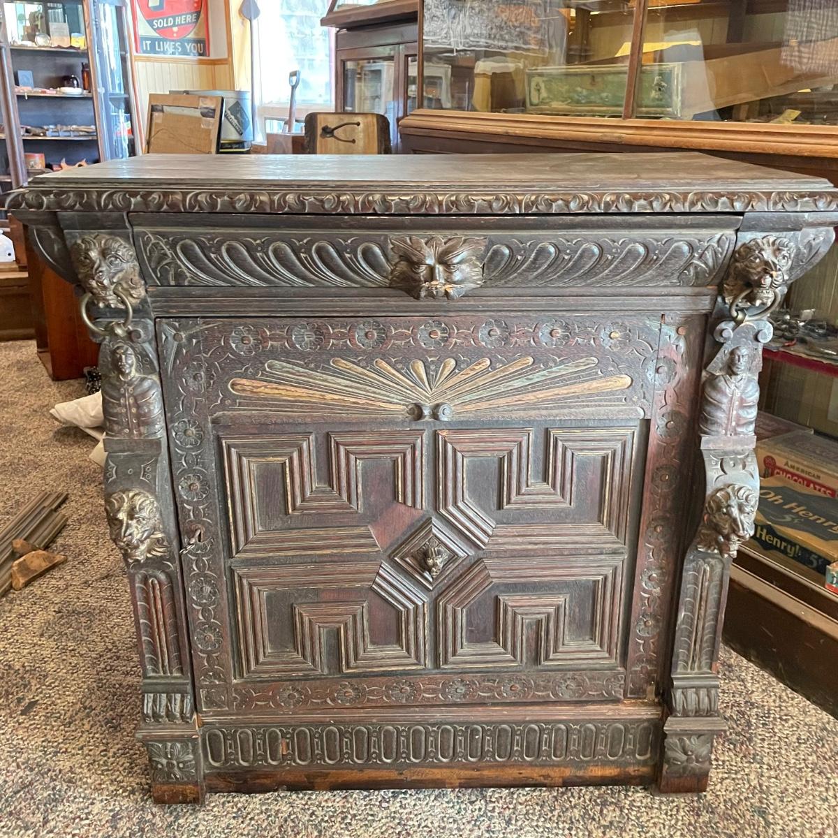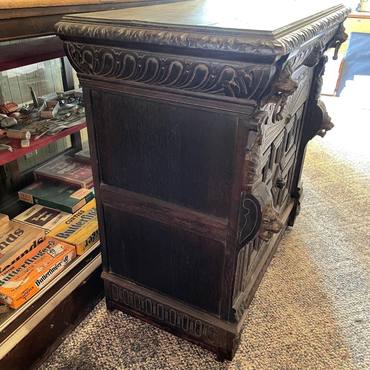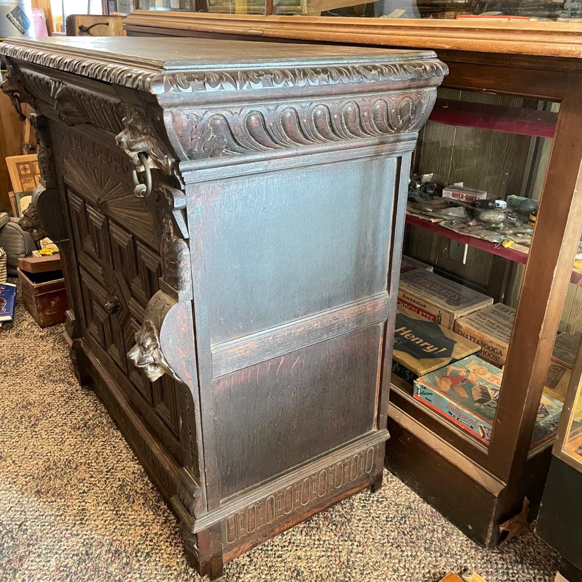 Antique Victorian carved oak hall cabinet appears to be from the late 19th century. Piece has carved moulding with one long dovetail drawer and an intricate carved cabinet door. Sides each have two Lion heads one each with brass pulls. Cabinet door has a key, but key is currently fixed in place and doesn’t appear to operate the lock. It is unclear if a lubricant would quickly fix. The top of the cabinet door has a muted colorful carving. Piece has minor chips and blemishes, but it’s in amazing condition for its age. Cabinet measures approximately 37.75” x 22” x 38.75”. See images. Please bring help to load. Local pick up only.
