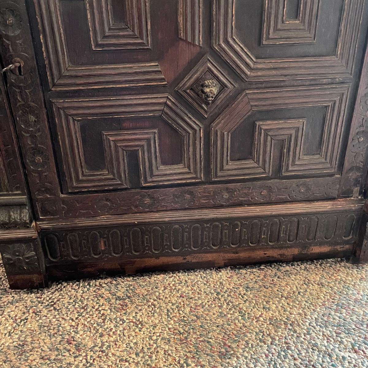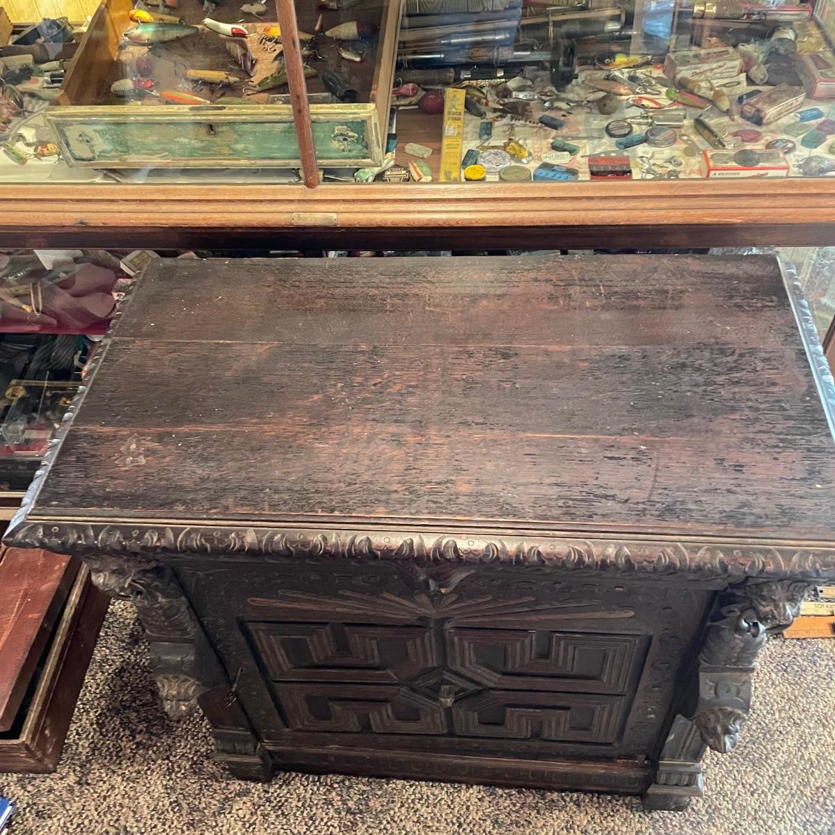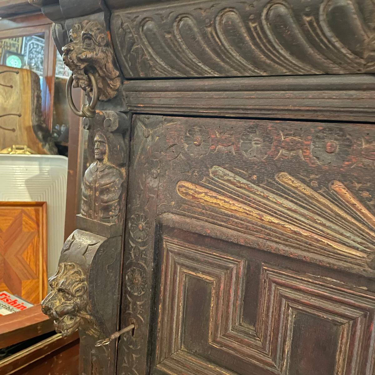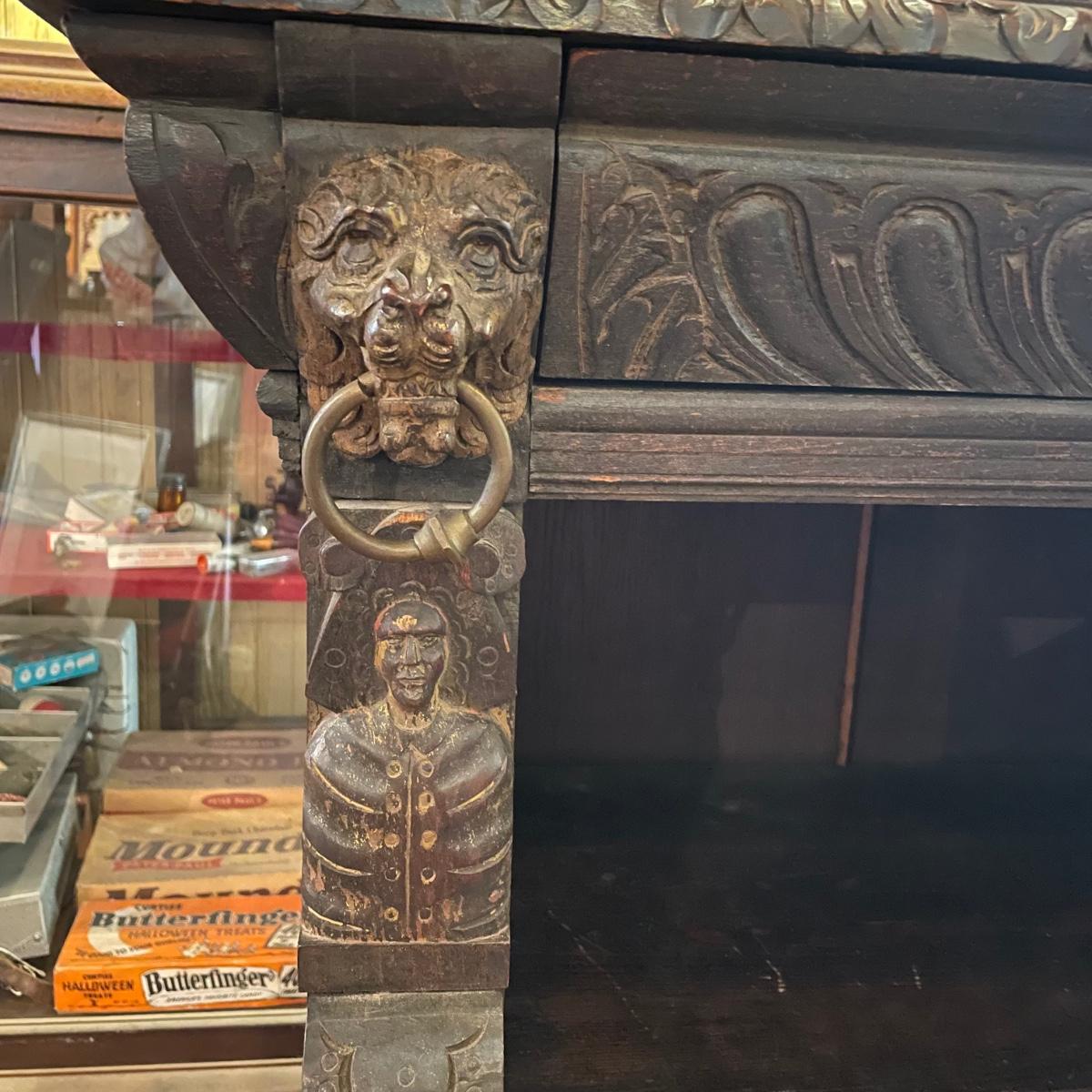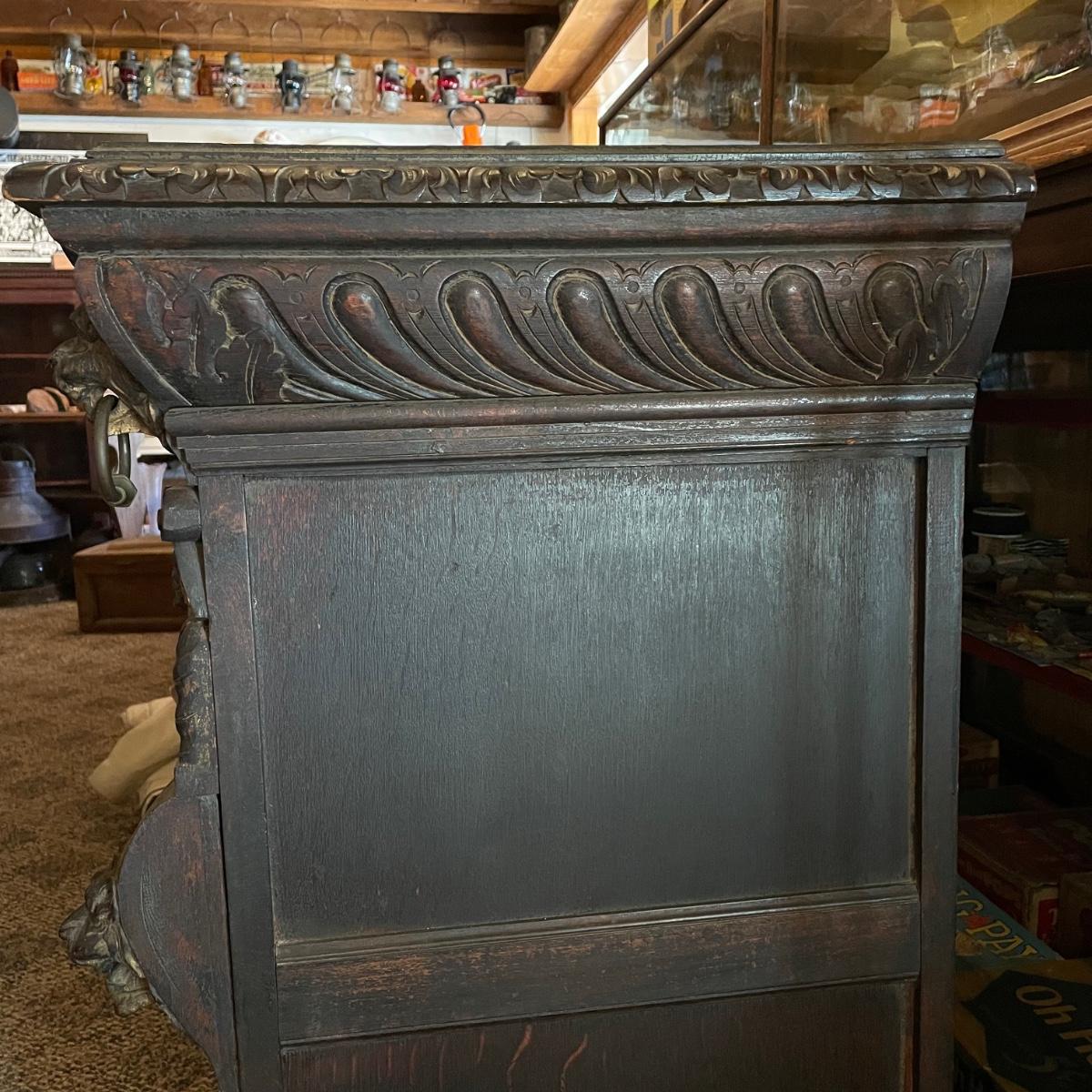 Antique Victorian carved oak hall cabinet appears to be from the late 19th century. Piece has carved moulding with one long dovetail drawer and an intricate carved cabinet door. Sides each have two Lion heads one each with brass pulls. Cabinet door has a key, but key is currently fixed in place and doesn’t appear to operate the lock. It is unclear if a lubricant would quickly fix. The top of the cabinet door has a muted colorful carving. Piece has minor chips and blemishes, but it’s in amazing condition for its age. Cabinet measures approximately 37.75” x 22” x 38.75”. See images. Please bring help to load. Local pick up only.